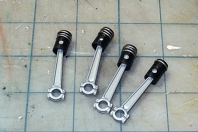 Harry P. Posted August 19, 2015 Author Posted August 19, 2015 Getting the rings installed... Since none of this will be seen when the engine is built, I'm not bothering to paint any of these internal parts. Pistons will stay black... and invisible on the finished engine. The wrist pins are a very tight fit. Too tight, as I shattered two pistons trying to force the pins into place. So I glued the shattered bits of piston together, and enlarged all the holes slightly. Should have done that in the first place...