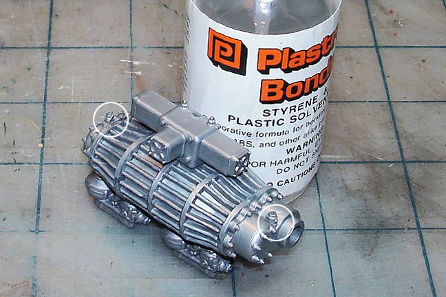 Harry P. Posted August 22, 2015 Author Posted August 22, 2015 I added scratchbuilt spark plugs made of aluminum tube and nuts from the kit. Pocher gives you extra hardware, so robbing the bag of nuts to use on the spark plugs won't be a problem down the road... I won't run out of nuts! And speaking of nuts and bolts... the front cover is supposed to be attached using only four screws, but in reality this piece is held in place with 12 bolts... so I sliced 12 "bolt heads" from hex-shaped styrene rod and glued them to the front cover (after gluing the cover in place)...