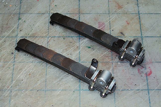 Harry P. Posted August 30, 2015 Author Posted August 30, 2015 Up front this Bugatti had a fairly typical suspension setup... solid axle and leaf springs. But in back they went a different way. Instead of the typical leaf spring setup, they went with quarter-elliptical springs, mounted "upside down" to the way leaf springs are typically mounted. Here are the parts for one of the rear springs. Spring leaves are real spring steel... Here are the completed rear springs...