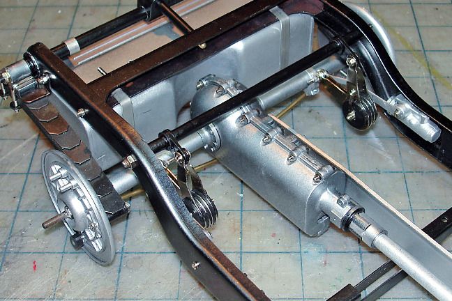 Harry P. Posted August 30, 2015 Author Posted August 30, 2015 The frame on this kit is metal... very stiff and sturdy, and when you bolt it together it's square and flat, unlike the soft, wiggly plastic frame on my Pocher RR woody. The metal frame is a much better way to go. Lots of detail on this one, including all of these little pulleys located on the inside of the frame rails. Cars of this era had mechanical brakes (not hydraulic), and different manufacturers had different approaches as to how best to design a braking system. My RR woody has an incredibly complex rat's nest of rods and levers to make up the braking system, but on the Bugatti the brakes were actuated by cables. These pulleys will ultimately be threaded with brake cables. A much cleaner and simpler approach than Rolls' way of doing things.