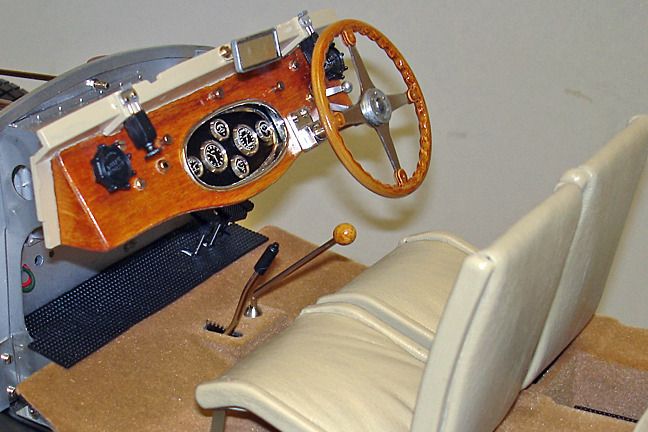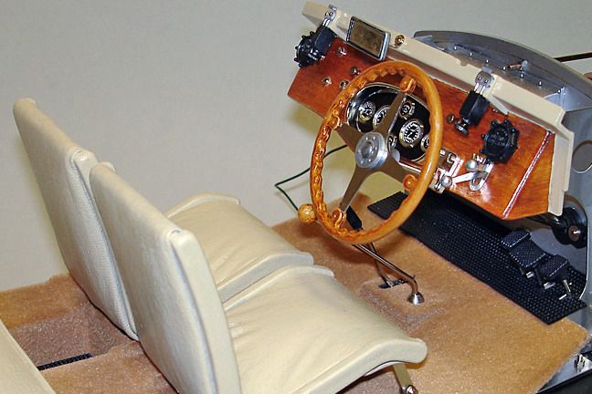 Harry P. Posted September 20, 2015 Author Posted September 20, 2015 The floorboard comes flocked, so you're sort of stuck with the color of the "carpeting" as is. The kit supplies upholstery material for the seats and inside door panels, and every piece is diecut, which is nice... but the material itself is too thick and too stiff to go around tight corners and compound curves. Plus the "leather" texture is more like 1:1 scale, so it looks pretty clunky. I used my own material to upholster the seats (the stuff I always use, a soft, stretchy vinyl that has a pretty much in-scale "leather" look to it). The material itself is a very dark brown, but after I upholstered the seats I painted it a light "buff" color. I did use the kit's foam seat cushions, though... To get the wood look on the steering wheel rim and shift knob, I first painted them the same color that I used on the seats (an acrylic craft paint), then "painted" the wheel rim and shift knob with oil-based wood stain. The stain sort of soaks into the acrylic paint, and the result is a very nice "wood" look. Because the stain is oil-based it takes forever to dry, so I used the dehydrator to speed things up... That's it for the Bugatti for the time being. Now back to my RR woody...