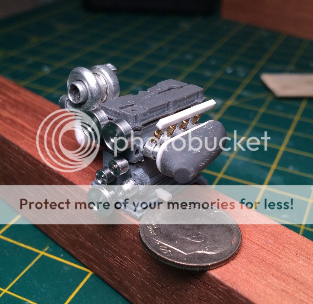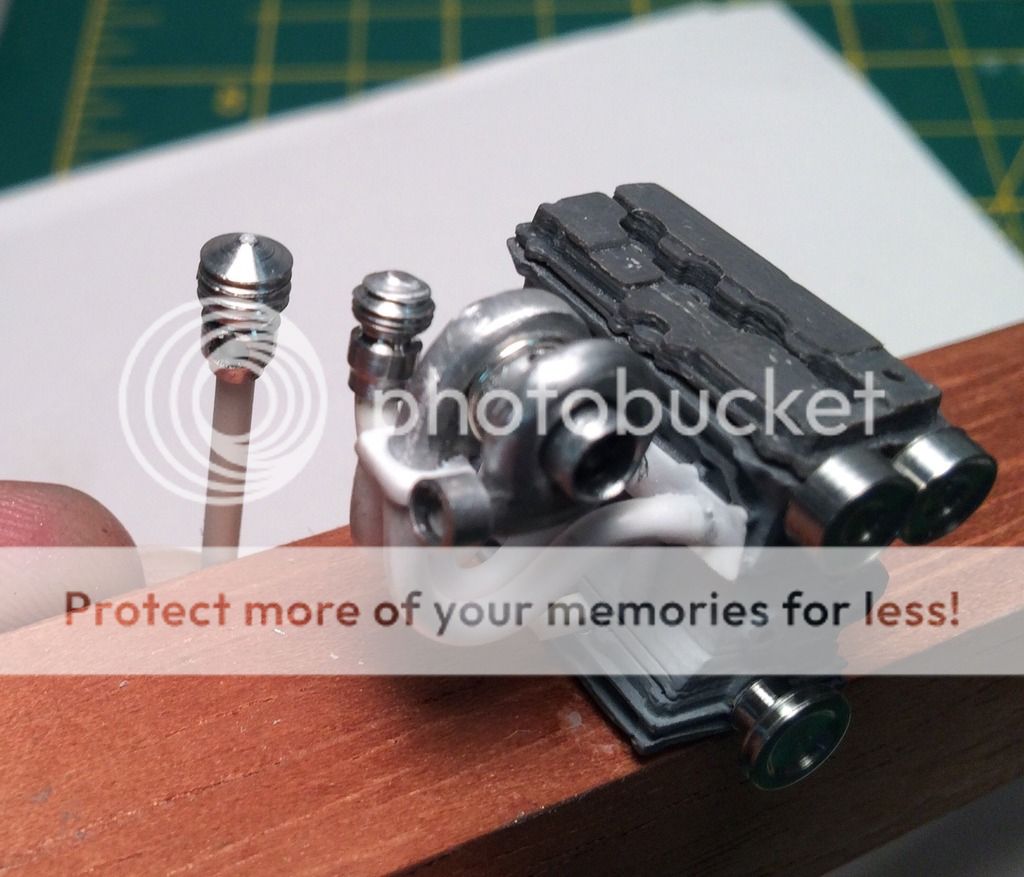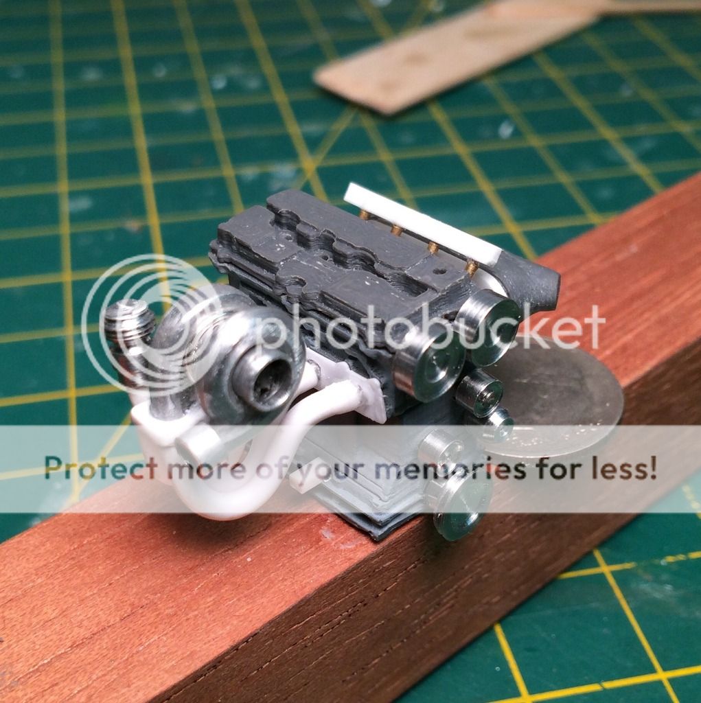 Impalow Posted January 8, 2016 Author Posted January 8, 2016 Thank you all for the comments and following along... This build is definitely a learning process for me, between the 3d printer, the cutter, and now the lathe I am trying something new every time I venture into my model shop. Which makes this one extra exciting for me. Over the last couple days I made a ton of metal shavings and scraps, 2 wastegates (first one was too big) , and the timing belt drive. I can honestly say at this point i love having the lathe...I went "cheap" on this with the harbor freight one, while granted its not as nice as the Sherlines, its getting the job done.. and for how often its used I could better justify the harbor freight price. Still need to get some other tools and bits for it, but its more accurate than I expected, time will tell on the durability side. Wastegates: Next up was the intake, I wanted something like this.. So i modeled it up in the 3d program, and sent it off to the printer. To me, shapes like this play more into the 3d printers strengths, something that would take a long time to accurately scratch build.. or carve out of a block of styrene. I then scratchbuilt the intake runners and plate.. The intake runners in the photo are the position posts, they will get some sleeves overthem to increase the diameter, and provide a location for the injectors. Intake and belt drive mocked up in place: Aluminum is on the way for the wheels...excited to get some paint on this engine soon.