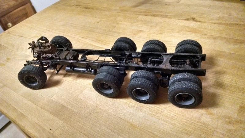 KJ790 Posted September 14, 2015 Author Posted September 14, 2015 (edited) KJ is there any chance we could get a better look at just how you did that lift axel? Great work so far I like it Sure. Right now it is kind of a cheater lift axle because I am cheap and didn't want to buy a nice resin one. I used the suspension from a snap tight 359 peterbilt, and cut the axle off of it. I shortened the air bags slightly to get the height I wanted on the axle. Then I took some styrene tube and heated it up to make it into a "U" shape. I glued it all together, then glued it all to pieces of angle, which I glued to the frame. Then I added some brake chambers. I still have to make parts for the front near the suspension pivot to house the springs that would hold the axle up when the air is out of the bags. It's not perfect, and not accurate, but it will look alright on a shelf. Edited September 14, 2015 by KJ790