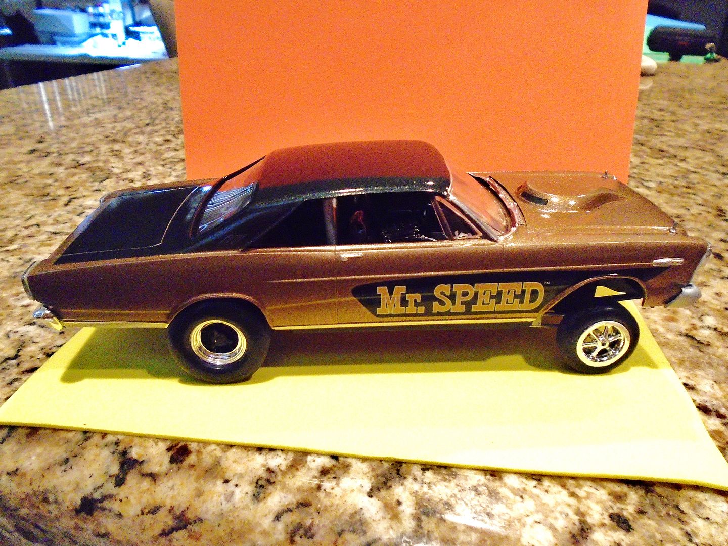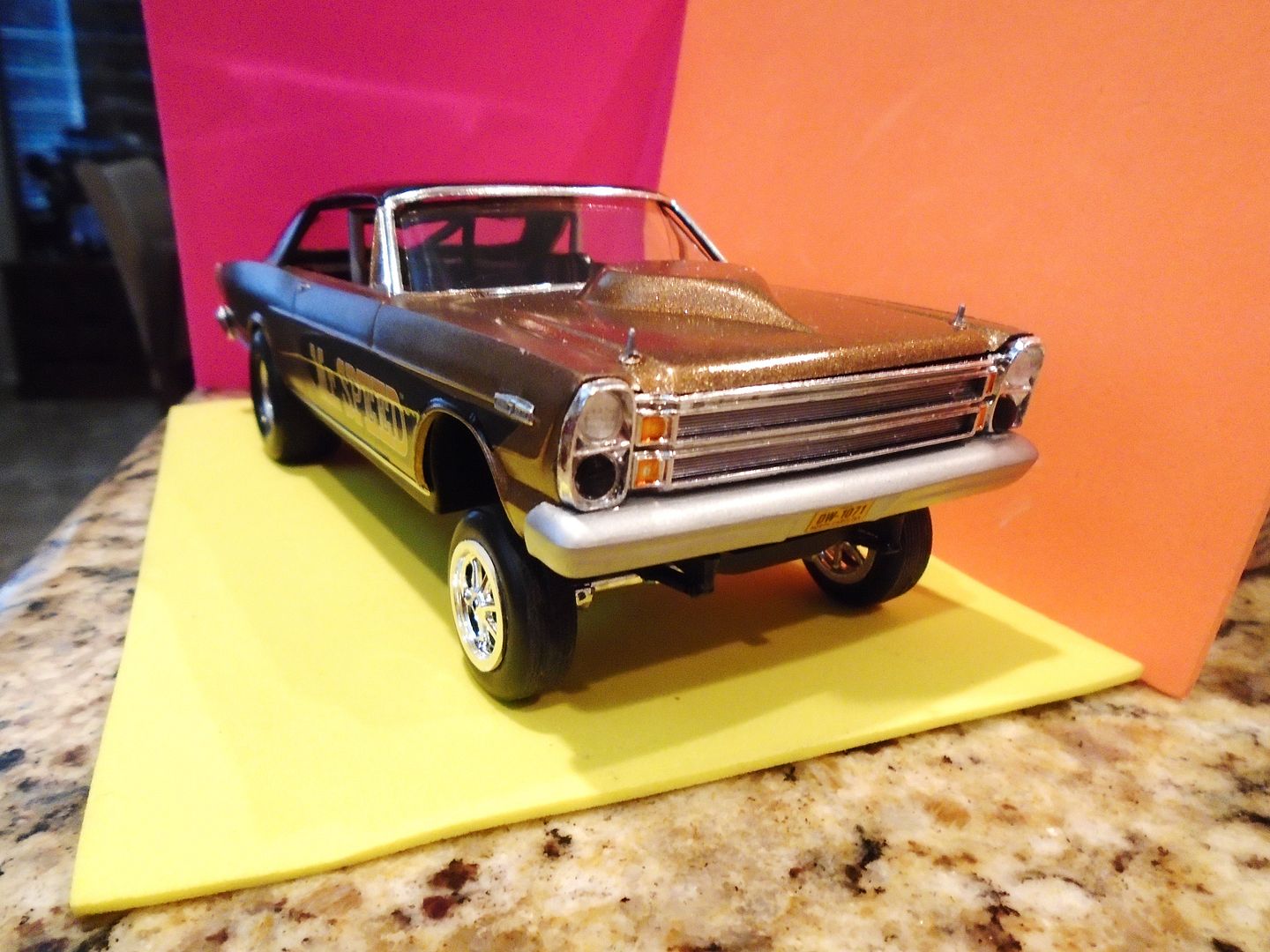 cobraman Posted September 8, 2015 Posted September 8, 2015 Finished this one up a bit ago. Tried to do it in a gasser style. Some chrome was stripped. Tires and wheels were from the parts box as was decals. Parts by Parks pre wired aluminum distributor. Raised suspension with a straight axle from the parts box. Paint is Testors Bronze and Blazing Black. Clear was also Testors. Some BMF. You may notice some areas that should be covered in BMF are not. Reason is I had some paint lift when applying the foil and did not want to risk more damage and touching up. Comments pro or con are always welcome.