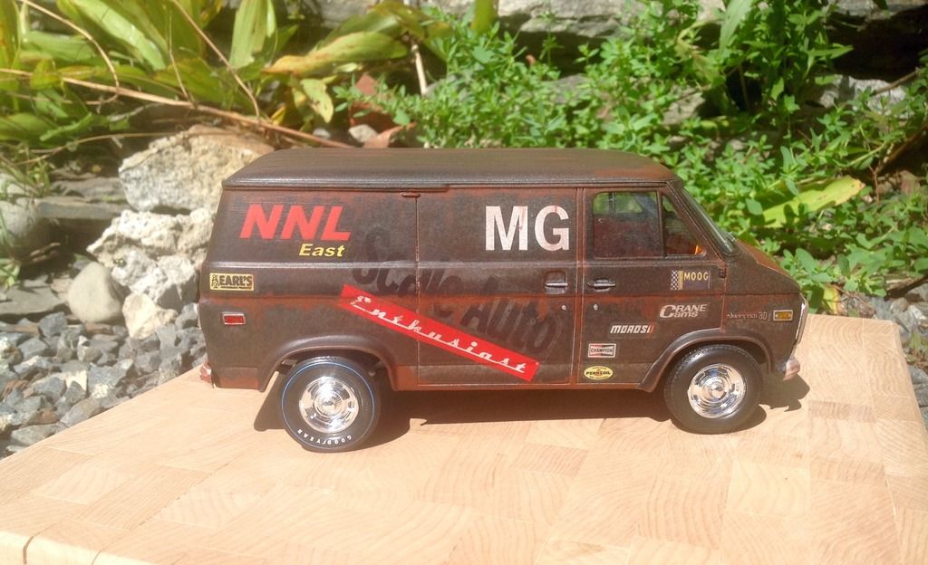 chunkypeanutbutter Posted September 12, 2015 Posted September 12, 2015 Built as an ideal shop van for my future rod shop. Base kit is the newest issue of the Revell '77 Chevy Van. I didn't use the engine... can't really see it anyways unless you turn the thing over, and I don't have any diorama yet that requires that. The paint is Colorplace flat black with lots of decals from various sources, including my initials in Woodland Scenics dry-transfers. This was then, of course, rusted with MM acrylic Rust paint to form surface rust and drips, then rust powder to accentuate the same. The interior is painted with Rustoleum Orange and trimmed with Rustoleum Gloss Black. I also added side windows made from a Coke bottle to disguise the fact that there's no interior in the rear... Just in case anyone looks in there, I tossed in that motorcycle I scratchbuilt a while back. Wheels are stock, but the rear tires are AMT Goodyear slicks from the Parts Pak. Front end was dished down considerably to give a good stinkbug stance. A few real-world important things are missing, but this had been in pieces, 75% complete for so long.... I grabbed it off the table upstairs and assembled it in a little over two days. Questions, comments, etc. welcome.
