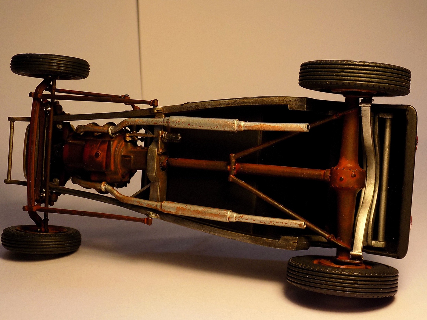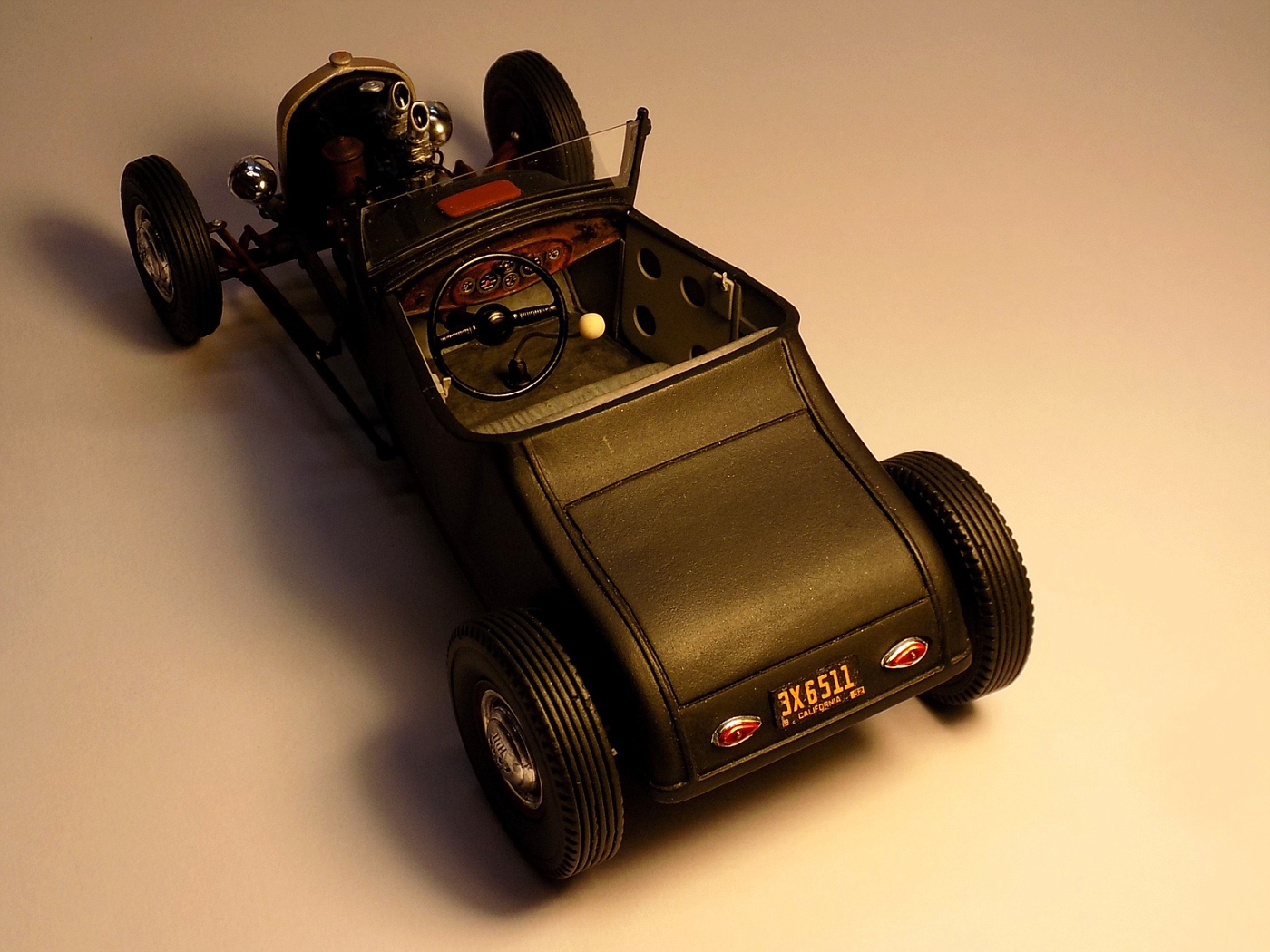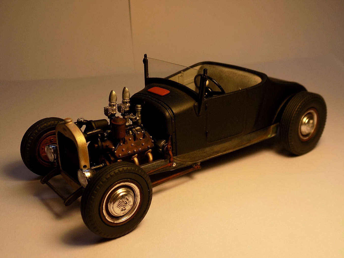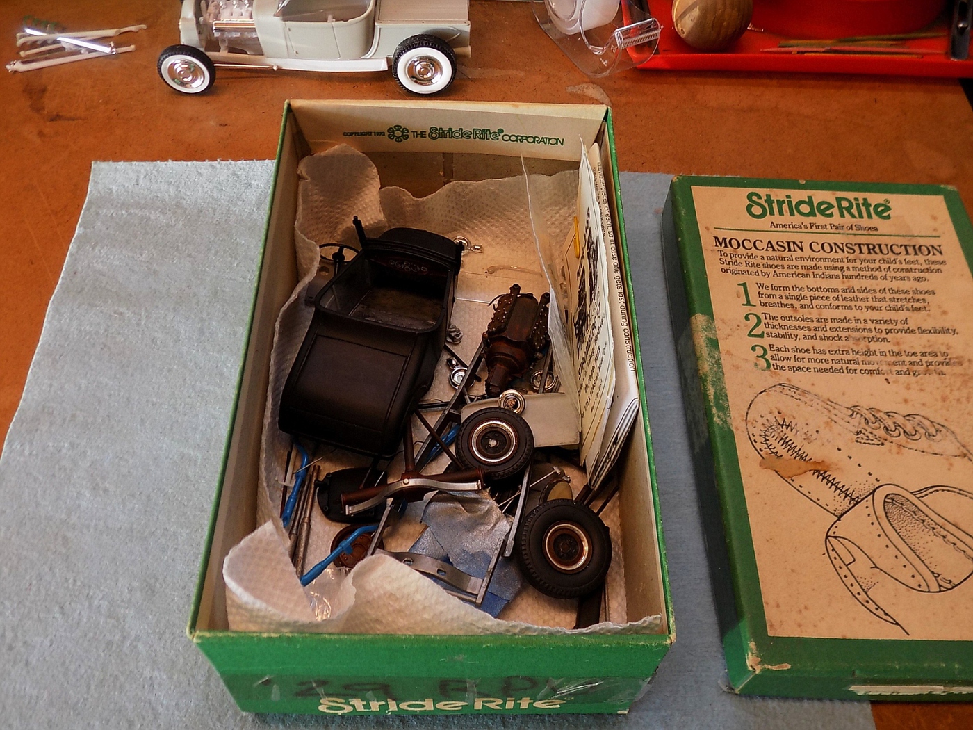 Dennis Lacy Posted December 27, 2015 Posted December 27, 2015 My 1927 Ford Roadster Hot Rod Starting in May of 2005 and spanning until June of 2007, I built a 1927 Ford Roadster hot rod for myself. The car featured a heavily modified 1932 frame, dropped original 1934 axle and split 1934 wishbone, 1934 rear axle with “T” spring, 1935 flathead V8 engine with Thickstun PM-7 intake manifold, Stromberg “81” carburetors, tubular headers with 2” exhaust and Smithy mufflers, 1935 transmission, 1939 Lincoln brakes, 1941 wheels with 1946 hubcaps and Firestone bias-ply tires, 1948 truck steering gear and 1940 steering wheel, modified 1934 Chevy dashboard with early curved-glass Stewart Warner gauges, chopped windshield, chopped 1929 radiator and shell, 1927 Chevy sedan gas tank in the trunk, BLC headlights and 1939 taillights. Every component on the car was a genuine old part and it was constructed to a very exact degree of period authenticity for a Southern California roadster that could have been built in the late 1940's. Many times observers thought that it had been built in the 40's, found and “gone over” to put it back on the street. Their reactions were priceless when I would reveal that it was a newly constructed car! Despite its weathered “patina” appearance, the car was also built and finished to high professional degree of workmanship, function and safety. With this car I was also a member of the historic Pasadena Roadster Club for 6 years which was re-activated with the blessing of the surviving original members in 2002 as a continuation of the original club which was active from 1946 – 1953. Club rules dictated that for a roadster to qualify it had to be of 1936 or older vintage and built from only genuine components not newer than 1953. The purpose of the club was to preserve and promote early hot rodding. After my time in the PRC I also ran a San Bernardino Krankers club plaque given to me by some hot rodding friends from that region. After thousands of miles and daily use over a span of 5.5 years, the car was sent to it's new caretaker in a suburb of Melbourne, Australia. It was far from an easy decision but a necessary one as I had a growing family and another project that I wanted to get to and financing had to come from somewhere. Below are the last photos I ever took of the car, the morning it was transported to a shipping service. Hosted on Fotki Hosted on Fotki Hosted on Fotki Hosted on Fotki In late 2011 I had started befriending a fellow named Jon Ferren from Hollywood, Florida. Jon is an extremely talented model hot rod crafter who I discovered when I joined a forum called Traditional Rods and Kustoms – In Scale back in 2008, about a year after returning to model building after many years away. Extremely impressed with Jon's skill, particularly in creating realistically weathered and worn models I told him that I would like to see him make a model replica of my roadster. He really liked the car and instantly agreed. It wasn't a commissioned build, per-se, and I never had any intention of “owning” the finished model. I really just wanted to see him build it. Also, not wanting Jon to be out any of his choice parts, I sent him a care package consisting of a Jimmy Flinstone roadster body, a set of wheels, a set of Modelhaus resin tires and some other key ingredients. As luck would have it, Jon's profession sends him out to Anaheim, California every January for a trade show and the Anaheim Convention Center is only 30 minutes from the hot rod shop my Dad and I have. That being the case, in January of 2012 Jon was able to take an afternoon off and come out to see the roadster first-hand, go for a long ride around town and even drive it himself. The experience amped him up for the project, to say the least! The experience also solidified our friendship and we have made a tradition of hanging out every January when he is here for his trade show. Nothing like two grown men hanging out in the garage geeking-out over models! Below is a photo of Jon and I with the roadster and him about to take it for a solo spin. Hosted on Fotki Hosted on Fotki Jon made excellent headway at first handling all of the fabrication and painting of the replica model. Then, as it sometimes happens, he ran into some builders block. When he ultimately snapped out of it he was on to new projects and the little roadster never managed to get finished. When he was out here in California in January of 2014 he handed me a little shoe box containing the stalled project. He apologized for not completing it but thought that I might enjoy putting it together. I accepted the challenge and up until last weekend the poor thing sat on my bench in that lonely shoe box needing some love. Jon is scheduled to be here again next month and I made it my mission to push everything out of the way and finally get this little guy hung together. Below are a couple of pictures. The first is how I received the project and the second is taking inventory so that I could plan my attack. Hosted on Fotki Hosted on Fotki Continued... 2