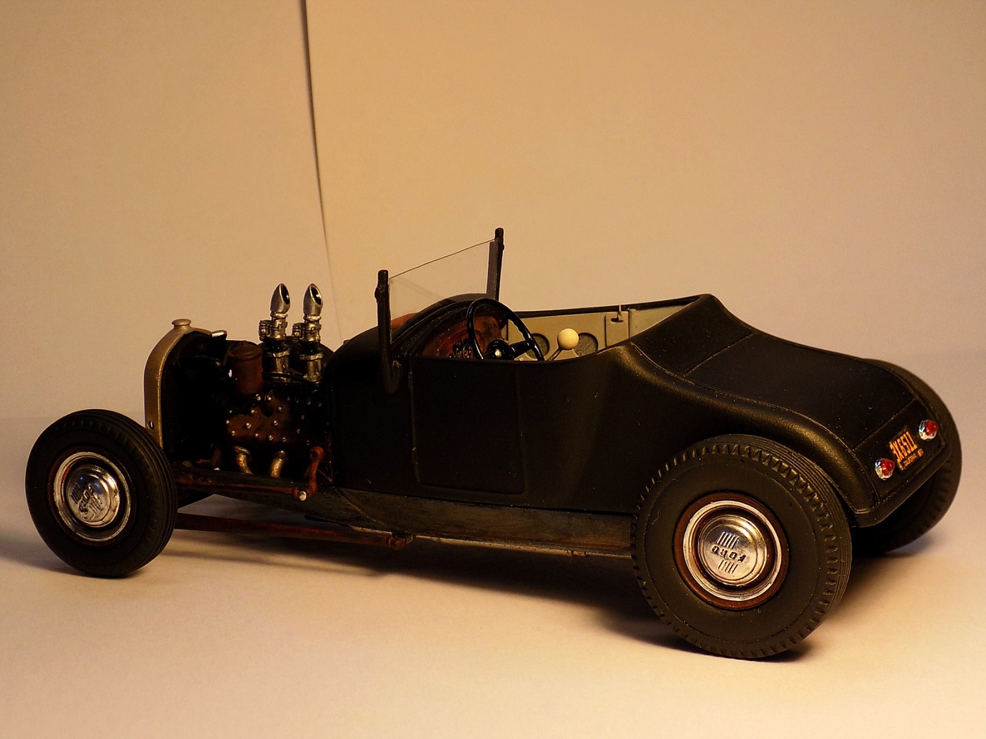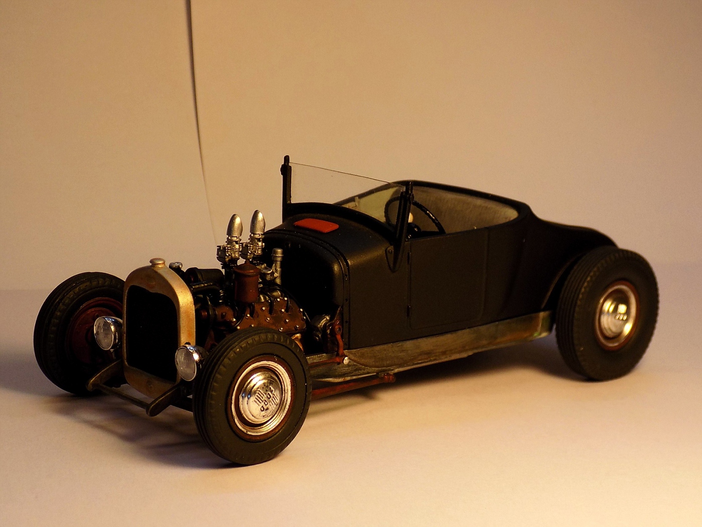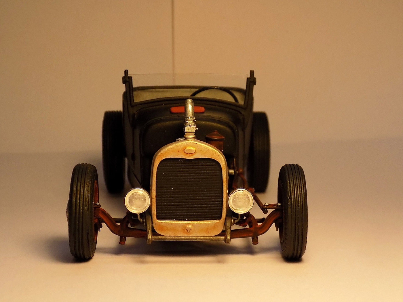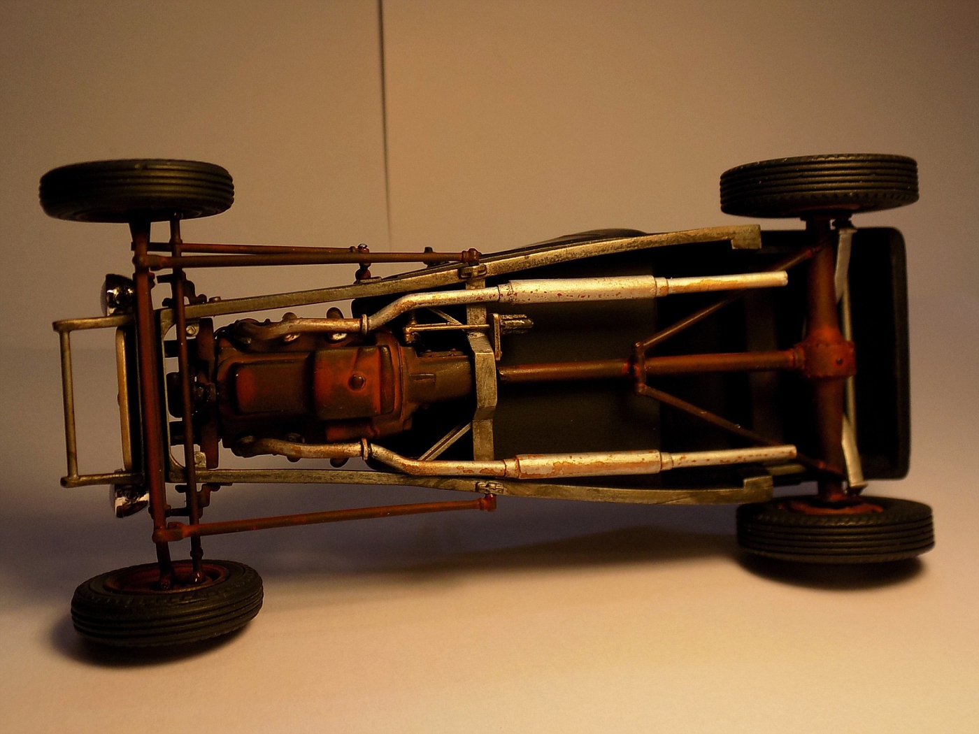 Dennis Lacy Posted December 27, 2015 Posted December 27, 2015 My 1927 Ford Roadster Hot Rod Starting in May of 2005 and spanning until June of 2007, I built a 1927 Ford Roadster hot rod for myself. The car featured a heavily modified 1932 frame, dropped original 1934 axle and split 1934 wishbone, 1934 rear axle with “T” spring, 1935 flathead V8 engine with Thickstun PM-7 intake manifold, Stromberg “81” carburetors, tubular headers with 2” exhaust and Smithy mufflers, 1935 transmission, 1939 Lincoln brakes, 1941 wheels with 1946 hubcaps and Firestone bias-ply tires, 1948 truck steering gear and 1940 steering wheel, modified 1934 Chevy dashboard with early curved-glass Stewart Warner gauges, chopped windshield, chopped 1929 radiator and shell, 1927 Chevy sedan gas tank in the trunk, BLC headlights and 1939 taillights. Every component on the car was a genuine old part and it was constructed to a very exact degree of period authenticity for a Southern California roadster that could have been built in the late 1940's. Many times observers thought that it had been built in the 40's, found and “gone over” to put it back on the street. Their reactions were priceless when I would reveal that it was a newly constructed car! Despite its weathered “patina” appearance, the car was also built and finished to high professional degree of workmanship, function and safety. With this car I was also a member of the historic Pasadena Roadster Club for 6 years which was re-activated with the blessing of the surviving original members in 2002 as a continuation of the original club which was active from 1946 – 1953. Club rules dictated that for a roadster to qualify it had to be of 1936 or older vintage and built from only genuine components not newer than 1953. The purpose of the club was to preserve and promote early hot rodding. After my time in the PRC I also ran a San Bernardino Krankers club plaque given to me by some hot rodding friends from that region. After thousands of miles and daily use over a span of 5.5 years, the car was sent to it's new caretaker in a suburb of Melbourne, Australia. It was far from an easy decision but a necessary one as I had a growing family and another project that I wanted to get to and financing had to come from somewhere. Below are the last photos I ever took of the car, the morning it was transported to a shipping service. Hosted on Fotki Hosted on Fotki Hosted on Fotki Hosted on Fotki In late 2011 I had started befriending a fellow named Jon Ferren from Hollywood, Florida. Jon is an extremely talented model hot rod crafter who I discovered when I joined a forum called Traditional Rods and Kustoms – In Scale back in 2008, about a year after returning to model building after many years away. Extremely impressed with Jon's skill, particularly in creating realistically weathered and worn models I told him that I would like to see him make a model replica of my roadster. He really liked the car and instantly agreed. It wasn't a commissioned build, per-se, and I never had any intention of “owning” the finished model. I really just wanted to see him build it. Also, not wanting Jon to be out any of his choice parts, I sent him a care package consisting of a Jimmy Flinstone roadster body, a set of wheels, a set of Modelhaus resin tires and some other key ingredients. As luck would have it, Jon's profession sends him out to Anaheim, California every January for a trade show and the Anaheim Convention Center is only 30 minutes from the hot rod shop my Dad and I have. That being the case, in January of 2012 Jon was able to take an afternoon off and come out to see the roadster first-hand, go for a long ride around town and even drive it himself. The experience amped him up for the project, to say the least! The experience also solidified our friendship and we have made a tradition of hanging out every January when he is here for his trade show. Nothing like two grown men hanging out in the garage geeking-out over models! Below is a photo of Jon and I with the roadster and him about to take it for a solo spin. Hosted on Fotki Hosted on Fotki Jon made excellent headway at first handling all of the fabrication and painting of the replica model. Then, as it sometimes happens, he ran into some builders block. When he ultimately snapped out of it he was on to new projects and the little roadster never managed to get finished. When he was out here in California in January of 2014 he handed me a little shoe box containing the stalled project. He apologized for not completing it but thought that I might enjoy putting it together. I accepted the challenge and up until last weekend the poor thing sat on my bench in that lonely shoe box needing some love. Jon is scheduled to be here again next month and I made it my mission to push everything out of the way and finally get this little guy hung together. Below are a couple of pictures. The first is how I received the project and the second is taking inventory so that I could plan my attack. Hosted on Fotki Hosted on Fotki Continued... 2