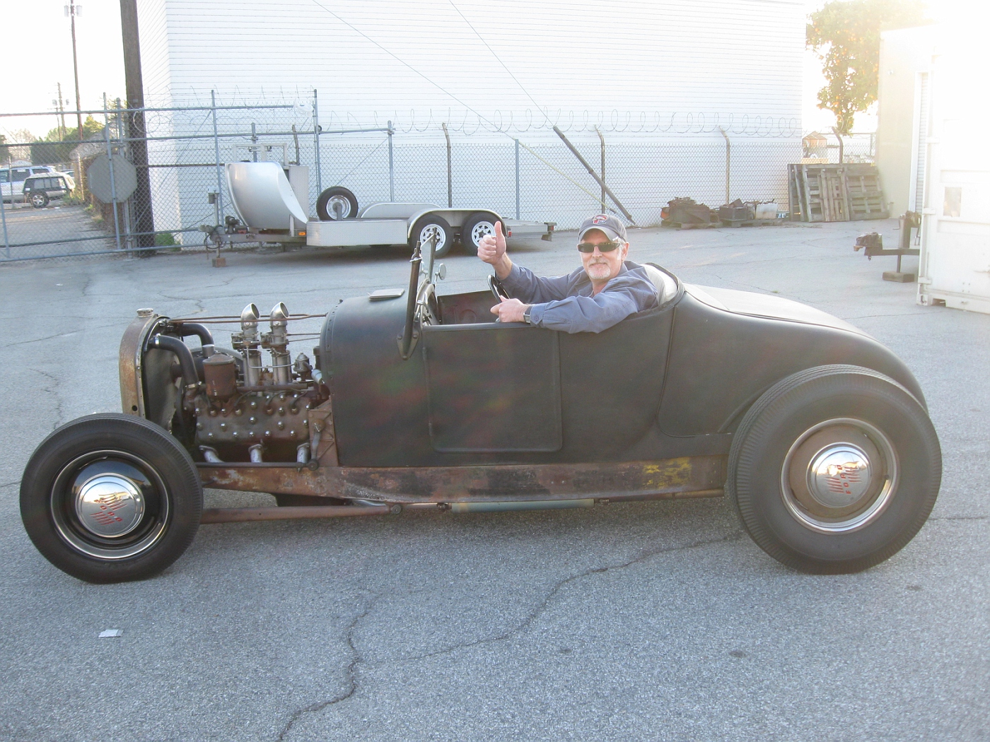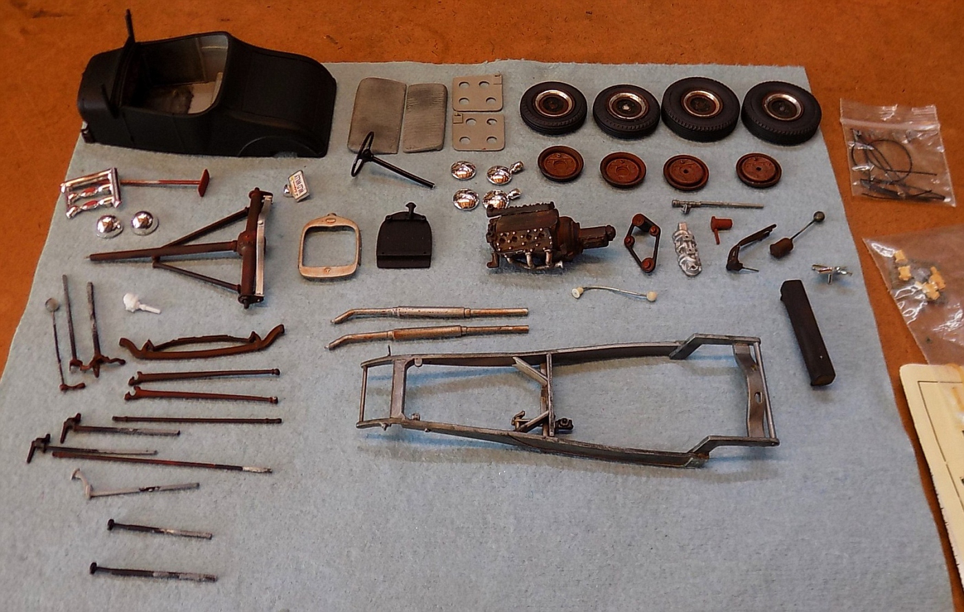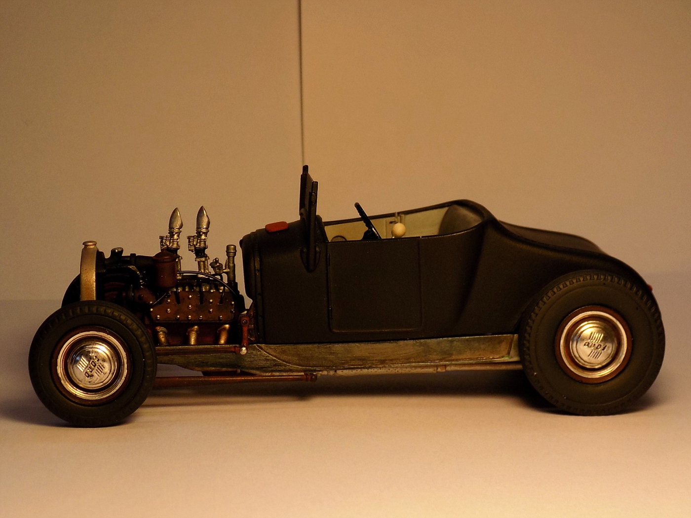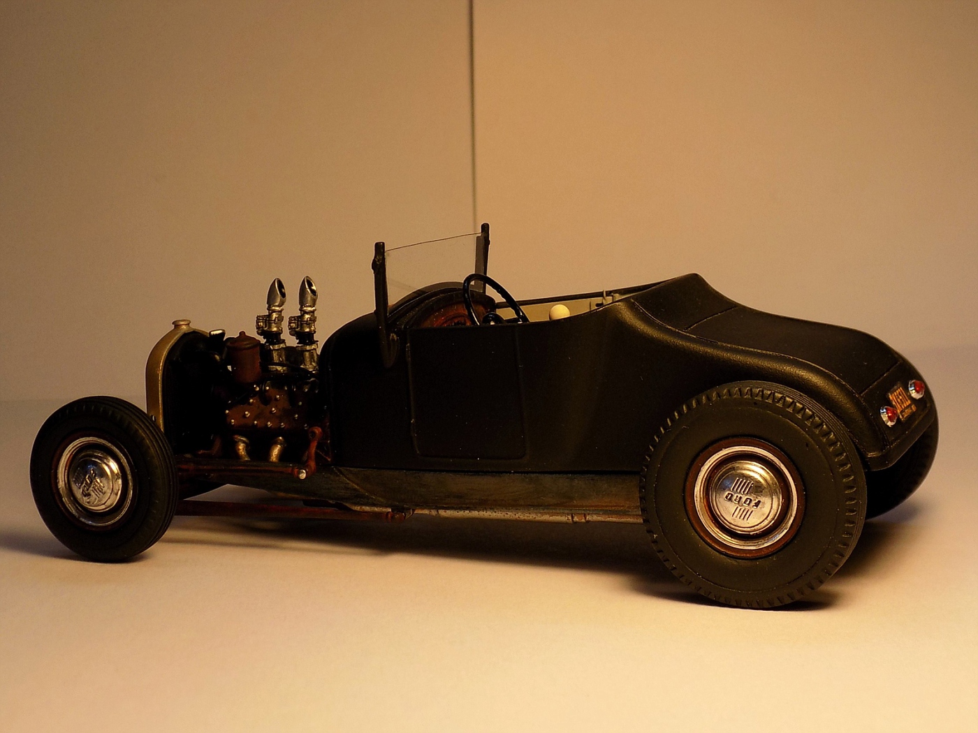 Dennis Lacy Posted December 27, 2015 Posted December 27, 2015 My 1927 Ford Roadster Hot Rod Starting in May of 2005 and spanning until June of 2007, I built a 1927 Ford Roadster hot rod for myself. The car featured a heavily modified 1932 frame, dropped original 1934 axle and split 1934 wishbone, 1934 rear axle with “T” spring, 1935 flathead V8 engine with Thickstun PM-7 intake manifold, Stromberg “81” carburetors, tubular headers with 2” exhaust and Smithy mufflers, 1935 transmission, 1939 Lincoln brakes, 1941 wheels with 1946 hubcaps and Firestone bias-ply tires, 1948 truck steering gear and 1940 steering wheel, modified 1934 Chevy dashboard with early curved-glass Stewart Warner gauges, chopped windshield, chopped 1929 radiator and shell, 1927 Chevy sedan gas tank in the trunk, BLC headlights and 1939 taillights. Every component on the car was a genuine old part and it was constructed to a very exact degree of period authenticity for a Southern California roadster that could have been built in the late 1940's. Many times observers thought that it had been built in the 40's, found and “gone over” to put it back on the street. Their reactions were priceless when I would reveal that it was a newly constructed car! Despite its weathered “patina” appearance, the car was also built and finished to high professional degree of workmanship, function and safety. With this car I was also a member of the historic Pasadena Roadster Club for 6 years which was re-activated with the blessing of the surviving original members in 2002 as a continuation of the original club which was active from 1946 – 1953. Club rules dictated that for a roadster to qualify it had to be of 1936 or older vintage and built from only genuine components not newer than 1953. The purpose of the club was to preserve and promote early hot rodding. After my time in the PRC I also ran a San Bernardino Krankers club plaque given to me by some hot rodding friends from that region. After thousands of miles and daily use over a span of 5.5 years, the car was sent to it's new caretaker in a suburb of Melbourne, Australia. It was far from an easy decision but a necessary one as I had a growing family and another project that I wanted to get to and financing had to come from somewhere. Below are the last photos I ever took of the car, the morning it was transported to a shipping service. Hosted on Fotki Hosted on Fotki Hosted on Fotki Hosted on Fotki In late 2011 I had started befriending a fellow named Jon Ferren from Hollywood, Florida. Jon is an extremely talented model hot rod crafter who I discovered when I joined a forum called Traditional Rods and Kustoms – In Scale back in 2008, about a year after returning to model building after many years away. Extremely impressed with Jon's skill, particularly in creating realistically weathered and worn models I told him that I would like to see him make a model replica of my roadster. He really liked the car and instantly agreed. It wasn't a commissioned build, per-se, and I never had any intention of “owning” the finished model. I really just wanted to see him build it. Also, not wanting Jon to be out any of his choice parts, I sent him a care package consisting of a Jimmy Flinstone roadster body, a set of wheels, a set of Modelhaus resin tires and some other key ingredients. As luck would have it, Jon's profession sends him out to Anaheim, California every January for a trade show and the Anaheim Convention Center is only 30 minutes from the hot rod shop my Dad and I have. That being the case, in January of 2012 Jon was able to take an afternoon off and come out to see the roadster first-hand, go for a long ride around town and even drive it himself. The experience amped him up for the project, to say the least! The experience also solidified our friendship and we have made a tradition of hanging out every January when he is here for his trade show. Nothing like two grown men hanging out in the garage geeking-out over models! Below is a photo of Jon and I with the roadster and him about to take it for a solo spin. Hosted on Fotki Hosted on Fotki Jon made excellent headway at first handling all of the fabrication and painting of the replica model. Then, as it sometimes happens, he ran into some builders block. When he ultimately snapped out of it he was on to new projects and the little roadster never managed to get finished. When he was out here in California in January of 2014 he handed me a little shoe box containing the stalled project. He apologized for not completing it but thought that I might enjoy putting it together. I accepted the challenge and up until last weekend the poor thing sat on my bench in that lonely shoe box needing some love. Jon is scheduled to be here again next month and I made it my mission to push everything out of the way and finally get this little guy hung together. Below are a couple of pictures. The first is how I received the project and the second is taking inventory so that I could plan my attack. Hosted on Fotki Hosted on Fotki Continued... 2