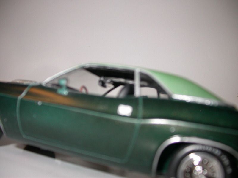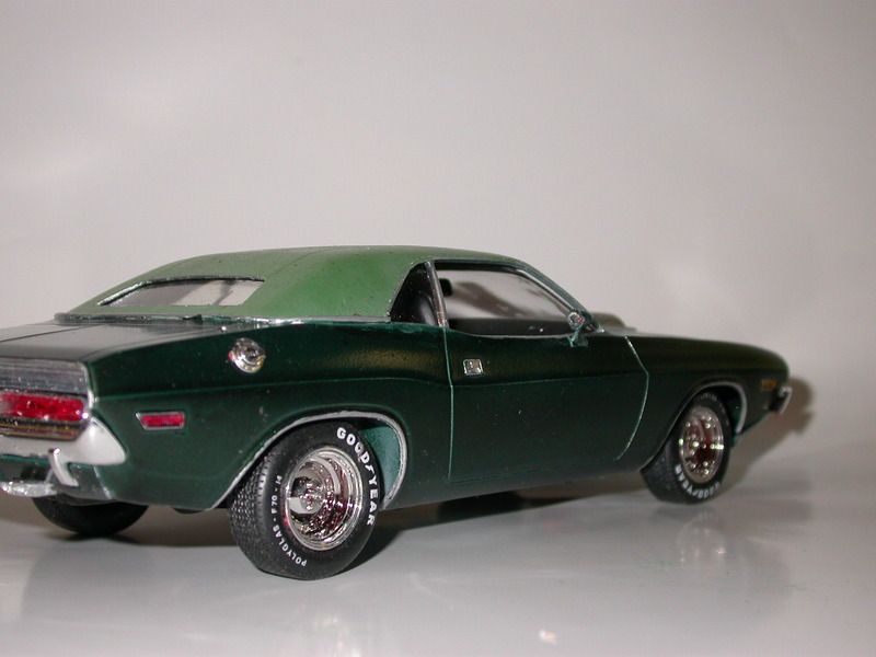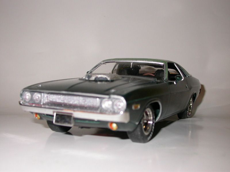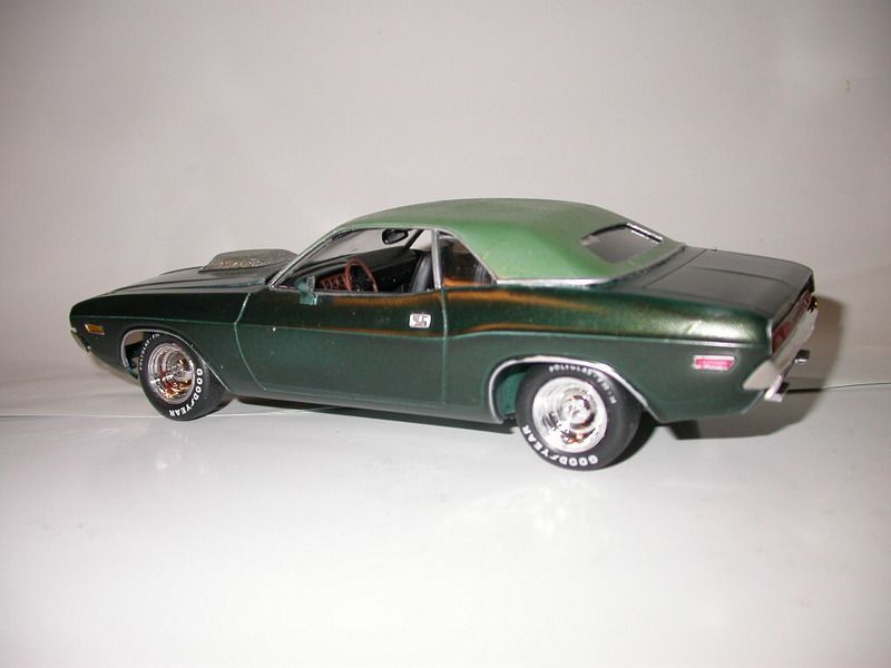 dptydawg Posted January 18, 2016 Posted January 18, 2016 This model started out as a 1/24th scale Monogram 2 in 1 Street Machine. Its basicly a T/A with some extra goodies. I tried to convert it into an SE addition with some extra goodies also. The back window was closed in to SE size and a vinyl roof was added from masking tape. The T/A exhaust was converted into a scratch built dual resonators and muffler system.. I added torque boxes to the sub-frame and a headliner and roof consul. I used the T/A hood without the scoop and scratch built the shaker air cleaner. It has a parts box Hemi auto. The paint is MM British Racing Green Metalic and the roof is some cheep shade of nail polish. Thanks for looking Carl