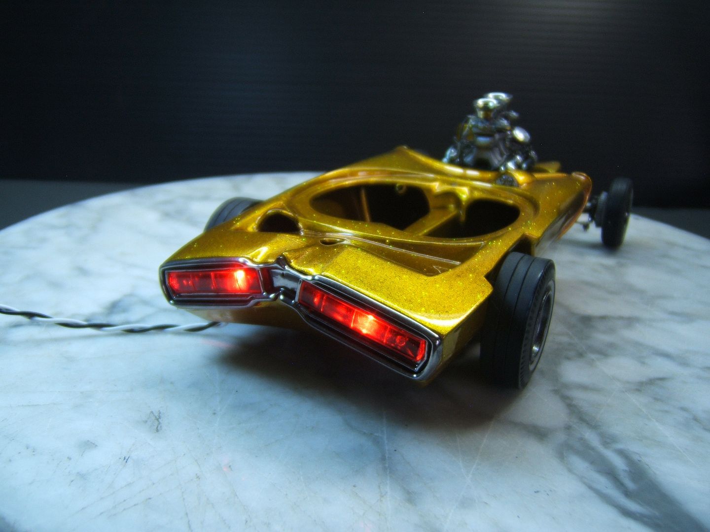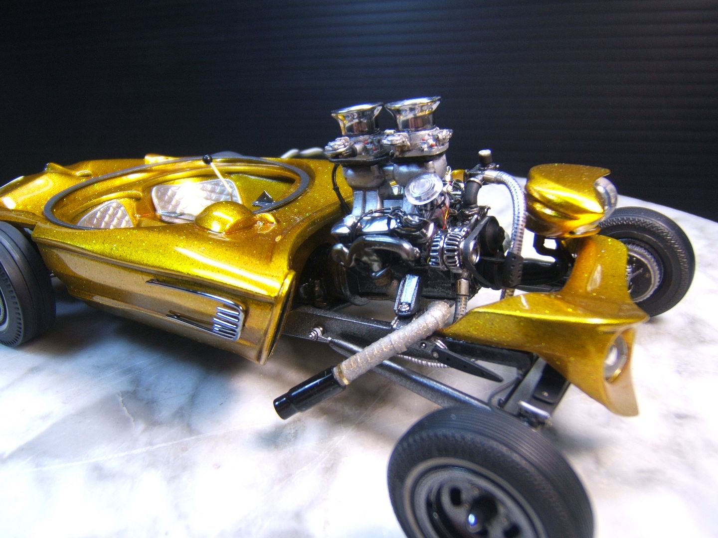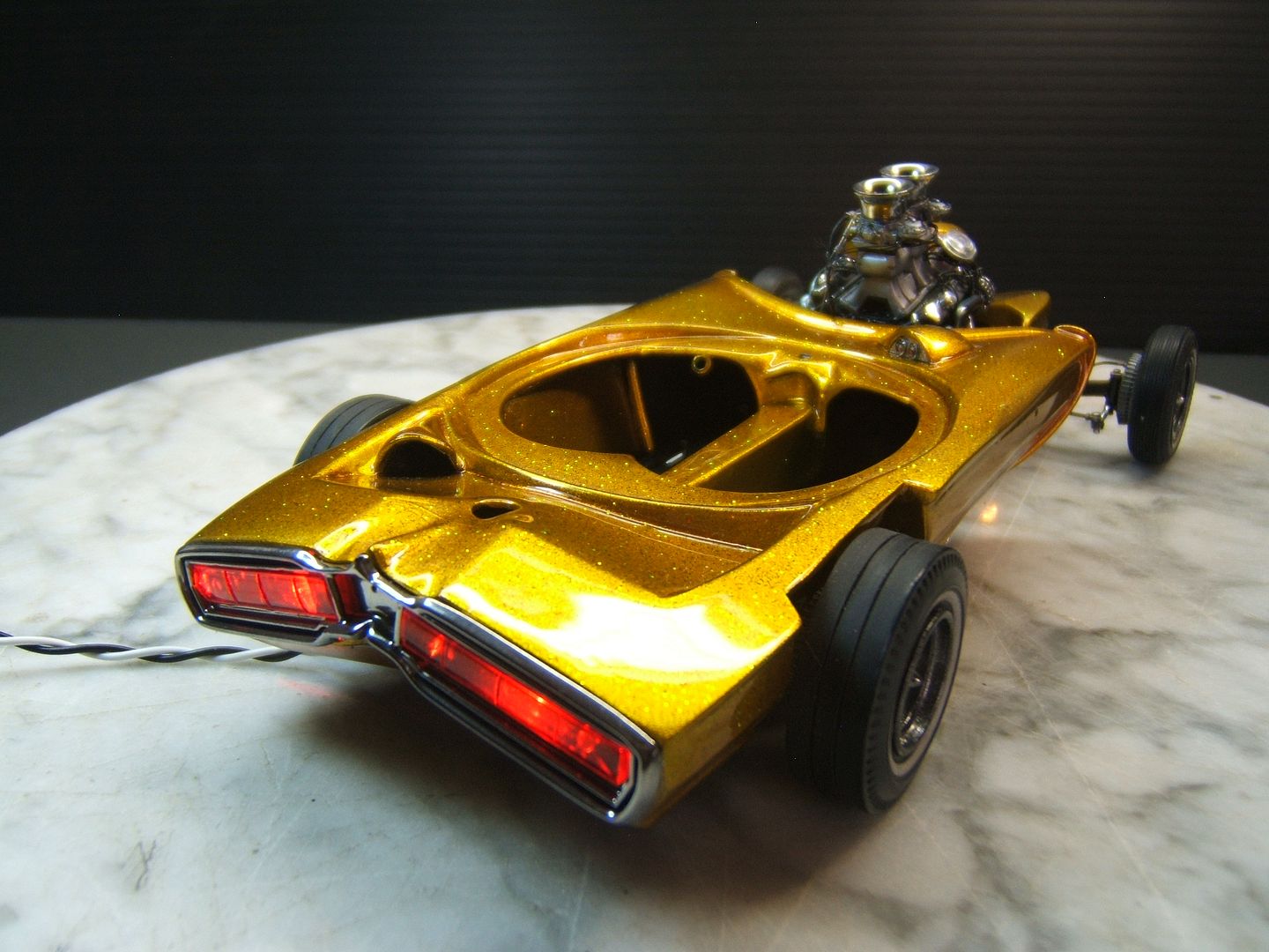 John Goschke Posted March 22, 2016 Posted March 22, 2016 awsome !! tasty !! insane job !! love it !!! the craftmenship and detail in this is stunning !!! paint > whow ..... real fan of your work !! can i talk about one small thing i keep thinking about ?? not ment offensive !! i feel when looking at the original thats more slanted forward .. this one backwards ..its not that i dislike it .. it kind of almost gives it a funky mixed look of a showrod vs gasser .. its also looking real wide in the front and narrow in the back again i really dont dislike the look but lookin at the original its got a more narrow track in front and wider in the back .. and sitting more level ....again just a thought i had not ment in a bad way I've got to agree with Richard, stellar paint and detailing on this build, John. Love the lights! But if there was anything you could do to fix the stance to a forward, hot rod style rake like the 1/1 it would improve the basic look of the model significantly. In hot rods and customs "stance is everything!" I'm assuming the proportional differences between the model and the prototype were driven by the oversize bubble you had to work with.