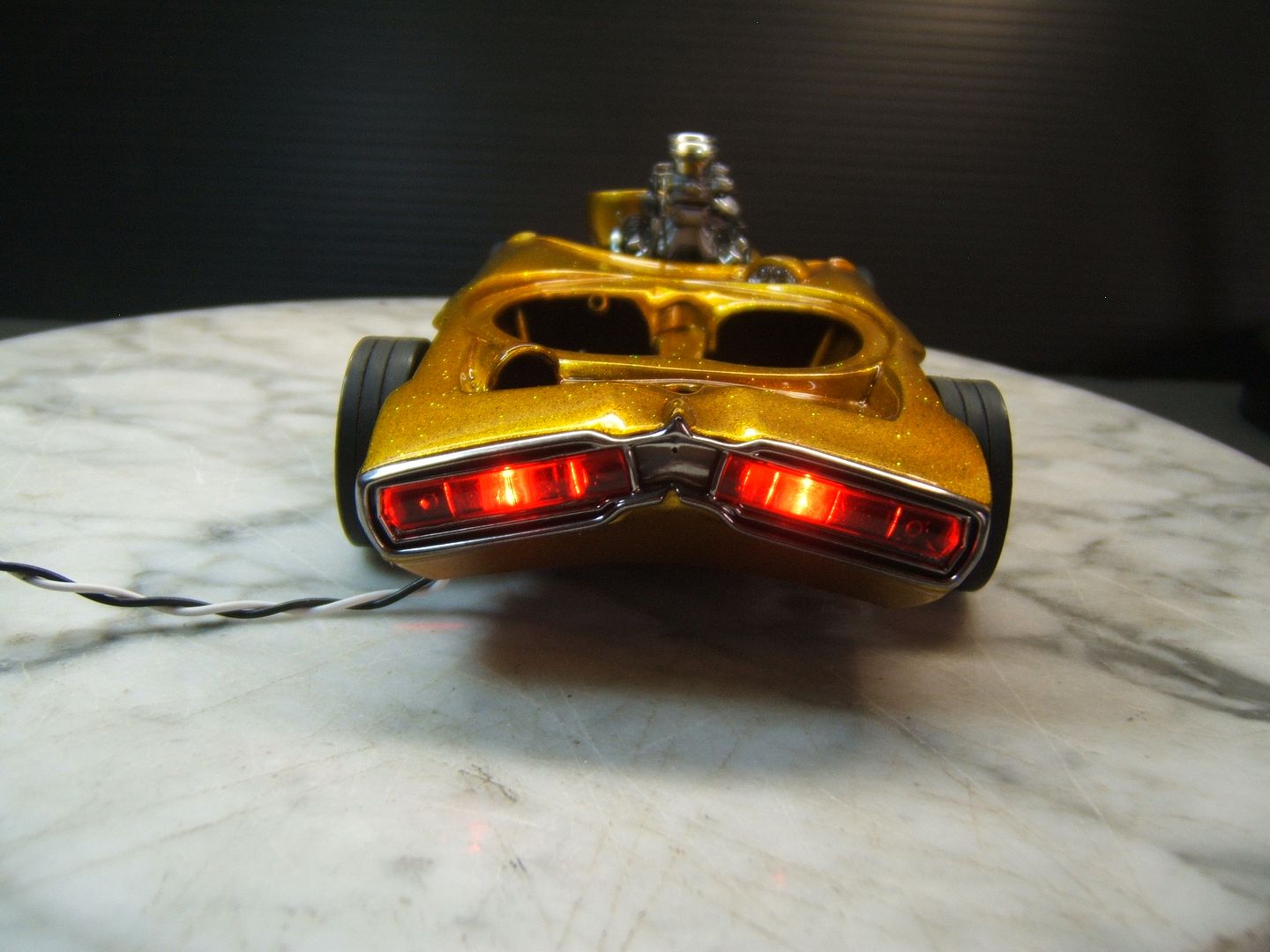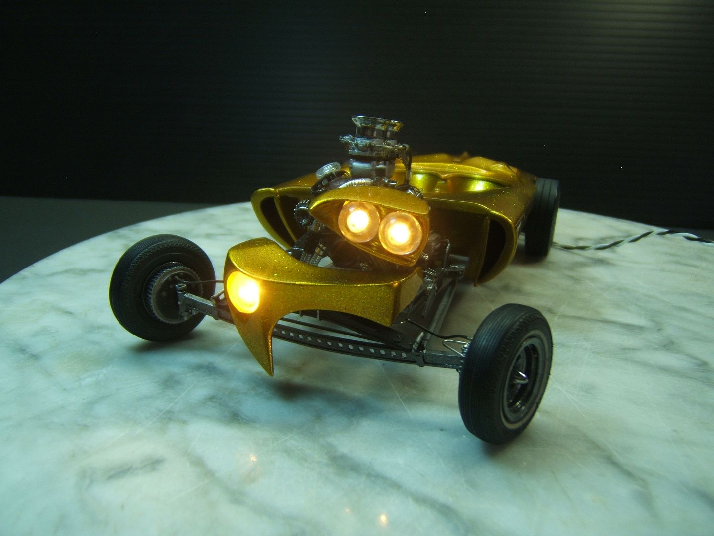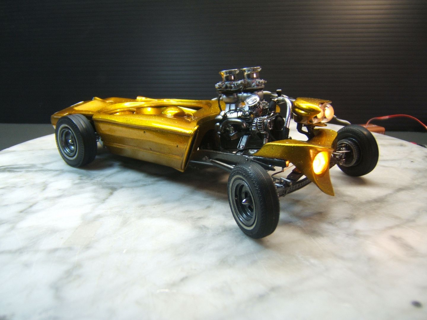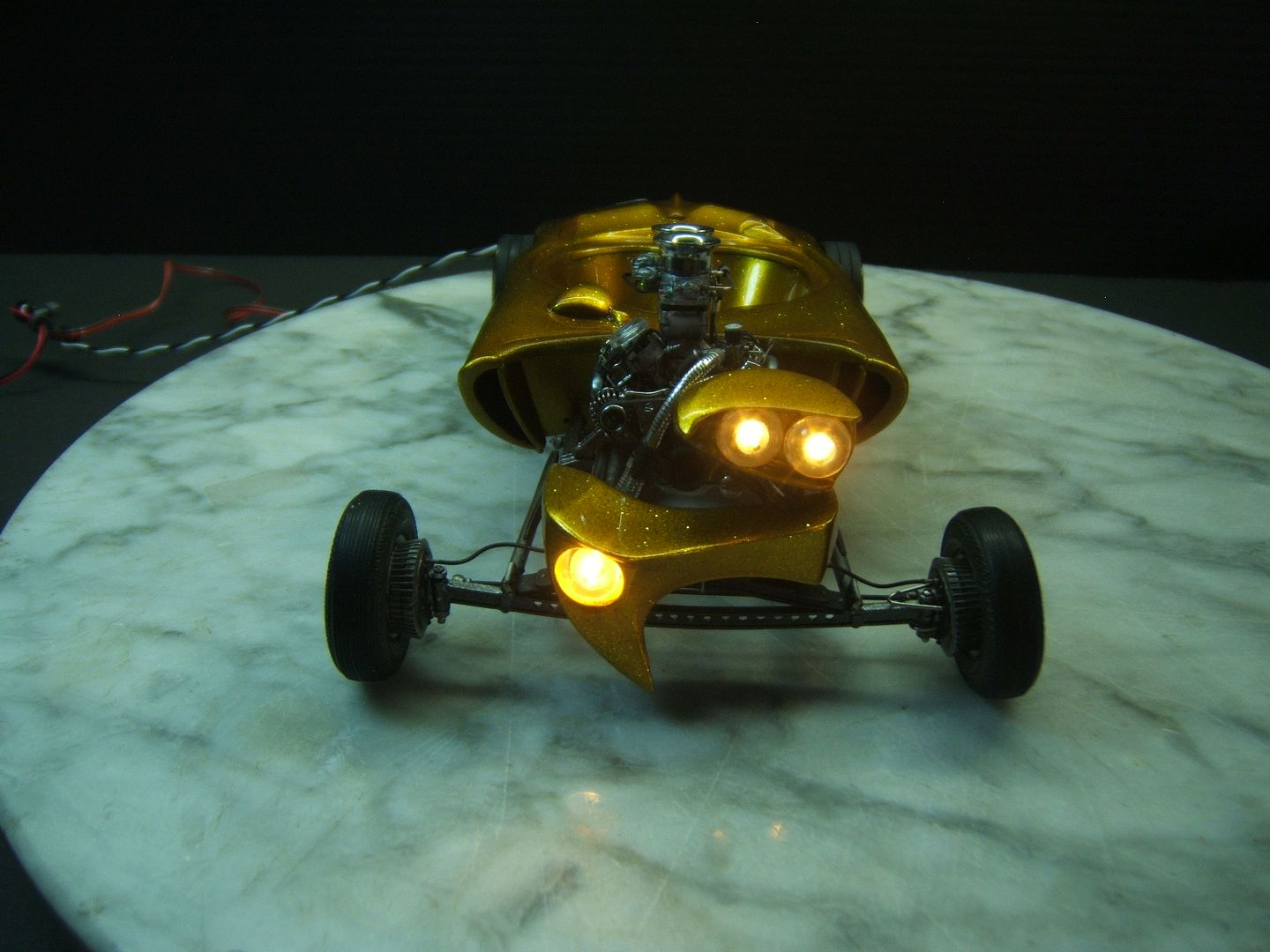 John Goschke Posted March 22, 2016 Posted March 22, 2016 awsome !! tasty !! insane job !! love it !!! the craftmenship and detail in this is stunning !!! paint > whow ..... real fan of your work !! can i talk about one small thing i keep thinking about ?? not ment offensive !! i feel when looking at the original thats more slanted forward .. this one backwards ..its not that i dislike it .. it kind of almost gives it a funky mixed look of a showrod vs gasser .. its also looking real wide in the front and narrow in the back again i really dont dislike the look but lookin at the original its got a more narrow track in front and wider in the back .. and sitting more level ....again just a thought i had not ment in a bad way I've got to agree with Richard, stellar paint and detailing on this build, John. Love the lights! But if there was anything you could do to fix the stance to a forward, hot rod style rake like the 1/1 it would improve the basic look of the model significantly. In hot rods and customs "stance is everything!" I'm assuming the proportional differences between the model and the prototype were driven by the oversize bubble you had to work with.