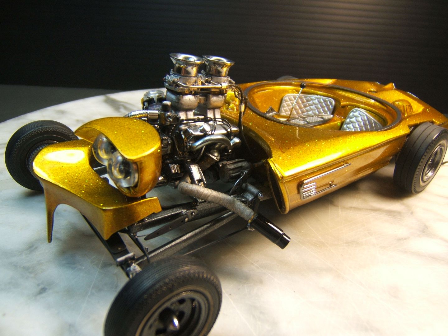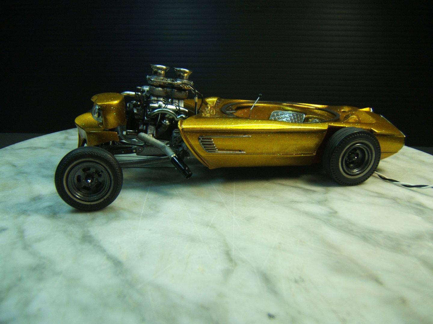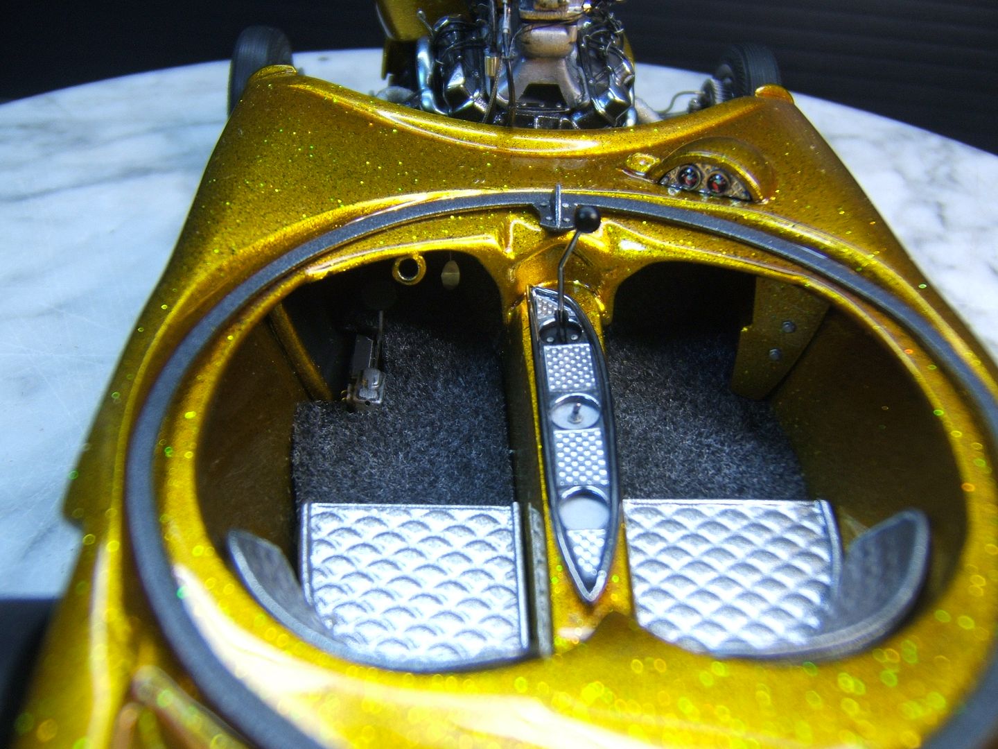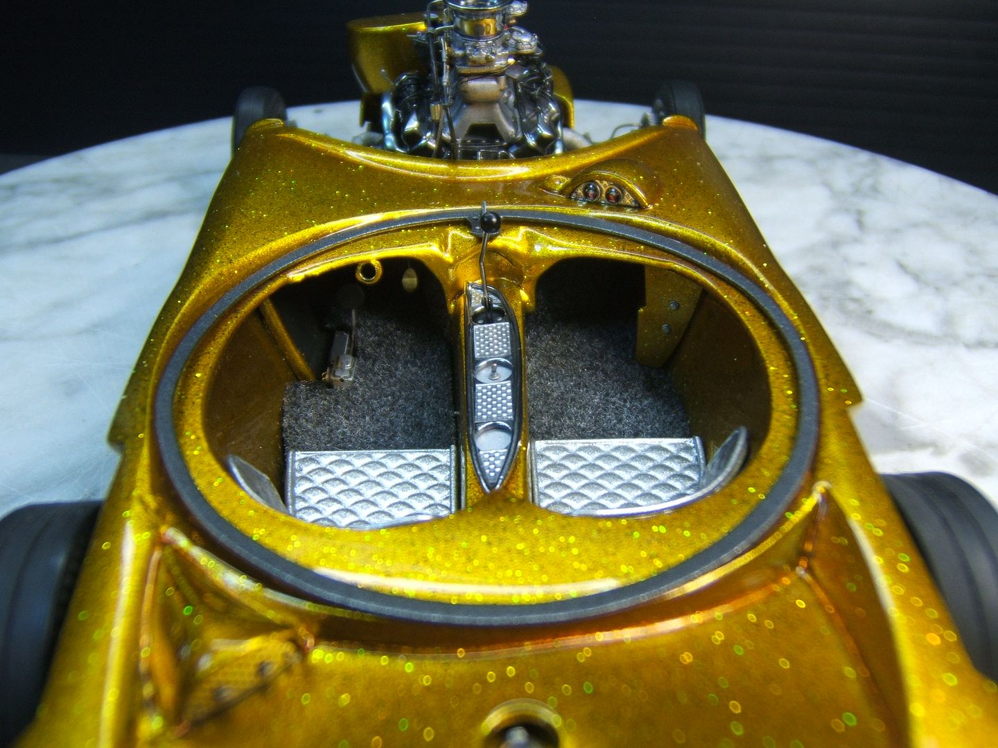John Teresi Posted March 24, 2016 Author Posted March 24, 2016 Hello.......thank you all so very much for the kind comments......I really do apprecite them.......I got the headers on and wraped them with medical tape.........I used a "Pro Tech" gas cap......I made some side emblems and painted them Alclad.......I made some seats and painted them with H.O.K. Orion Silver and I also made a console and painted Alclad.......I used flocking for the carpet and I also made the bubble top ring and switches for the bubble top.........now all I need to do is add the bubble top ,steering wheel and master brake cover and antennas.........then I will start on the base ......thanks for looking