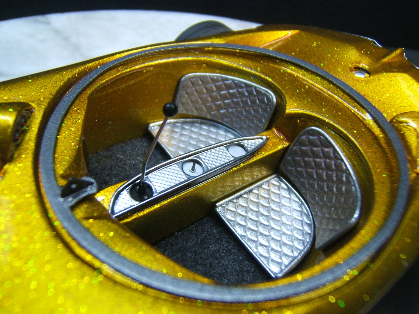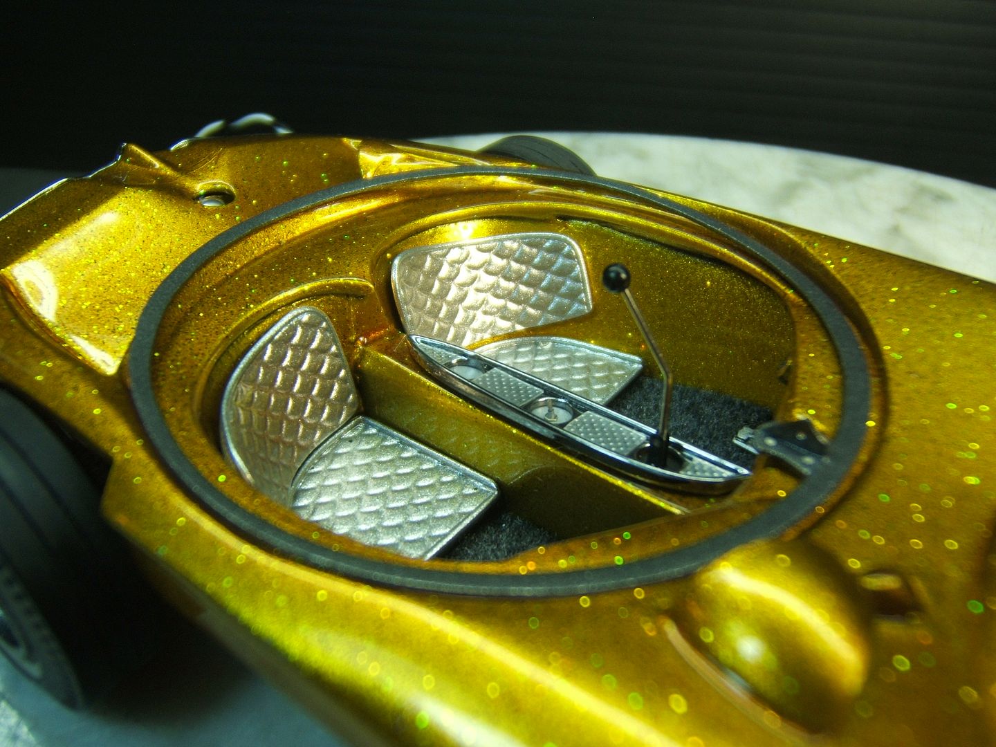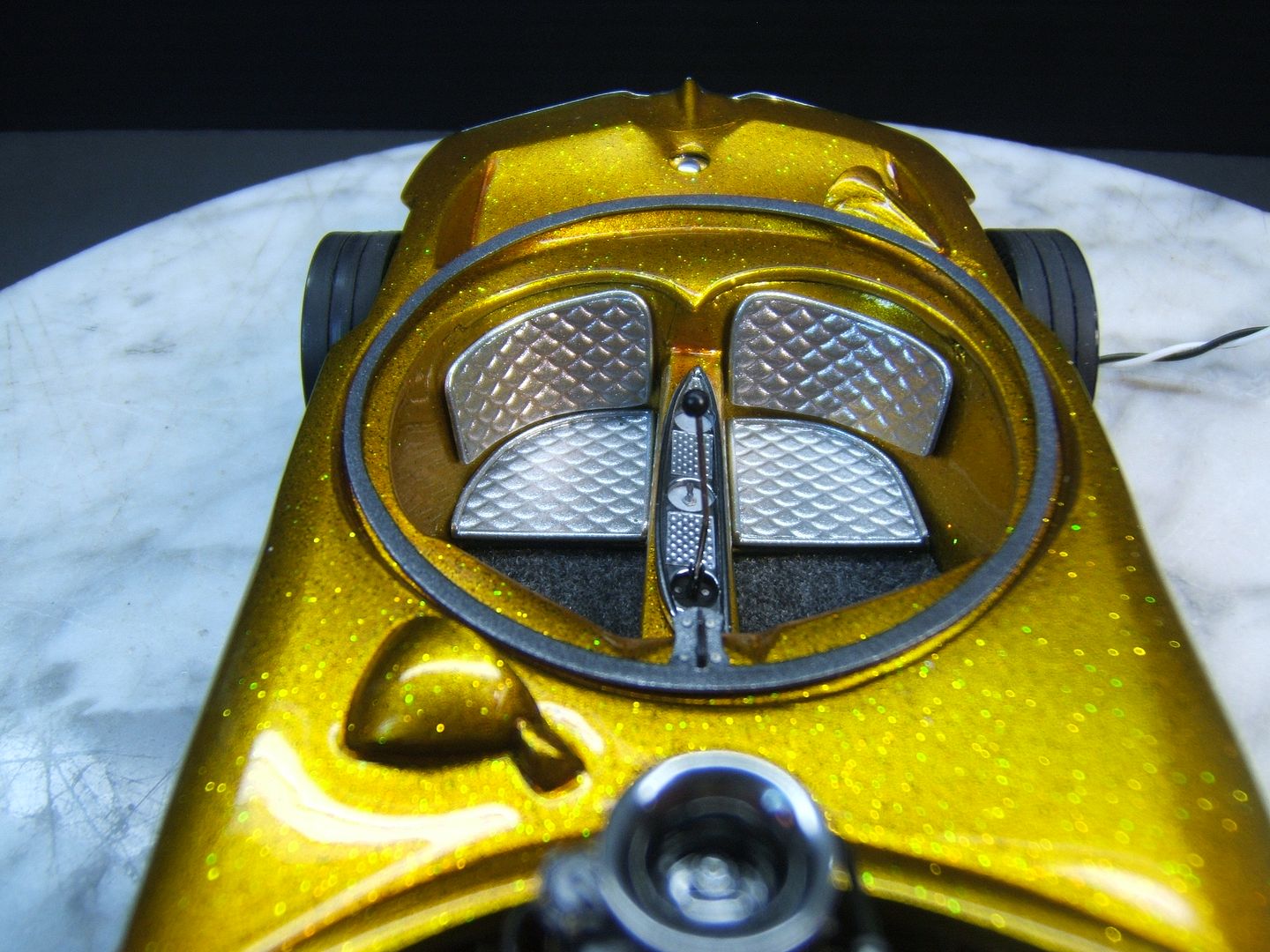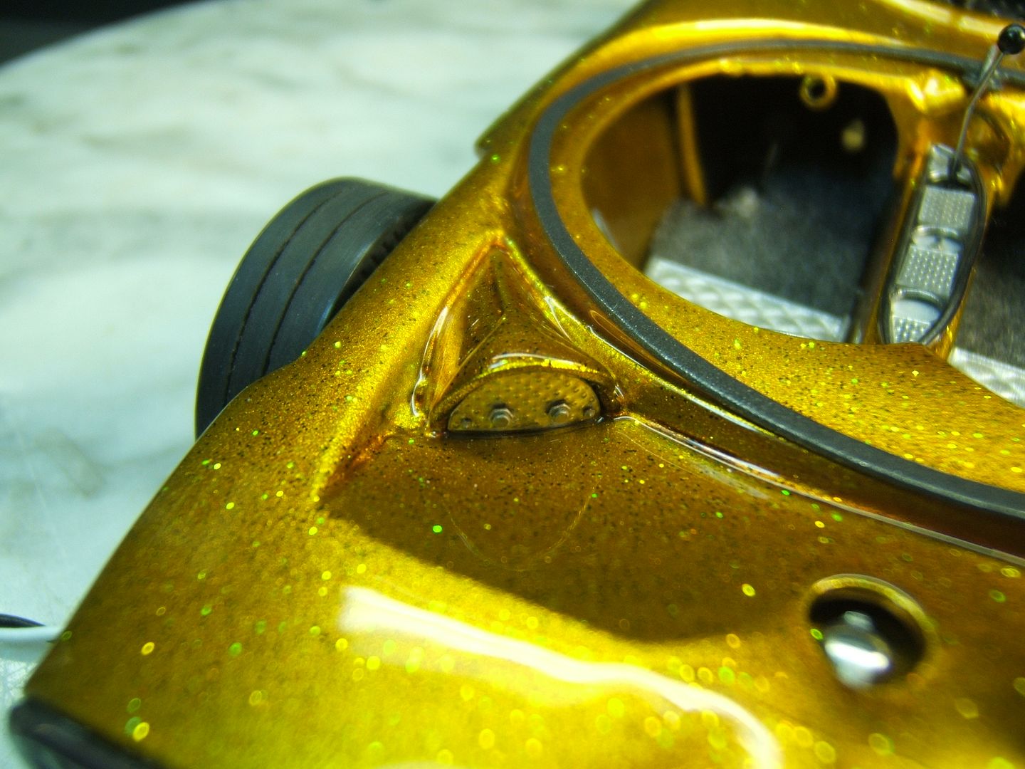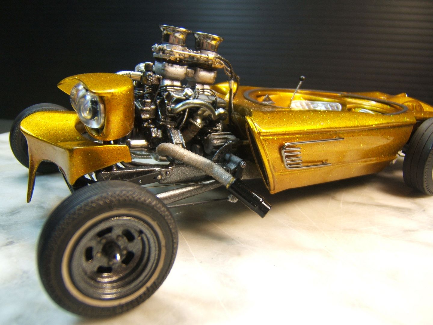 John Teresi Posted March 24, 2016 Author Posted March 24, 2016 Hello.......thank you all so very much for the kind comments......I really do apprecite them.......I got the headers on and wraped them with medical tape.........I used a "Pro Tech" gas cap......I made some side emblems and painted them Alclad.......I made some seats and painted them with H.O.K. Orion Silver and I also made a console and painted Alclad.......I used flocking for the carpet and I also made the bubble top ring and switches for the bubble top.........now all I need to do is add the bubble top ,steering wheel and master brake cover and antennas.........then I will start on the base ......thanks for looking