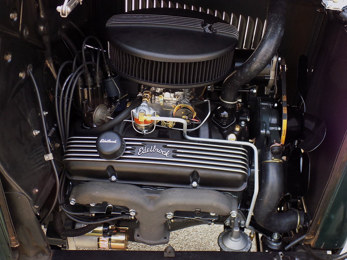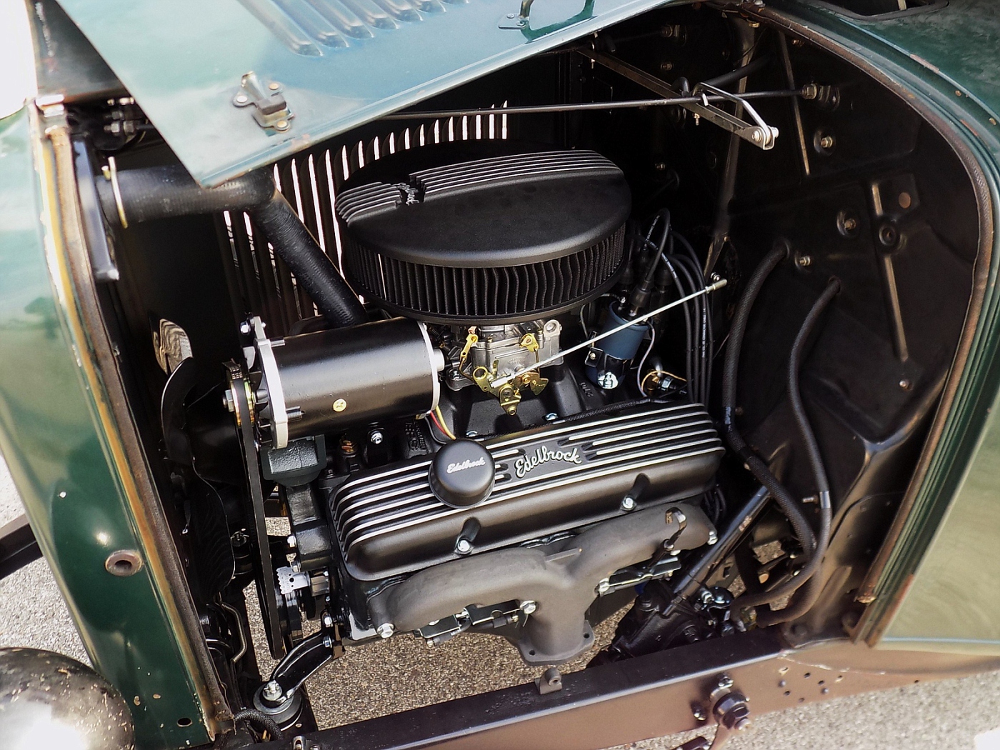 Dennis Lacy Posted April 22, 2016 Posted April 22, 2016 and there in lies the reason we use the Chevrolet Small Block engine, not to mention the abundance of performance parts. And, another excellent reason is their size. SBC's are identical in length and width to a flathead V8 and actually weigh slightly less, stock for stock. Below is a picture under the hood of my 1932 Ford Pickup and the '66 283 SBC that now resides there. No modifications were required to the firewall, steering gear/column placement, toe board panel and a mechanical fan clears the radiator with room to spare. It uses an adapter to connect to a '32-'39 3-speed transmission so no modification to the transmission cross member, pedals, linkage, anything was necessary. The front engine "L" brackets are original 1932 Ford V8. All that is necessary to attach them to the SBC is to relocate the upper of the two engine attachment holes down 5/8". After that they bolt right on the SBC and fall right back onto the mount cushions on the front cross member. The SBC attachment holes on the front of the block are the same width and up/down location relative to the crankshaft centerline. It's too easy. The only modification necessary was to remove a 1" by 6.5" long strip from the center of the front frame cross member to clear the crankshaft damper & pulley. I did paint my Chevy engine antique Ford engine dark green! Hosted on Fotki Hosted on Fotki Previously the truck had its stock Model B 4 cylinder engine. This little 283 is completely stock and makes more than 4x the horsepower and more than double the torque. It's the difference between putting around town and cruising at 70 on the freeway. The reason more Ford small blocks (260, 289, 302, 351W) aren't used is because due to the way their timing cover is designed, even with the shortest water pump and shallowest pulleys an SBF is 4+ inches longer and physically won't fit in the available space without setting the whole engine / transmission back by that amount. It's just not practical unless you are building a rod from the ground up with a clean sheet of paper as the frame, driveline, firewall and floor will all require involved modification.