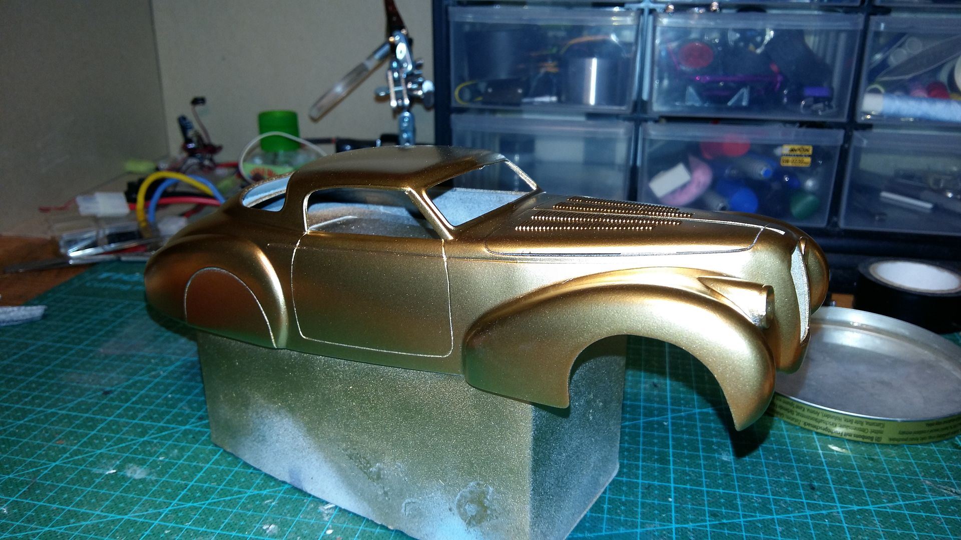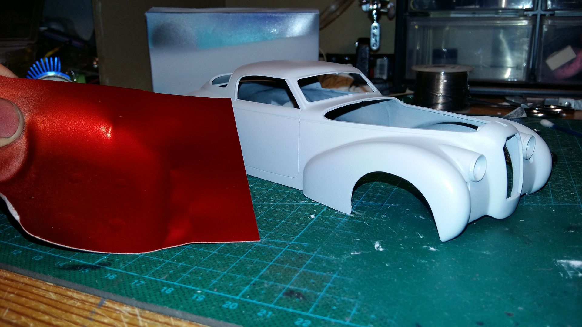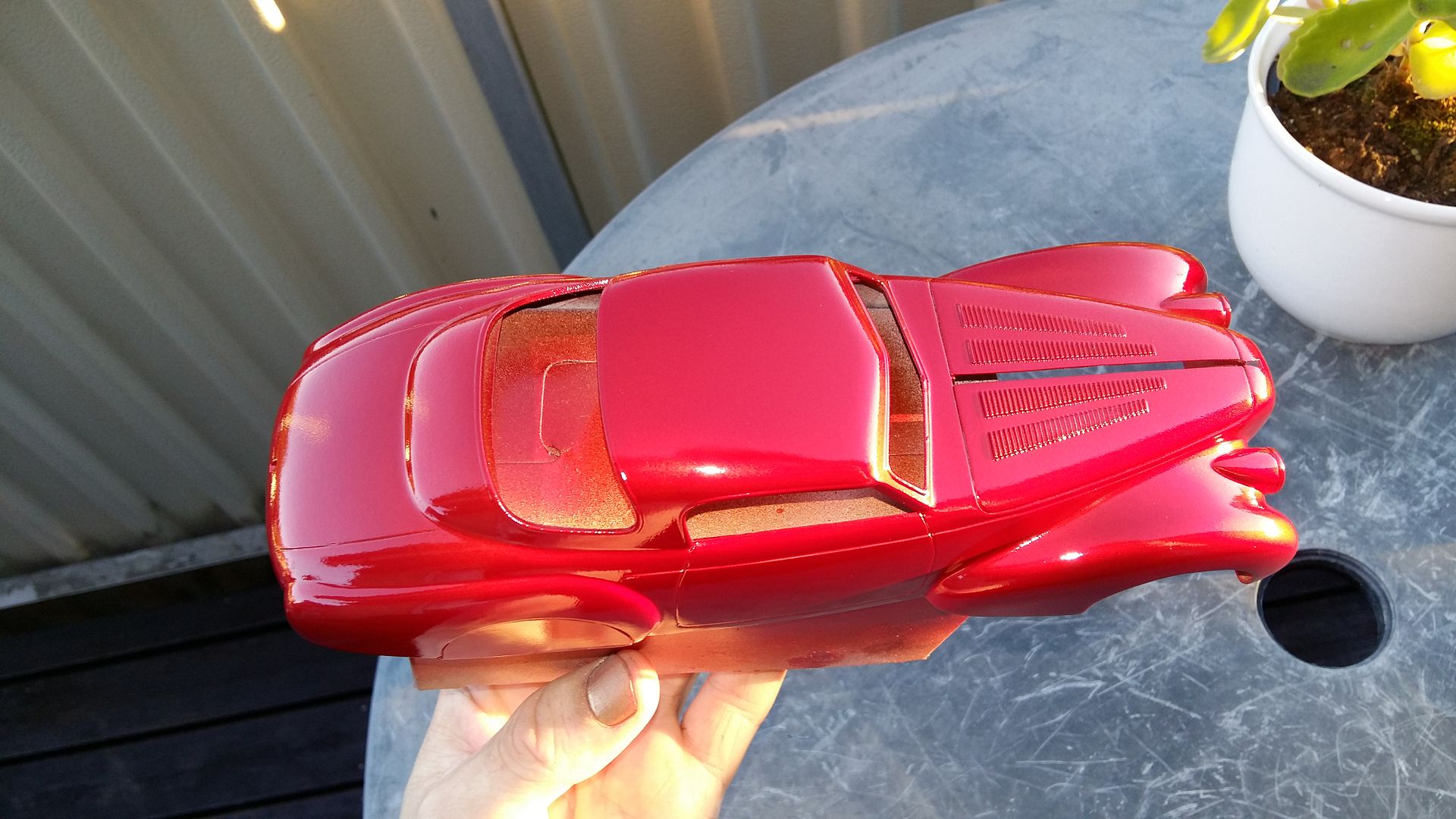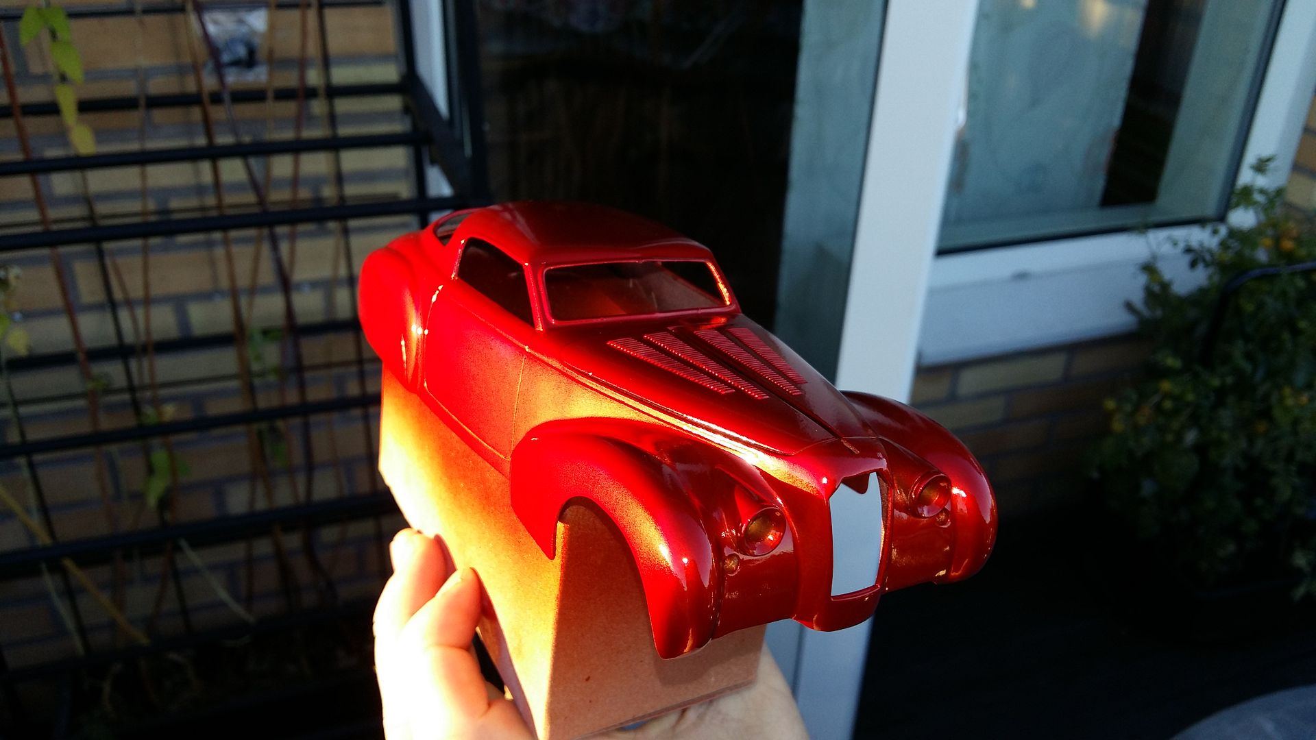 Bumblebi Posted September 17, 2016 Author Posted September 17, 2016 Final preparations are being made for paint on the body, there's only some wetsanding of the primer left to do. While waiting for it to completely harden, I decided to test out the paint I'll be using, which is a candyred with goldchrome in the base and transparent, red taillight paint on top. Looks pretty good on the scrap piece I tested on!