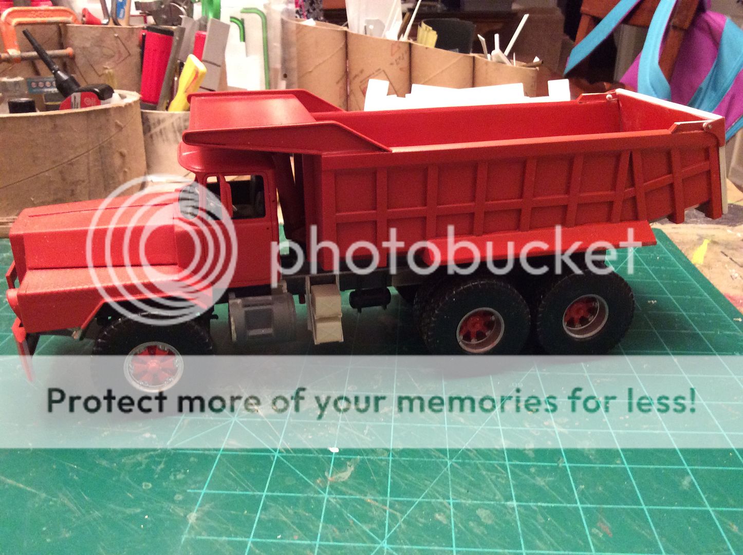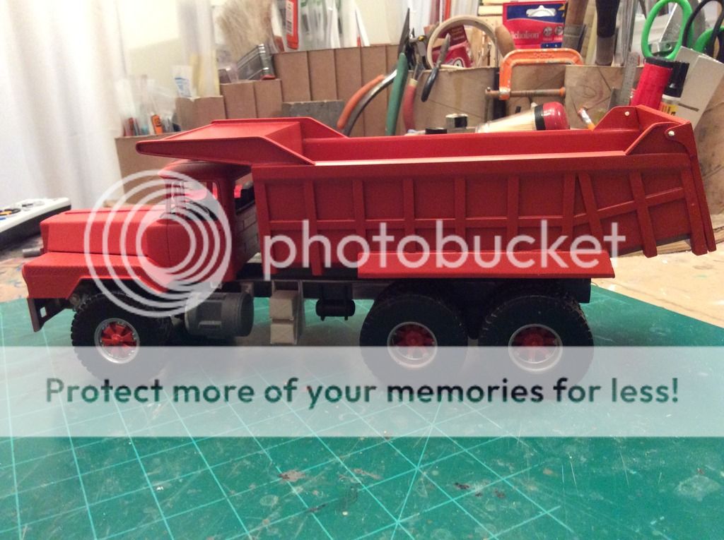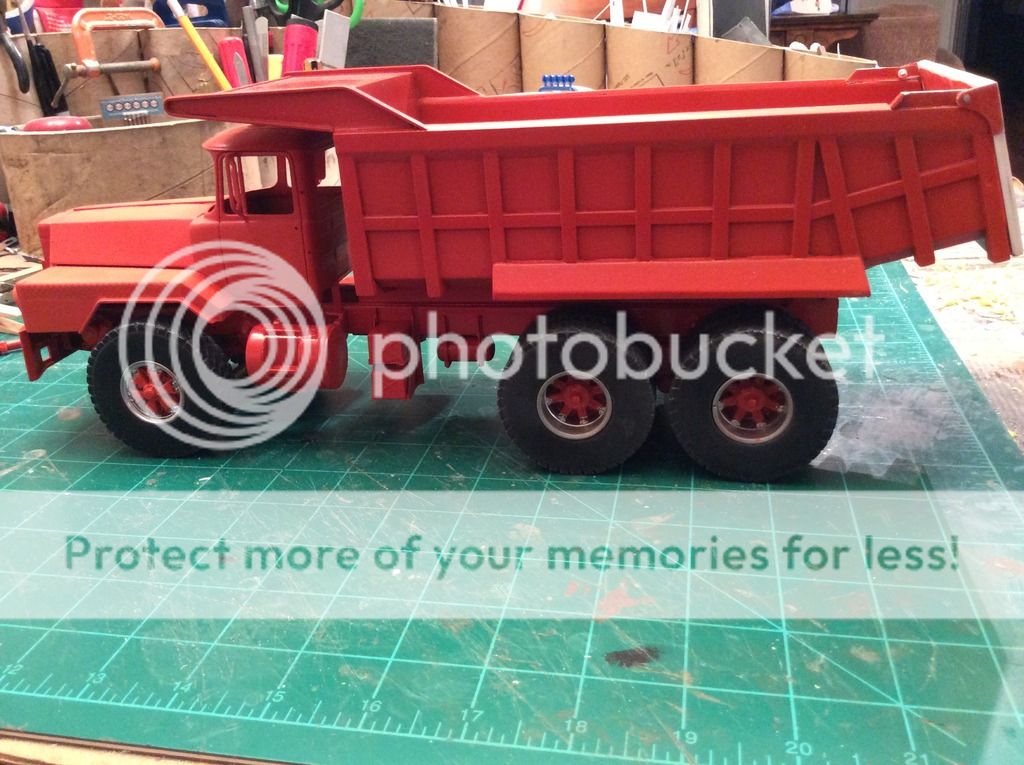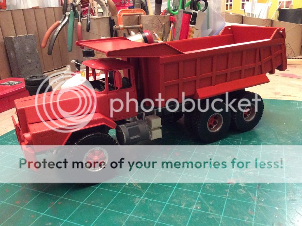 Superpeterbilt Posted June 10, 2016 Author Posted June 10, 2016 After much sanding, a paint mishap, stripping it, and more sanding, I finally got some paint on the dump body. I still just have some chassis details to finish up such as, brake cans,drive shaft, steering linkage, and a few other things. I made a rock guard for the engine using brass strip and styrene sheet.