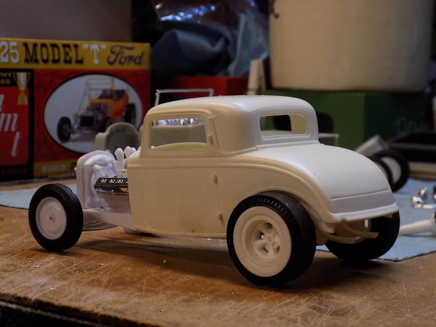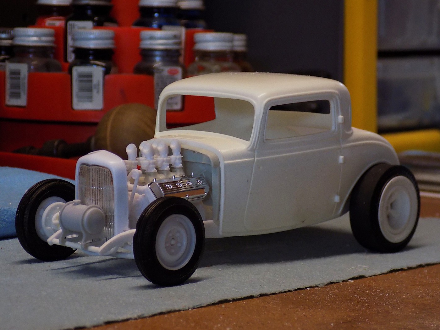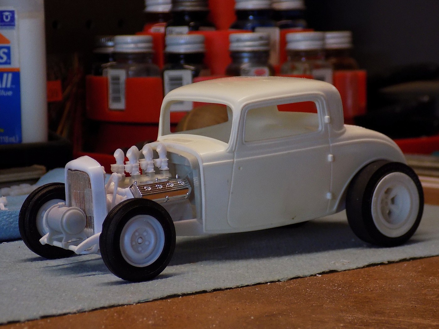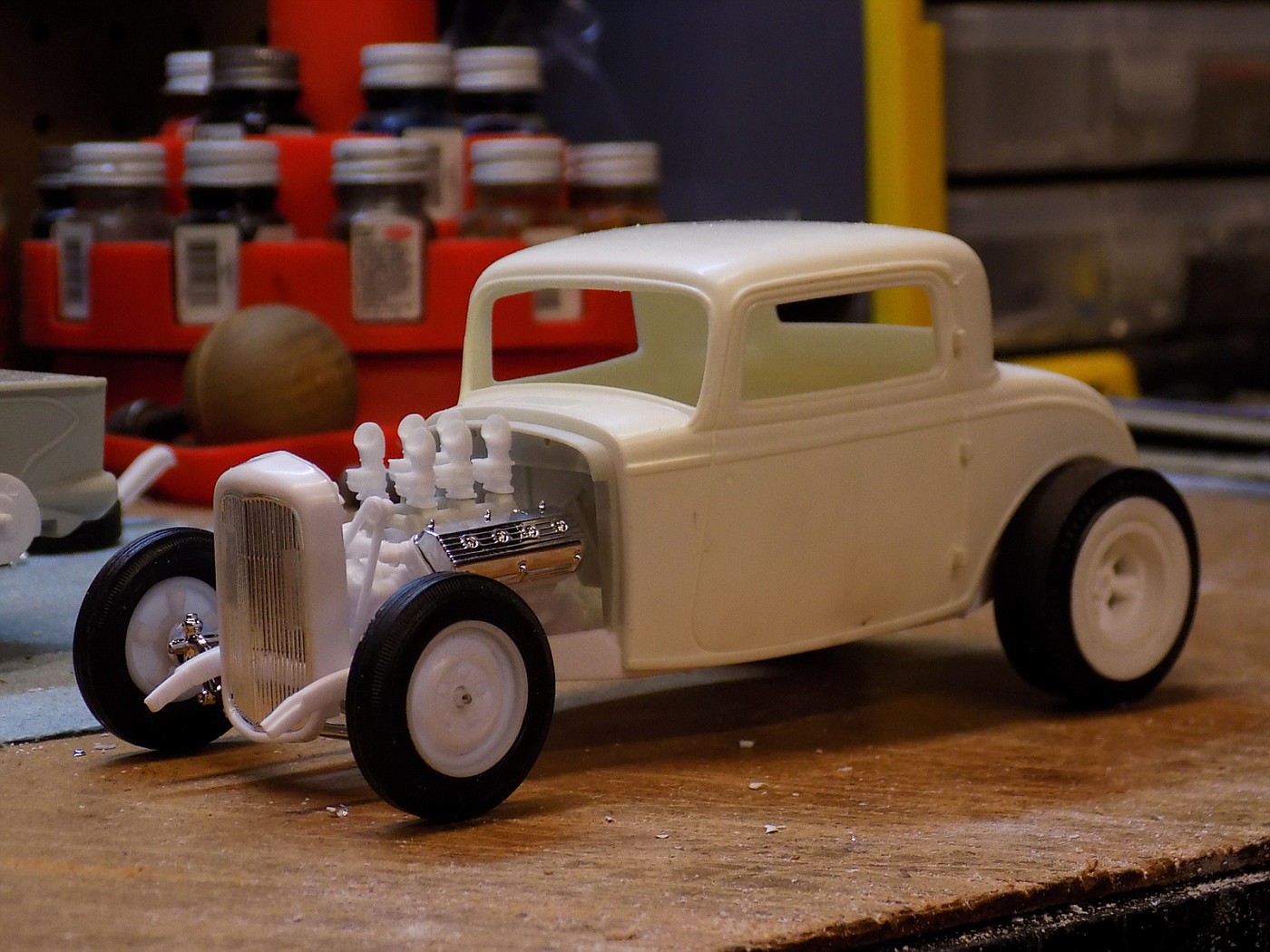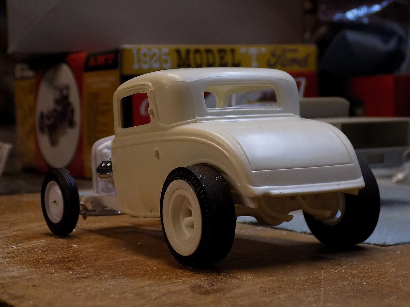 Dennis Lacy Posted May 2, 2016 Posted May 2, 2016 Most of my projects these days get pretty heavily involved so once in a while it's nice to take a break from all of that and do a straight forward, simple project to get something in the display case. This one came to be after grabbing a complete Revell '32 5-Window chassis parts lot off of the auction place for a whopping(!) 8 bucks. I had a spare 3-Window body kicking around so I decided to combine the two. The body has been channeled the thickness of the frame and I replaced the modern looking firewall with the more retro looking piece from AMT's '32 Phantom Vicky which is also recessed but has stock style raised bead design on it. The radiator shell was notched to drop it down yet still sit on the front cross member and the radiator was chopped to match. The chassis will be right out of the box, no lowering or anything. The only modification is the removal of the stock gas tank and shortening of the rear frame rails to work with the channeled body.The front wheels are from the 5-Window but have been narrowed to fit into the bias-ply tires from Revell's Ed Roth Beatnik Bandit. The rear wheels and slicks are Monogram 'Lil Coffin show rod adapted to the kit axle. I'll also be ditching the kit disc brakes in favor of early Ford drum brake plates. Interior will get the '40 dash and tuck & roll seat from the 5-Window with scratch built inner door structure instead of upholstery panels. Engine is the Chrysler Hemi from the 5-Window but will get the M/T valve covers with Moon breathers from Revell's Mazmanian Willys and parts box log manifolds with 6 carburetors from Revell's Ed Roth Tweedy Pie. Hosted on Fotki Hosted on Fotki Hosted on Fotki Hosted on Fotki Hosted on Fotki So, just in the early stages right now. More detail work to come.