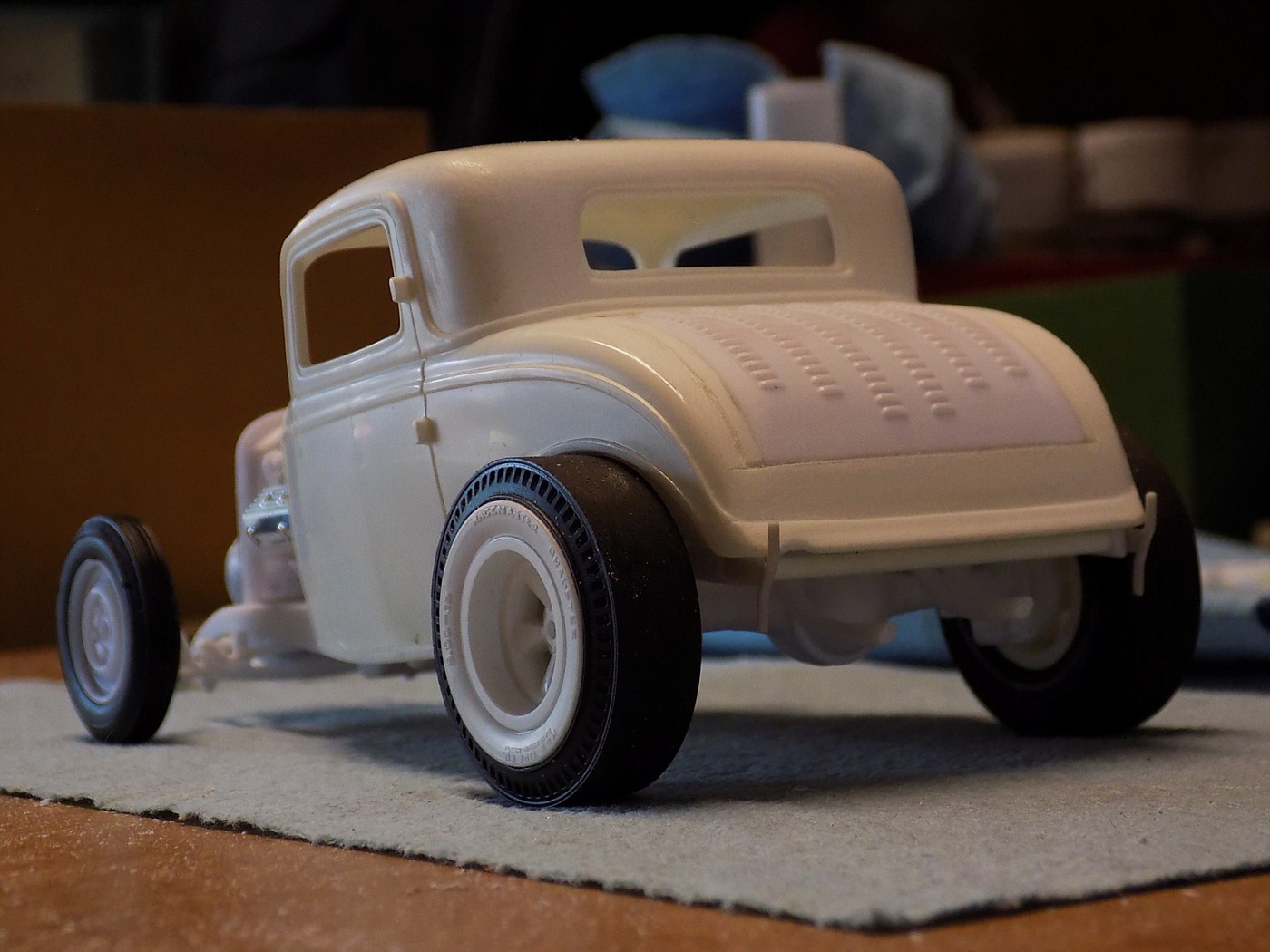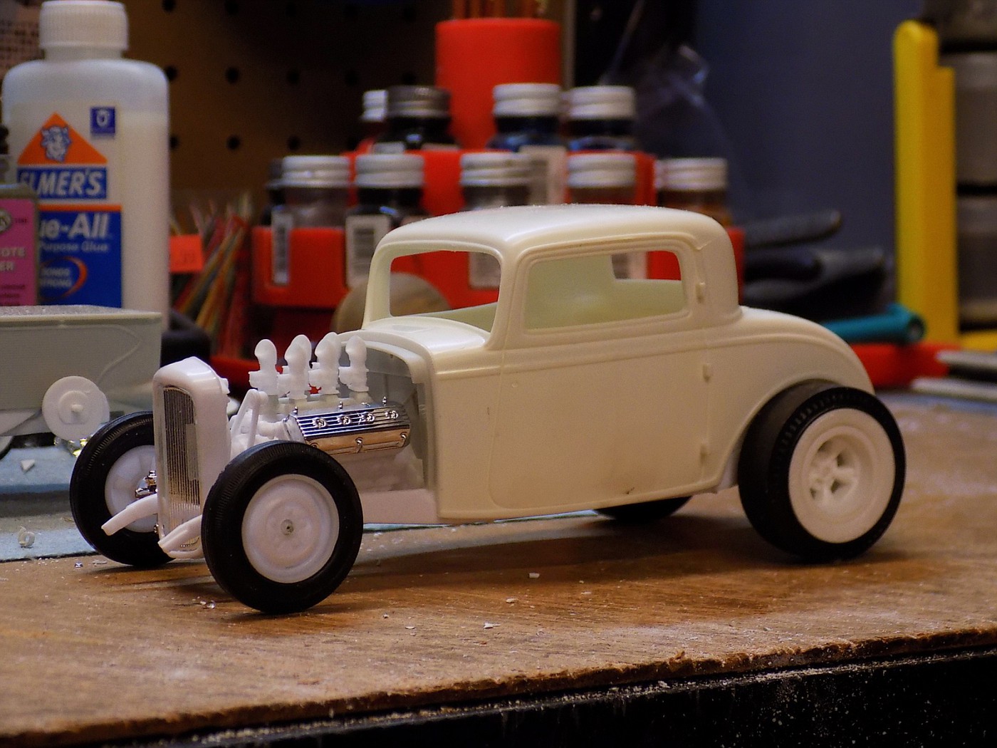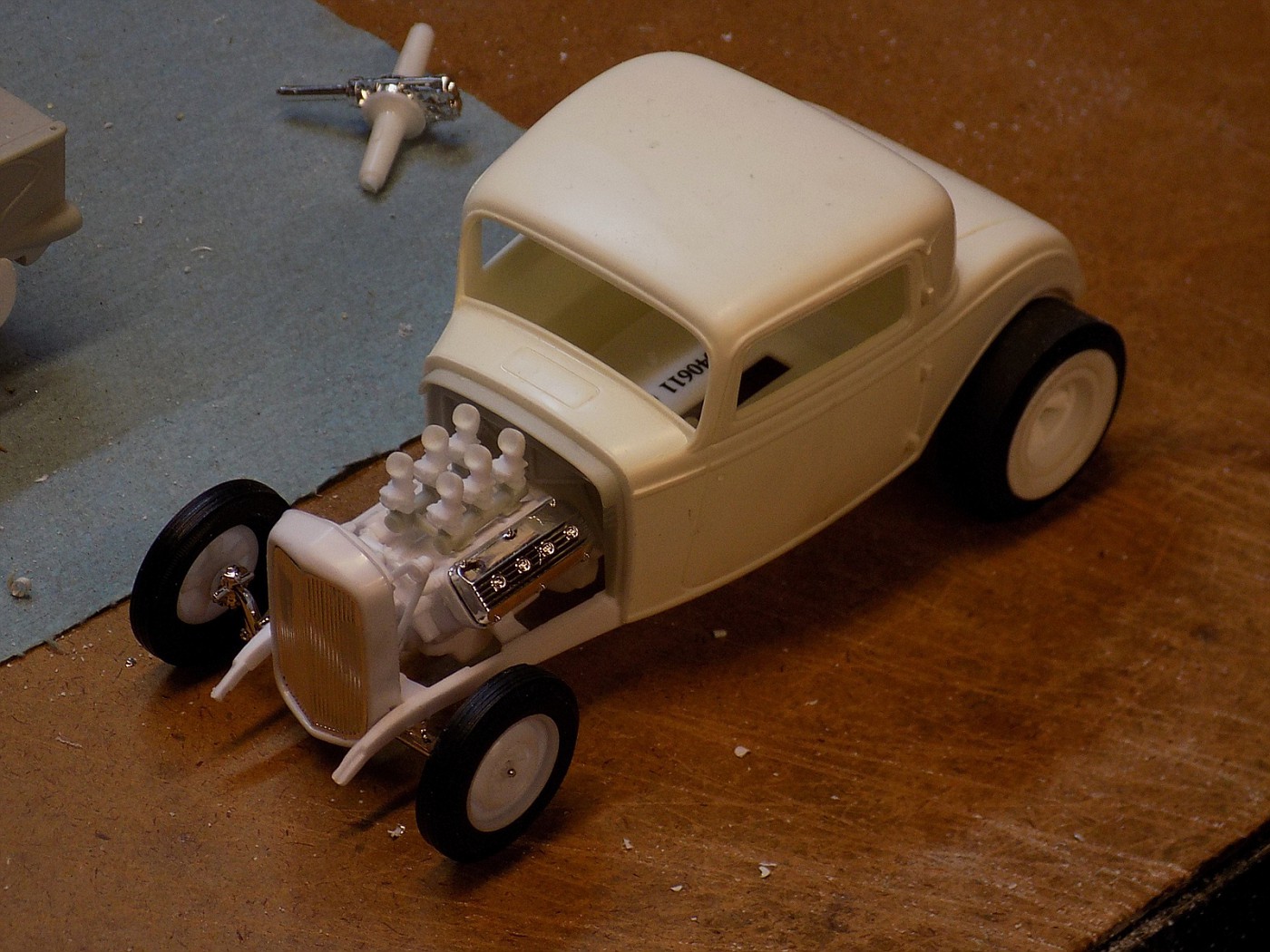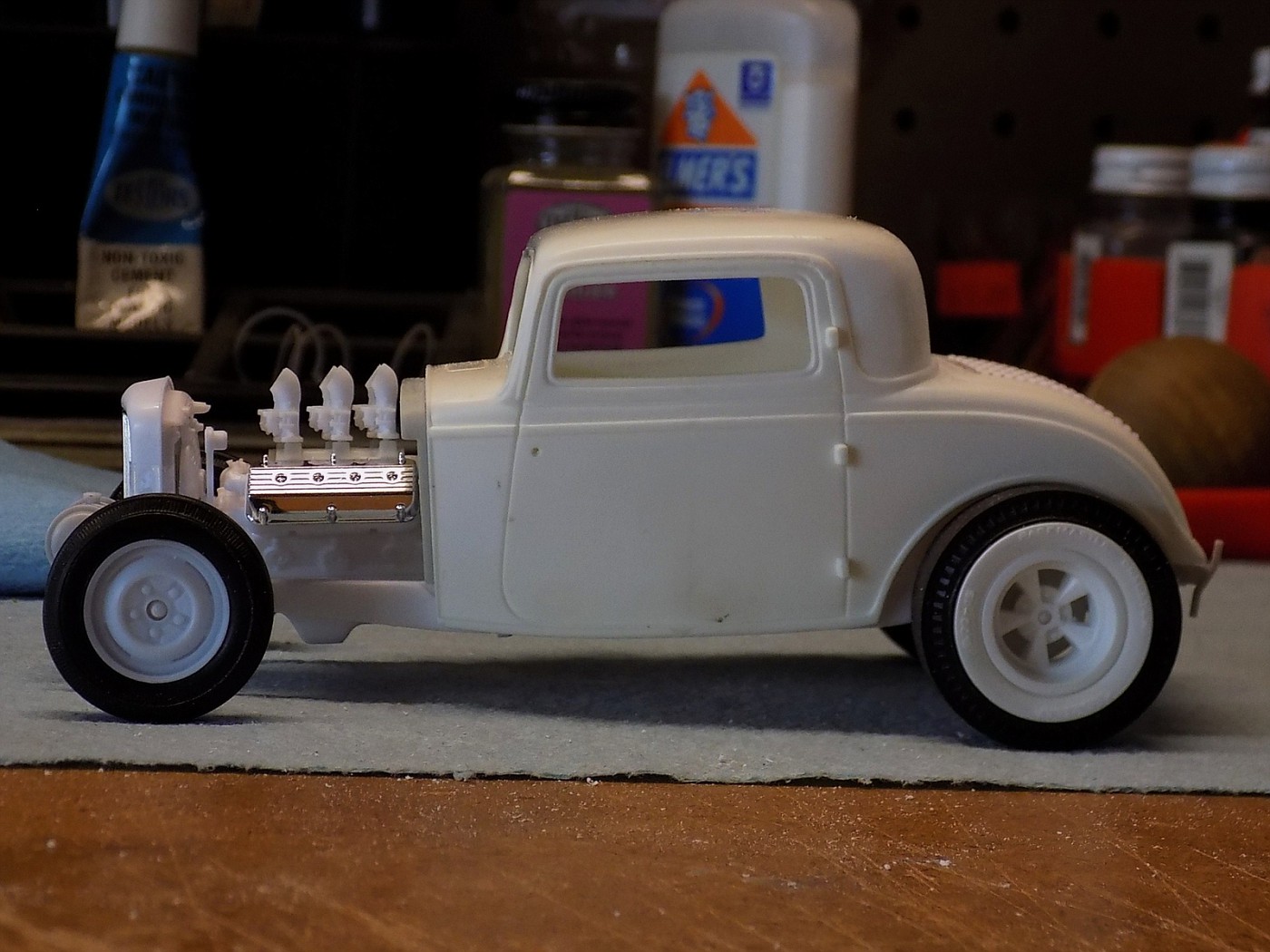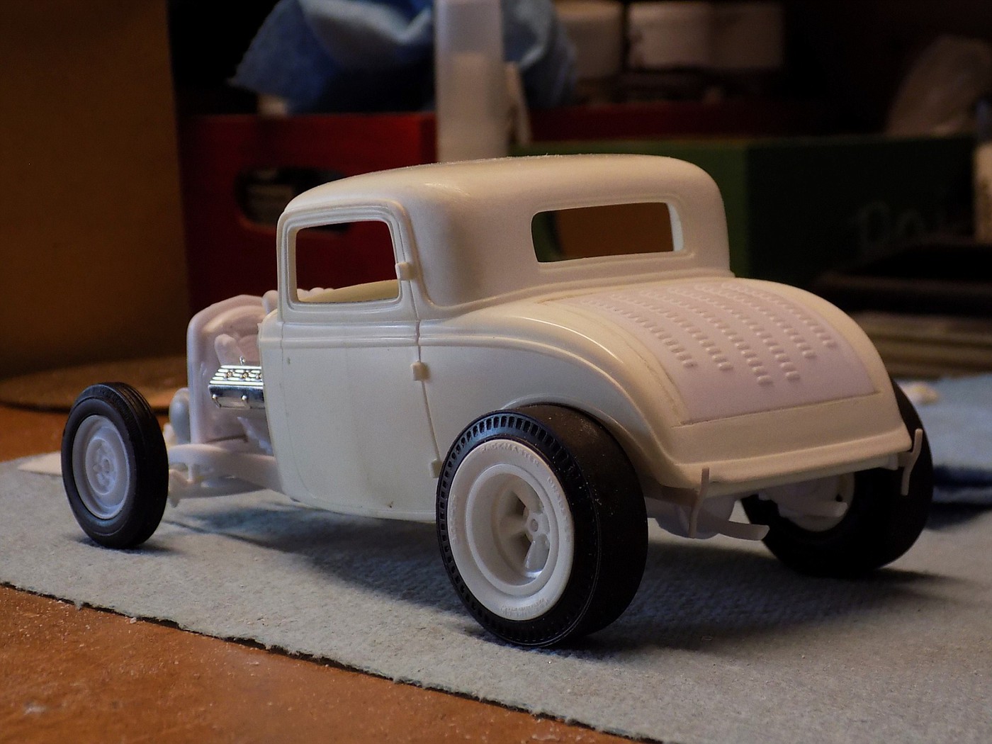 Dennis Lacy Posted May 2, 2016 Posted May 2, 2016 Most of my projects these days get pretty heavily involved so once in a while it's nice to take a break from all of that and do a straight forward, simple project to get something in the display case. This one came to be after grabbing a complete Revell '32 5-Window chassis parts lot off of the auction place for a whopping(!) 8 bucks. I had a spare 3-Window body kicking around so I decided to combine the two. The body has been channeled the thickness of the frame and I replaced the modern looking firewall with the more retro looking piece from AMT's '32 Phantom Vicky which is also recessed but has stock style raised bead design on it. The radiator shell was notched to drop it down yet still sit on the front cross member and the radiator was chopped to match. The chassis will be right out of the box, no lowering or anything. The only modification is the removal of the stock gas tank and shortening of the rear frame rails to work with the channeled body.The front wheels are from the 5-Window but have been narrowed to fit into the bias-ply tires from Revell's Ed Roth Beatnik Bandit. The rear wheels and slicks are Monogram 'Lil Coffin show rod adapted to the kit axle. I'll also be ditching the kit disc brakes in favor of early Ford drum brake plates. Interior will get the '40 dash and tuck & roll seat from the 5-Window with scratch built inner door structure instead of upholstery panels. Engine is the Chrysler Hemi from the 5-Window but will get the M/T valve covers with Moon breathers from Revell's Mazmanian Willys and parts box log manifolds with 6 carburetors from Revell's Ed Roth Tweedy Pie. Hosted on Fotki Hosted on Fotki Hosted on Fotki Hosted on Fotki Hosted on Fotki So, just in the early stages right now. More detail work to come.