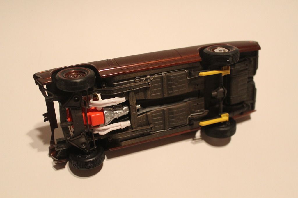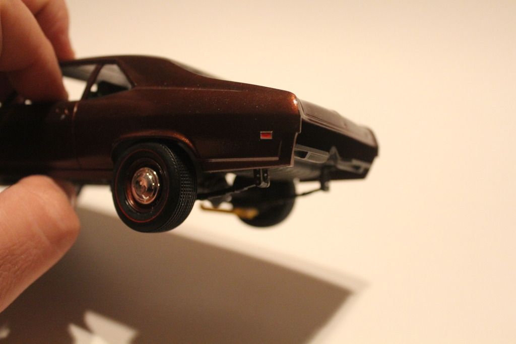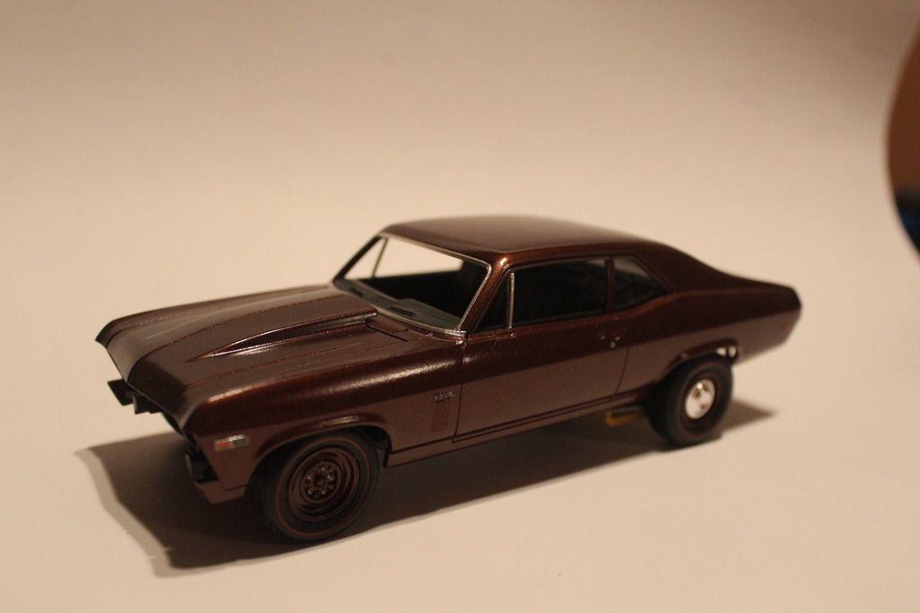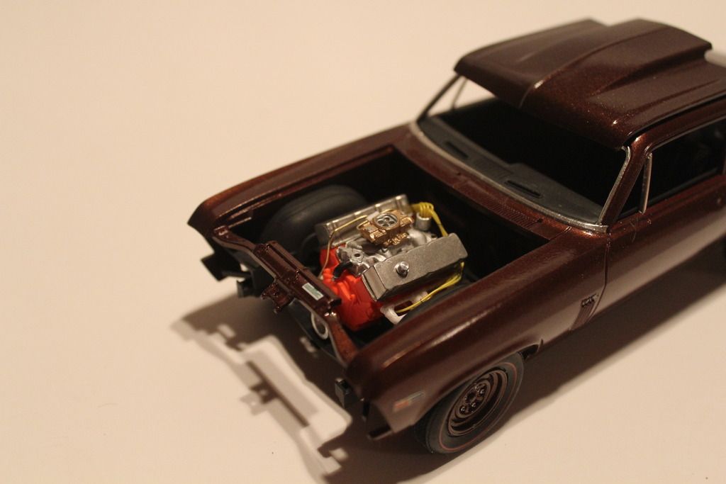 mademan Posted May 30, 2016 Posted May 30, 2016 Ive been working on this Copo Nova for sometime now, doing some detailing here and there. I added some MAS aluminum tall valve covers to the kit 427, and changed out the intake and carb. Added a pre-wired distributor and started on fuel lines etc. The car is painted in Burnished Brown; ive always liked the oddball colors and am a fan of browns. Tires are AMT parts back redlines with kit wheels. I made shackles out of strip styrene to bring the back end up rather than using the generic lift blocks that the kit supplies. I also robbed some traction bars from a Camaro kit they still need to be repainted.