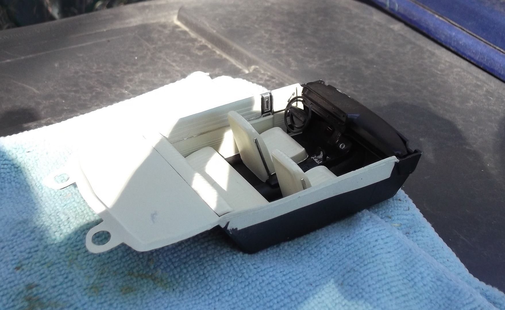 I finally finished doing the detailing on the seats, panels and console. The interior is reasonably accurate, though somewhat faintly engraved, in spots. The only thing completely absent was the trim around the seats, which I simulated with some evergreen strips. The dash and steering wheel are next, then assembling the chassis. The chrome on the bumpers will need to be redone, but I have a plan. ;)