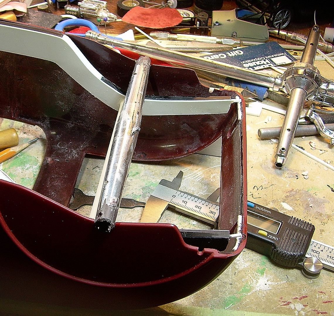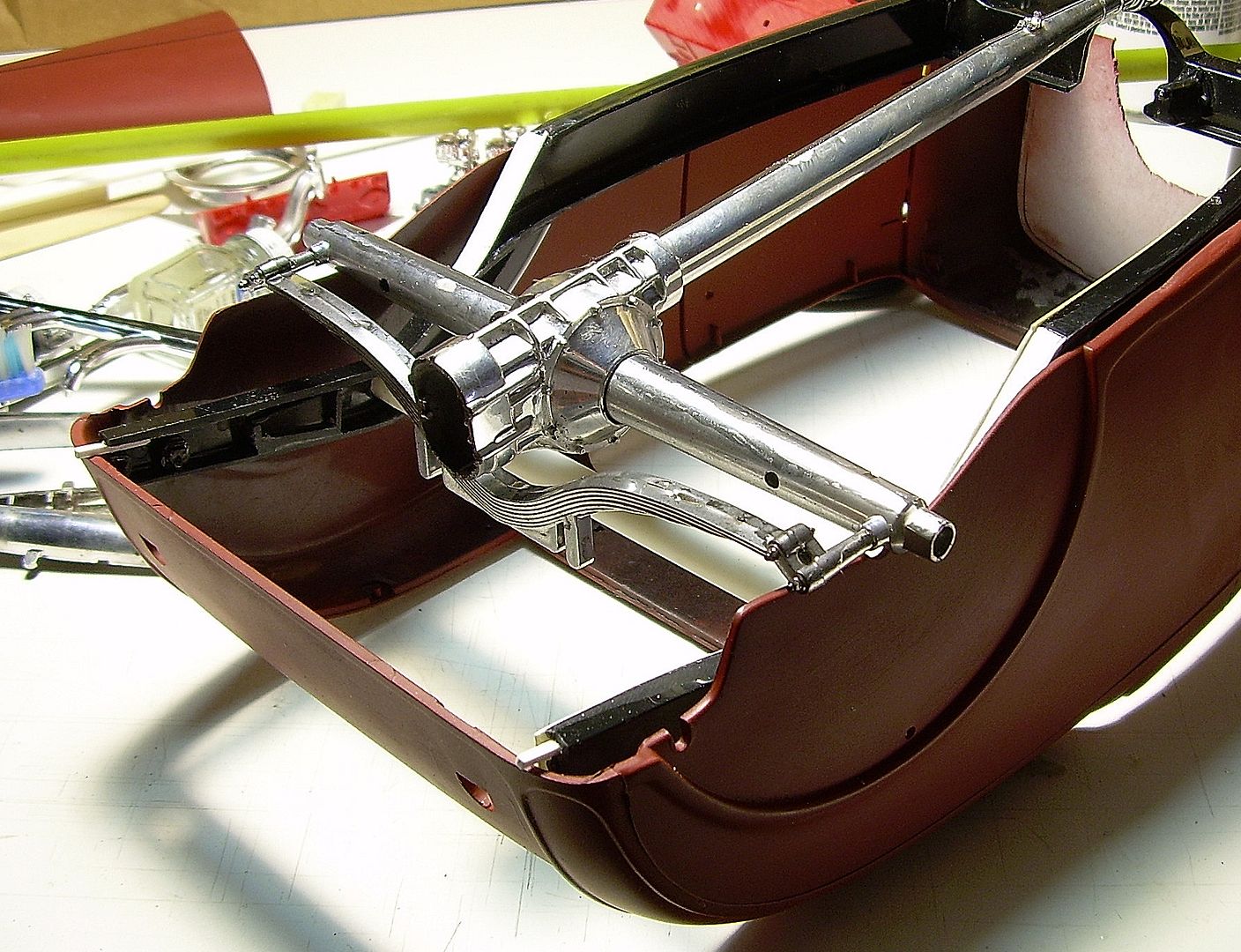 Ace-Garageguy Posted October 13, 2016 Author Posted October 13, 2016 (edited) I added a tubular rear crossmember to stabilize the rails and provide a rear mount for the trunk floor. The rear main (spring-carrying) crossmember is going in next, so we need something to keep the rear of the rails square and prevent them from spreading. We determined earlier, with the nasty old axle, exactly where the axle has to go relative to the body and frame to get the stance we want. Little jigs were made up from styrene stock to insure the location of the axle was maintained precisely, and the NEW axle was swapped into the position the old axle had established. This new axle, glued temporarily to the body, is now used as the fixture to align and glue in the main rear crossmember, with its spring attached. The white pads on the ends of the black main crossmember (shown earlier) were carefully filed and fitted to let the assembly just slip between the rails...just tight enough to allow liquid glue to penetrate and 'weld' it in place as it's held by the axle / spring fixture. We are now guaranteed that the rear of the car will sit on the spring and suspension exactly as it did during the mockup phases. Once everything has hardened up, the good axle will be removed again, and the inner wheel-wells hogged out to provide suspension working clearance, as they will no longer be necessary as fixtures. The car can then sit on its rear spring in the final position, while we make up the new shock mounts. Edited October 13, 2016 by Ace-Garageguy 1
