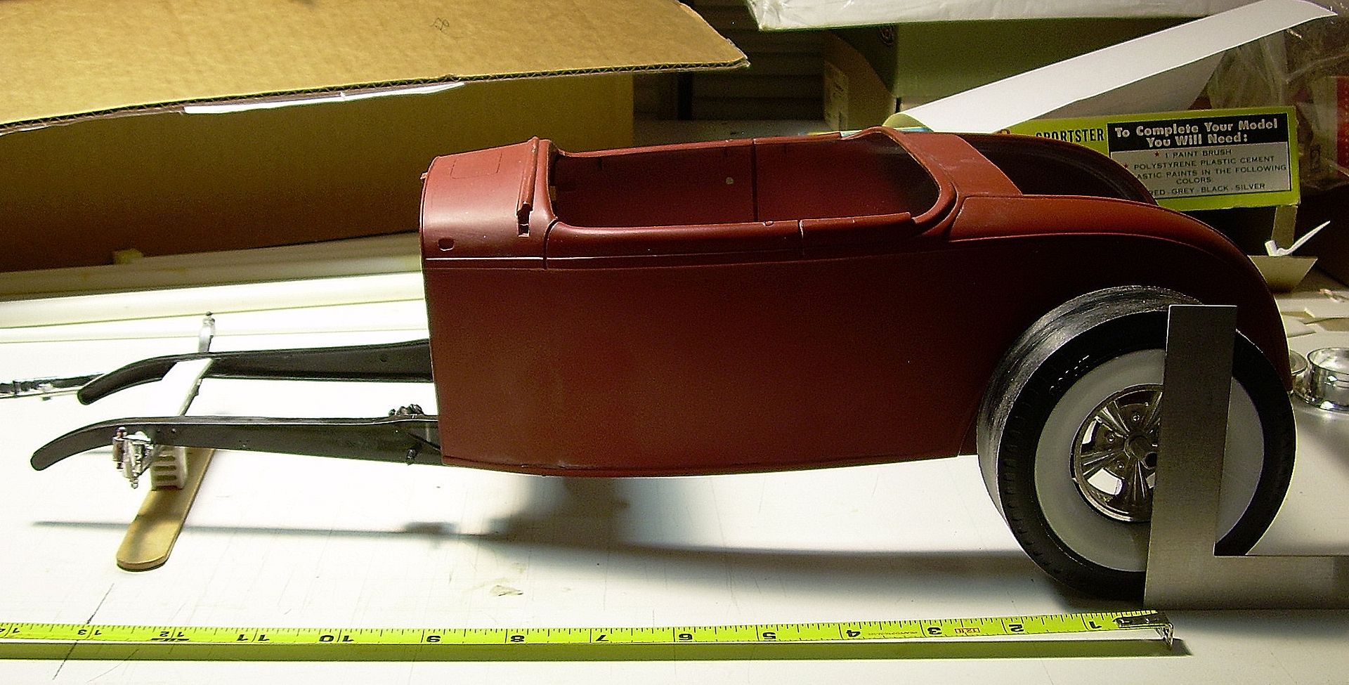 Ace-Garageguy Posted October 11, 2016 Author Posted October 11, 2016 This is the rear crossmember, salvaged from the gluebomb chassis. I had to cut the ends off to get it out of the frame (half a tube of glue), and even though I've narrowed the frame a tick to be able to channel the body over it, I've added material to the ends of the crossmember so I'll have something to fit and fill gaps when I put it back in where it will have to go to carry the rear spring correctly. We'll be using the quick-change from the big Deuce kit (it will be modified), so we need to figure out where the crossmember needs to go back in to get the spring in the right place. Once again, just like a real hot-rod build. We have a fair idea of where the axle has to go to get the stance we want, so we're using a carpy axle from the gluebomb glued to notches in the inner fenders to check location. Mocking up again, and checking the wheelbase relative to the rear axle centerline, with the body positioned (and glued lightly) correctly on the frame. With the rear tires on the car, the tail was a tad low, and the front axle ended up slightly too far forward. (The wheelbase on a '32 Ford is supposed to be 106". Even though I will lengthen it slightly on this car, I like to start with things in the right places FIRST, and then go on to modify.) It took a little juggling and re-positioning of the axle to get the right rear height and wheelbase. Taking the time to get things right at this stage will pay off in the end, with a killer stance and just-right proportions (things that a lot of rushed builds often miss).