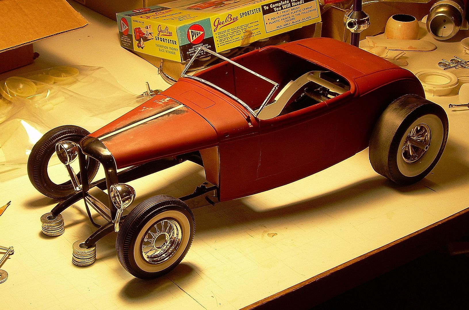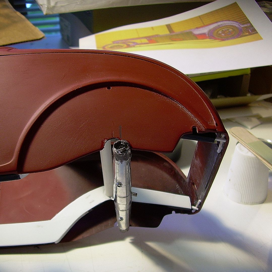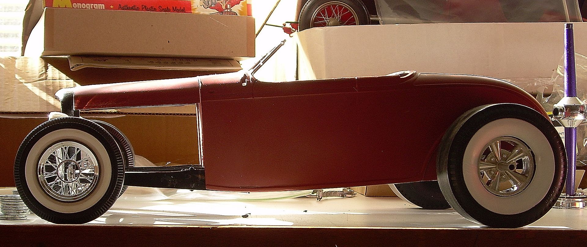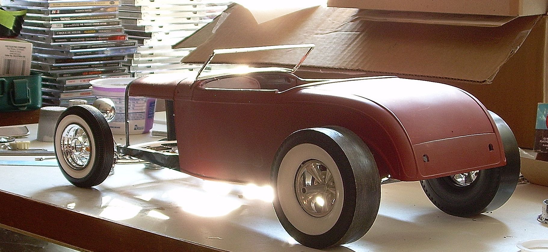 Ace-Garageguy Posted October 13, 2016 Author Posted October 13, 2016 (edited) The hood is getting its hinge slot filled to look like a one-piece custom unit, quite common on rods of all periods. I also almost always kick the bottom of the radiator shells on '32 Fords slightly forward a tick. Without doing this, non-fendered cars usually look (to me) like they're about to trip on their tongues. This is accomplished initially by adding material to the radiator shell where it contacts the corners of the hood. The gluebomb front axle lost the little buttons that function as kingpins when I disassembled it, owing to a little extra glue applied by the previous owner. Guess he wanted to make sure it didn't come apart at 400MPH. Anyway, I'm drilling out the axle ends to accept real brass kingpins to make assembly of the backing plates easier and more prototypical, and to make the entire front end more stable and less jiggly. The underside of the glooey rear crossmember needed the locating holes for the rear spring drilled out, as they'd also snapped off in place due to way excess solvent melt. I opened them up to fit the locating pins on a virgin spring nice and tight. This will be important a little later. A clean non-buggered rear spring is now mounted to the crossmember... ...and test-fitted to a clean, non-buggered axle along with the old QC center section. The NEW axle and spring will function as a fixture to insure the rear crossmember goes in exactly the right place to give us the ride-height and axle location we decided on earlier. Edited October 13, 2016 by Ace-Garageguy