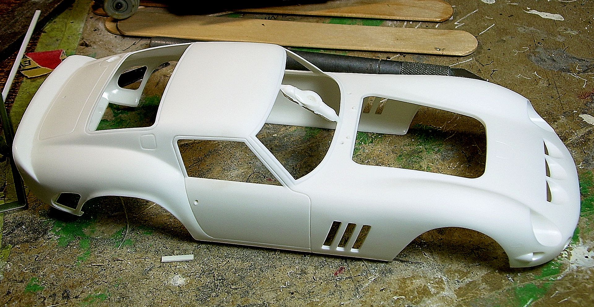 Ace-Garageguy Posted June 17, 2020 Author Posted June 17, 2020 (edited) It's been a while on this one, but I've been doing some testing, learning how to deal with some problems, etc. I tried a couple of different methods of shooting the body with HOT self-etching primer, in part because I'd wanted to leave her in chromate green through the build process. And she crazed like crazy no matter what I did. Even though this particular kit misses the accuracy mark in a few places, overall I just prefer this rendition of the 250 GTO to even the real one...except that odd rear wheel arch. Adding material in the form of .030" strips... While that was setting up, I started addressing the wheels I want to use. They're 1/25, and fall through the 1/24 tires I want. Solution: a strip of .020 styrene around the rim. And it's OK. Some of the earlier Americans had really thick looking rims. After painting, they'll look close enough to possible period-correct for this build. Raised lettering is being removed from the tire as well. Took some more experimenting to get that working 100%, too. Sculpting and rounding the first wheel arch...and the primer crazing is really apparent here. This is a fairly expensive kit, and giving up on it wasn't an option I liked. About done with the first phase of the wheel arch mod... Edited June 17, 2020 by Ace-Garageguy