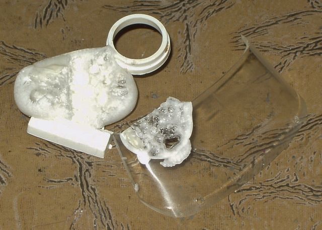 Snake45 Posted October 11, 2016 Author Posted October 11, 2016 Here's the liberated windshield, with huge hole and fused white stuff in it. I've tried it in the subject body, and looks like there is JUST enough to work with--and looks like it will be a good fit. Cutting it with a razor saw shouldn't be a problem, as long as I get it marked accurately. I was also able to separate the wheel ring, and file it back to usable shape. I could probably save the cylinder head, if I really needed it. The open wheel is melted toast, a real shame--I never have enough of those.