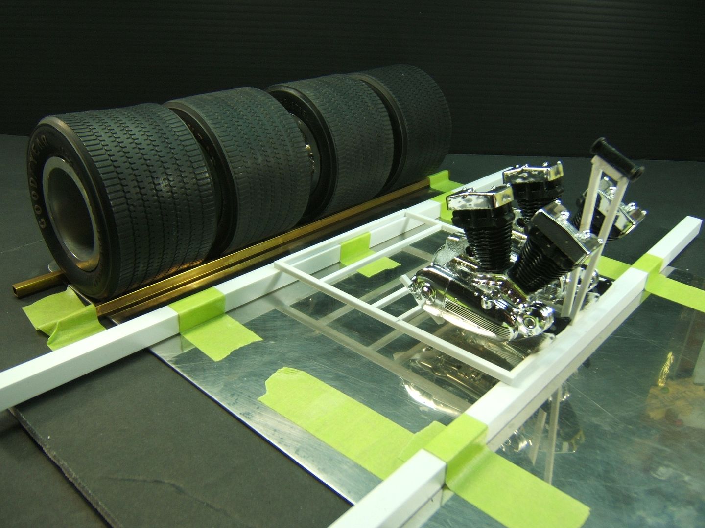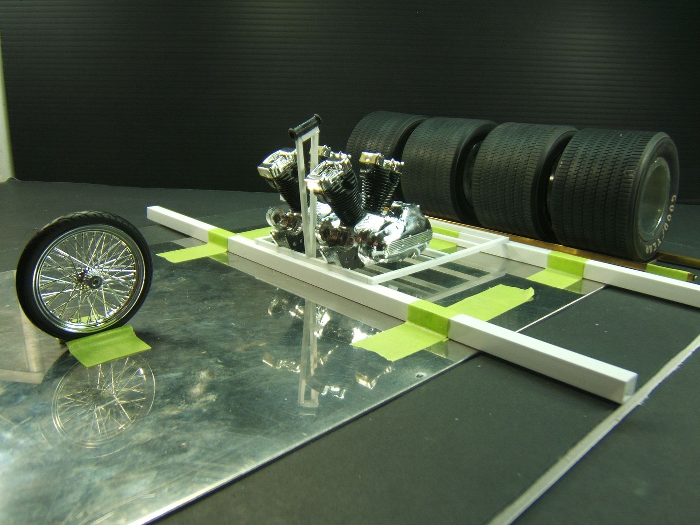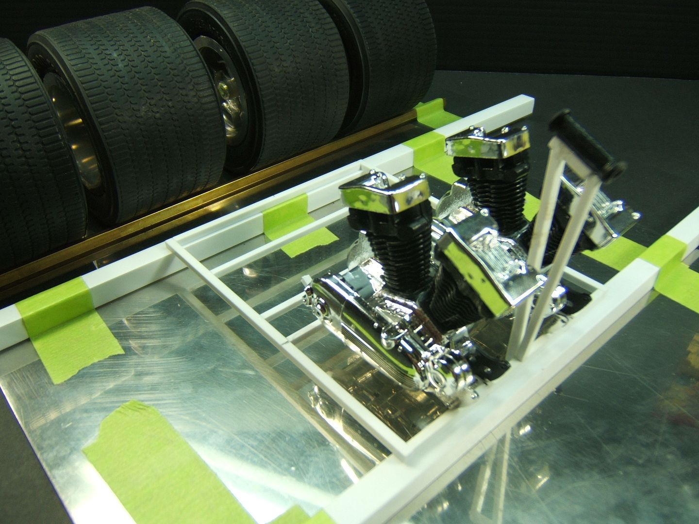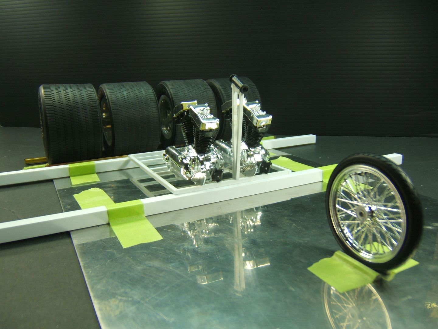 John Teresi Posted November 16, 2016 Author Posted November 16, 2016 Hello......thank you all for the interest in this build......I finally got my 2 Donor kits yesterday 1/8 Scale re-issue MPC Thunder Choppers......I needed the 2 Sporster engines for this build.....but,I can always use the extra parts for something else...........I dug out some old parts box tires from the old Revell 1/8 Evil Iron......that are perfect for this build......I started a mock-up of the frame and mounted the engines.......and spaced the rear tires and front tire.....thanks for looking