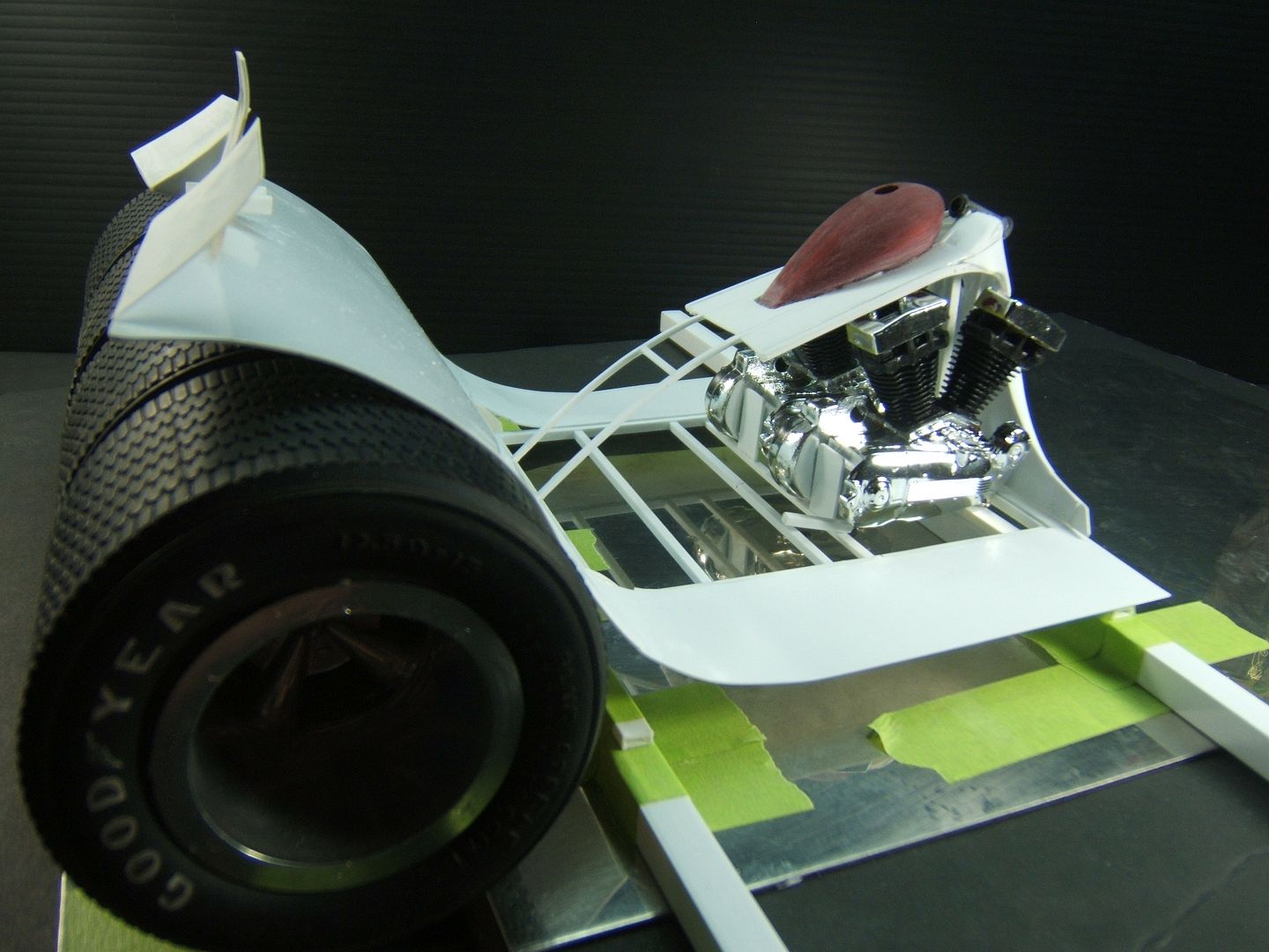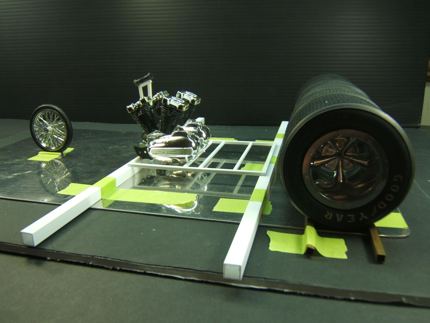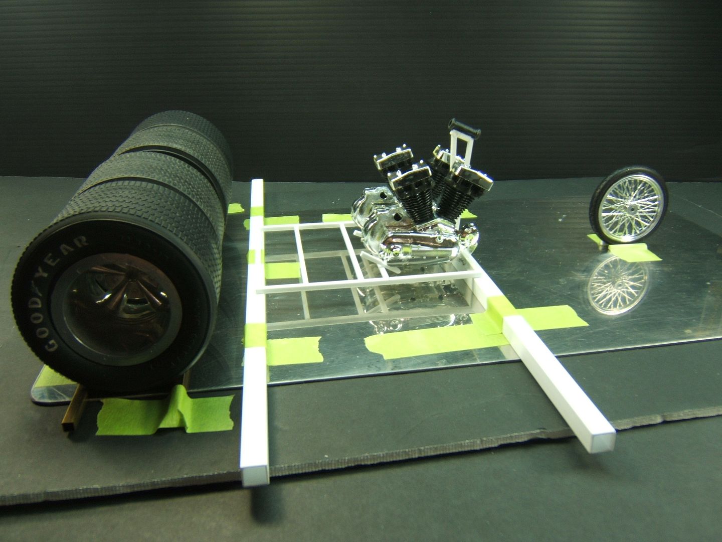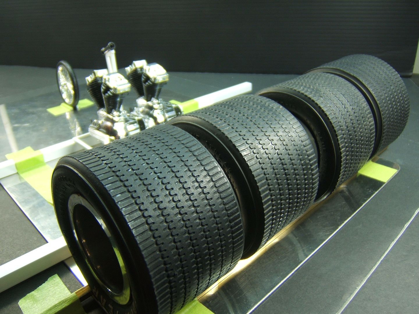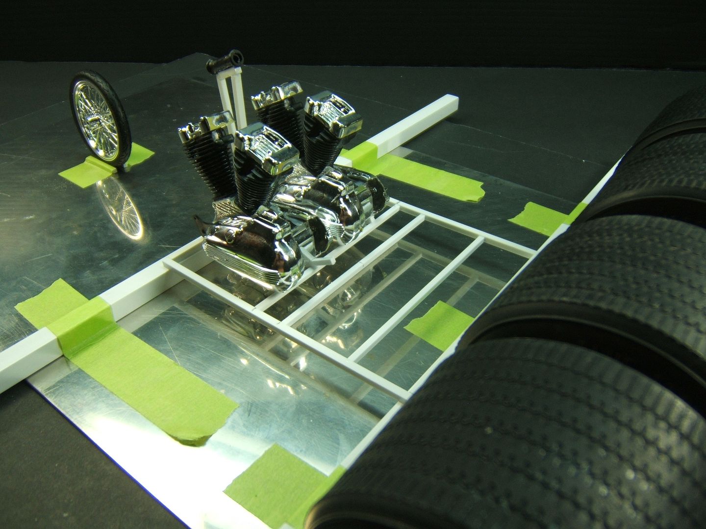 John Teresi Posted November 16, 2016 Author Posted November 16, 2016 Hello......thank you all for the interest in this build......I finally got my 2 Donor kits yesterday 1/8 Scale re-issue MPC Thunder Choppers......I needed the 2 Sporster engines for this build.....but,I can always use the extra parts for something else...........I dug out some old parts box tires from the old Revell 1/8 Evil Iron......that are perfect for this build......I started a mock-up of the frame and mounted the engines.......and spaced the rear tires and front tire.....thanks for looking