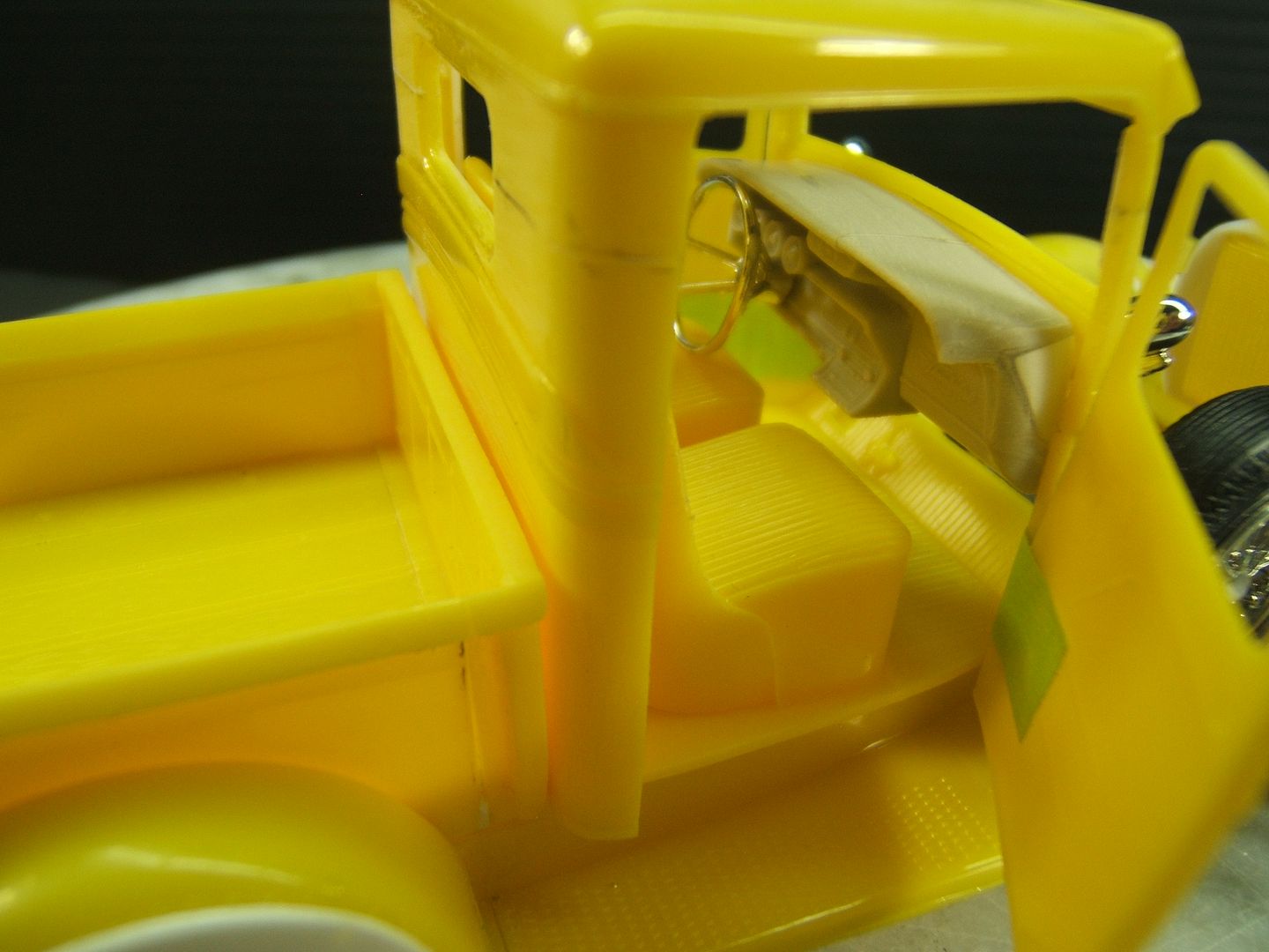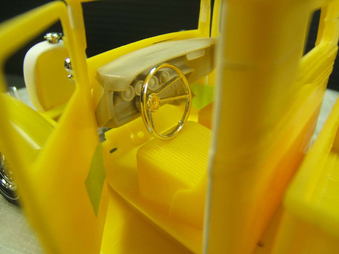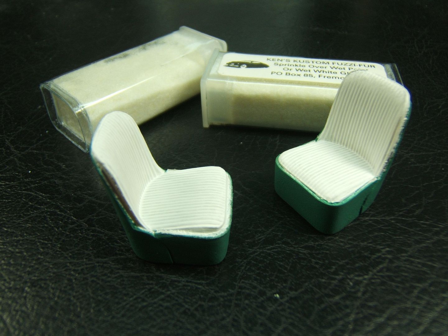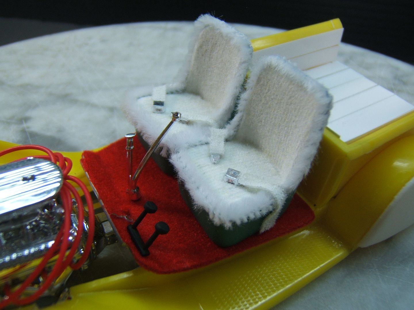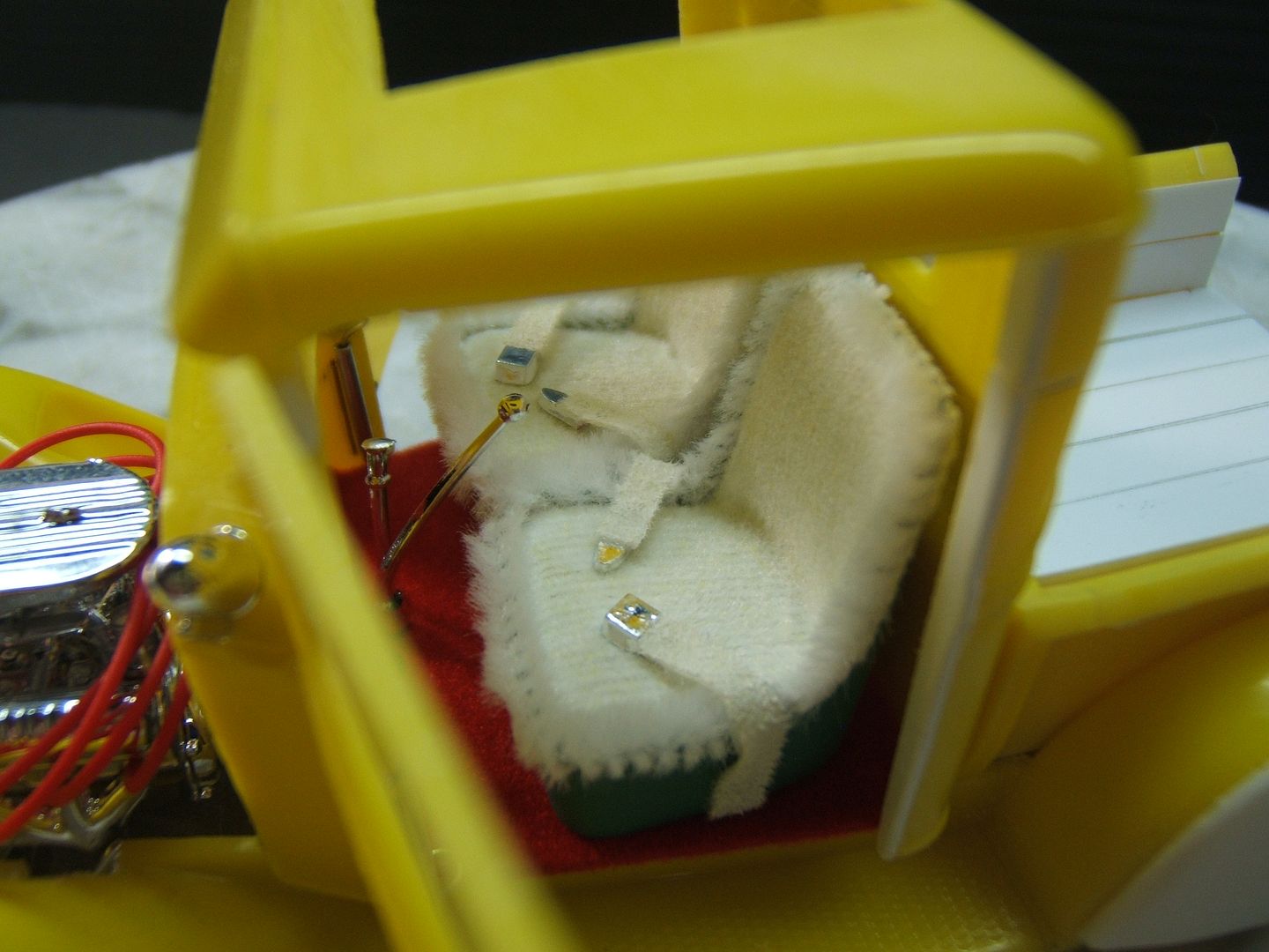 John Teresi Posted February 24, 2017 Author Posted February 24, 2017 Hello.......thank you all so very much for the kind comments.......I really do appreciate them....... I did some work on the interior.......I used some White Naugahyde to upolster the seats and airbrushed the Naugahyde light green......then I flocked the rest of the seat with white Flocking.......then I used white Chenille around the edges of the seat,just like Pete did......I also made some seat belts using the kit buckles and used medical bandage tape for the belt and flocked those in white flocking too......I also flocked the floor board and fire wall with red flocking........and attached the shifter,emergency brake handle and clutch and brake pedals.......thanks for looking