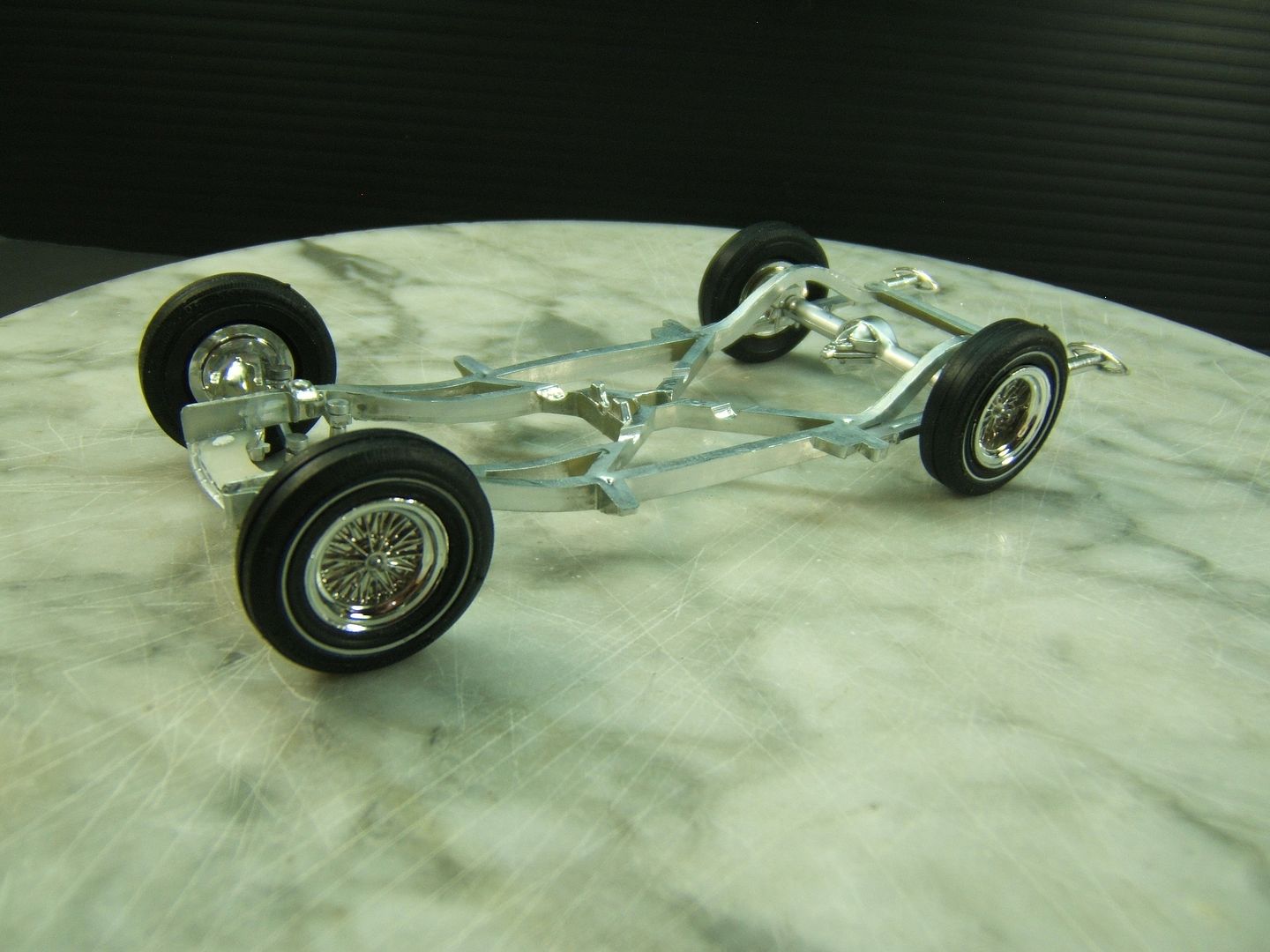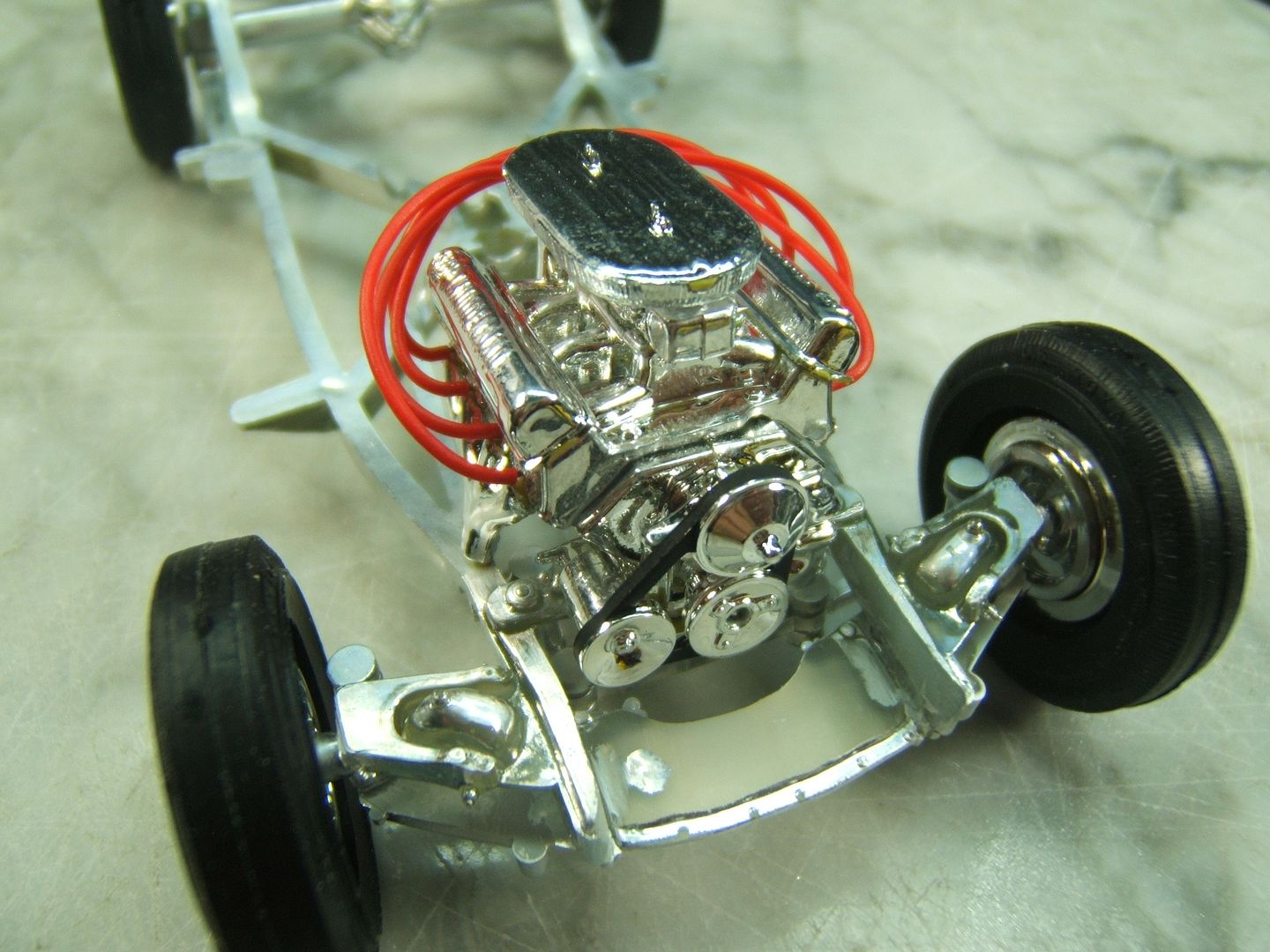 John Teresi Posted February 10, 2017 Author Posted February 10, 2017 Hello.......thank you all so very much for the kind comments.......I really do appreciate them.......I could`nt find a toothbrush bristle cover that Pete used for the radiator /nose cover,so I used 2 Revell 1/12 Chopper gas tanks that I had in my parts box,it worked out pretty good.......I also got the engine assembled and wired......no dis-respect to Pete but,I also used over sized plug wires too,because the Clone program wants a Clone as close as possible to the original model.......so hopefully I will do the model justice .......I also got the frame assembled and mocked-up the wheels.......I dug out a T`bird dash board from my parts box to resemble the one on the original model......I had to modify it to fit.......I also mocked-up the nerf`s on the front and back.......thanks for looking