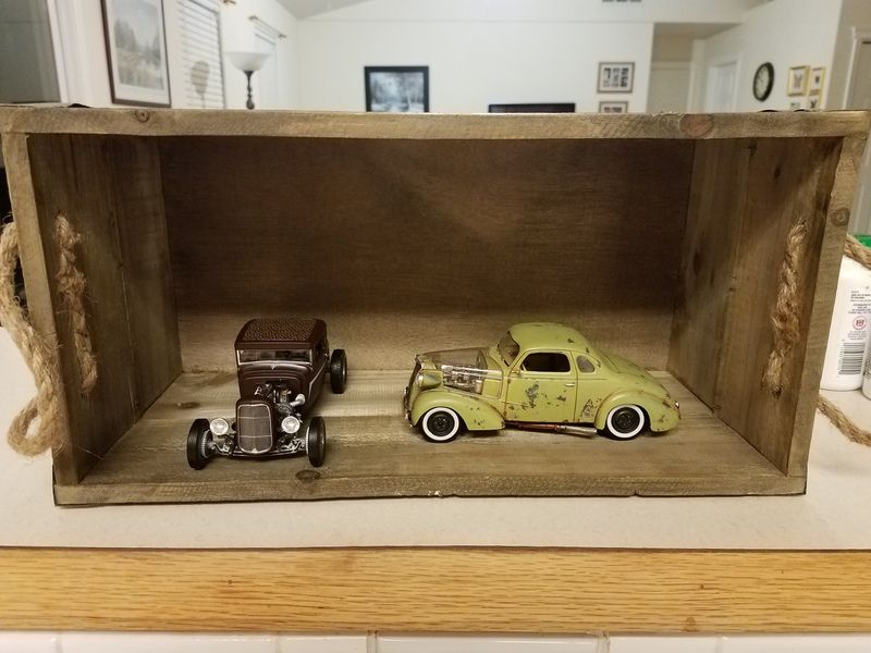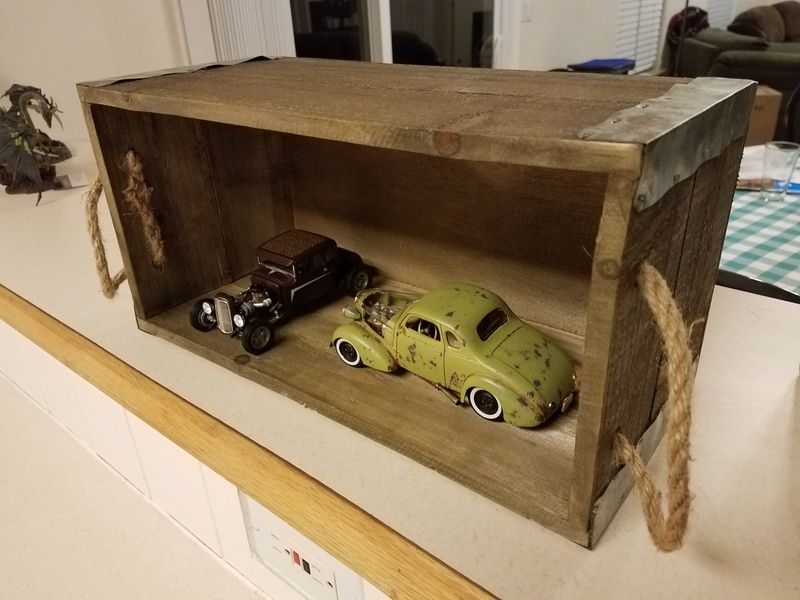 Jantrix Posted March 26, 2017 Posted March 26, 2017 I've been wanting to do a shadowbox dio for a while. I finally found a box. Good size. Plenty of room for two models. Hobby Lobby item, its got a nice patina. In scale, the interior dimensions are 31.2 feet long and 14.5 feet deep and high. The length and depth are no issue, but at 14.5 feet high it's gonna be pretty tall. If my ceiling or bottom of my trusses are at 8 feet that's a lot of wasted space. I want this to represent a stand alone garage, set in the 60's or maybe 70's. So my question is this, would a 10 foot or even 12 foot ceiling be incorrect in a stand alone garage of the time period? Was it done? It's pretty common these days. I seem to remember the garage on our place in Bayshore, N.Y. was cavernous, but I was just a lil guy at the time. Any help would be appreciated.