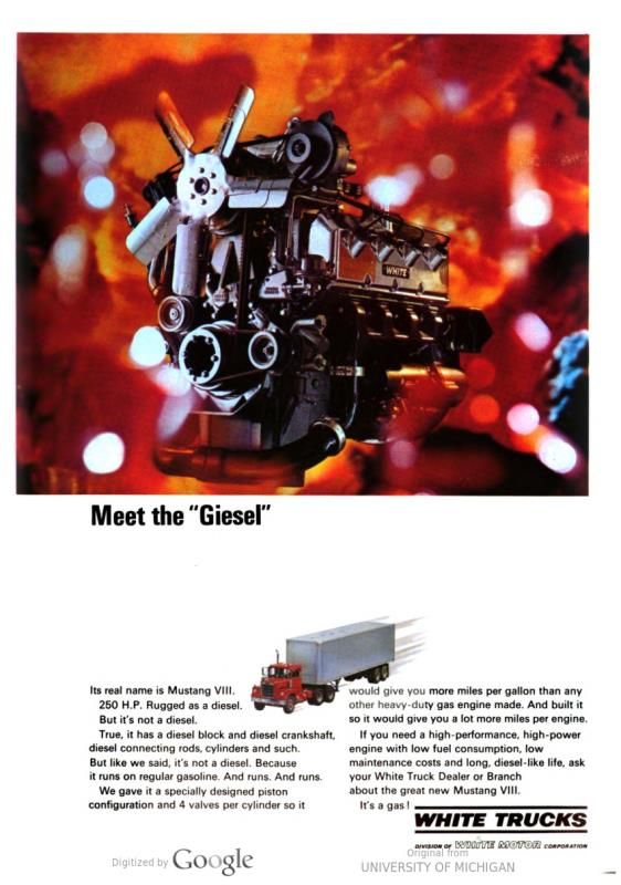 DRIPTROIT 71 Posted April 19, 2017 Posted April 19, 2017 (edited) Back around the late 60's, the White Truck Company converted a Cumminns 185hp Diesel v-8 to a gas engine and called it the Giesel. These were offered in the 9000 series. I am wanting to find some good pictures of one of these engines for a future project. I would also like to know how close in physical size they were to the 903. The dimensions of the Giesel are probably the same as the 555, but I'm not sure how they compare to the 903. Any help or info would be appreciated. Thanks, Brian Edited April 19, 2017 by DRIPTROIT 71