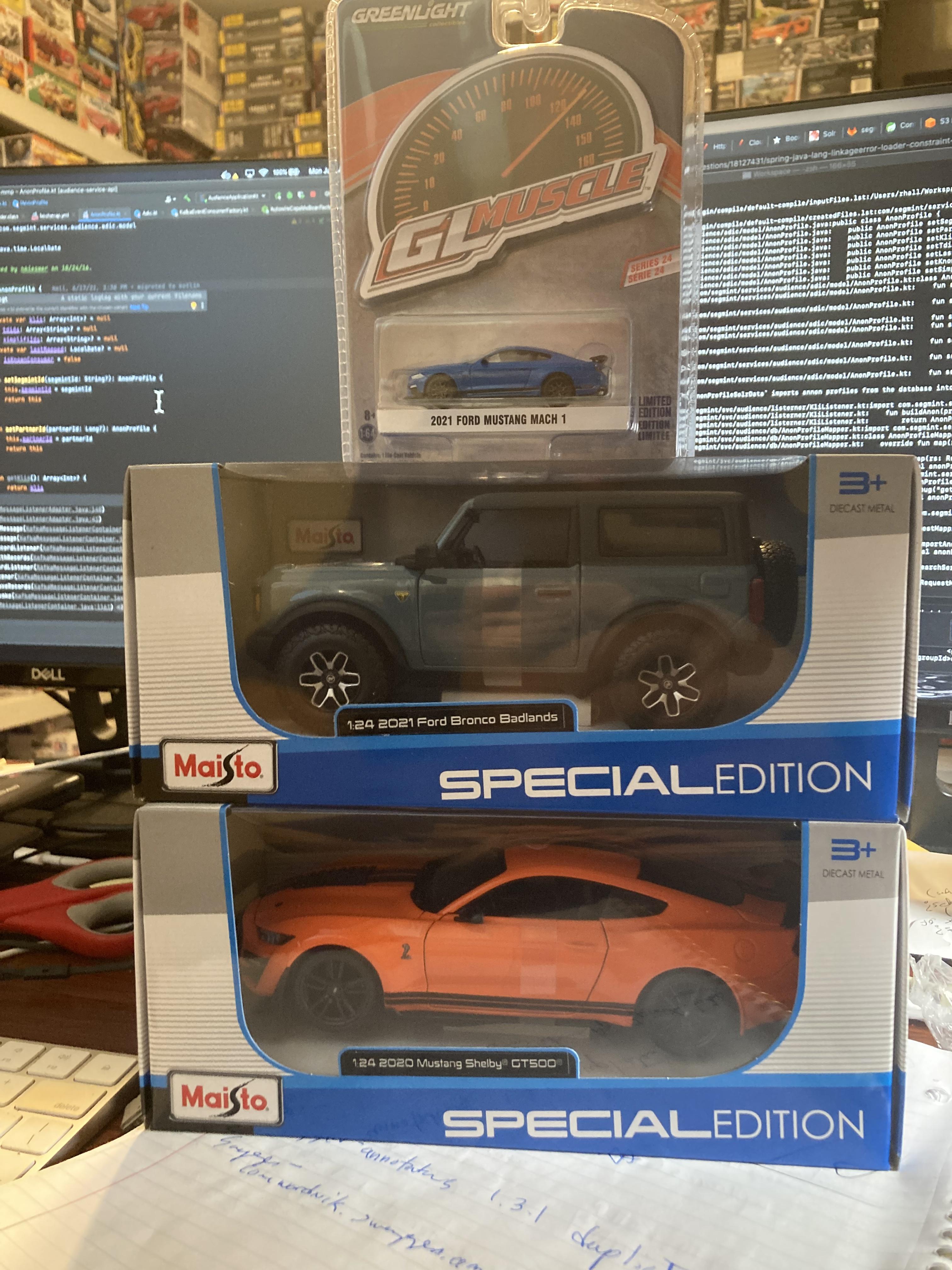 Rob Hall Posted July 26, 2021 Posted July 26, 2021 Maisto 1/24 2021 Ford Bronco and 1/24 2020 Ford Mustang GT500, along with a Greenlight 1/64 2021 Ford Mustang Mach 1.