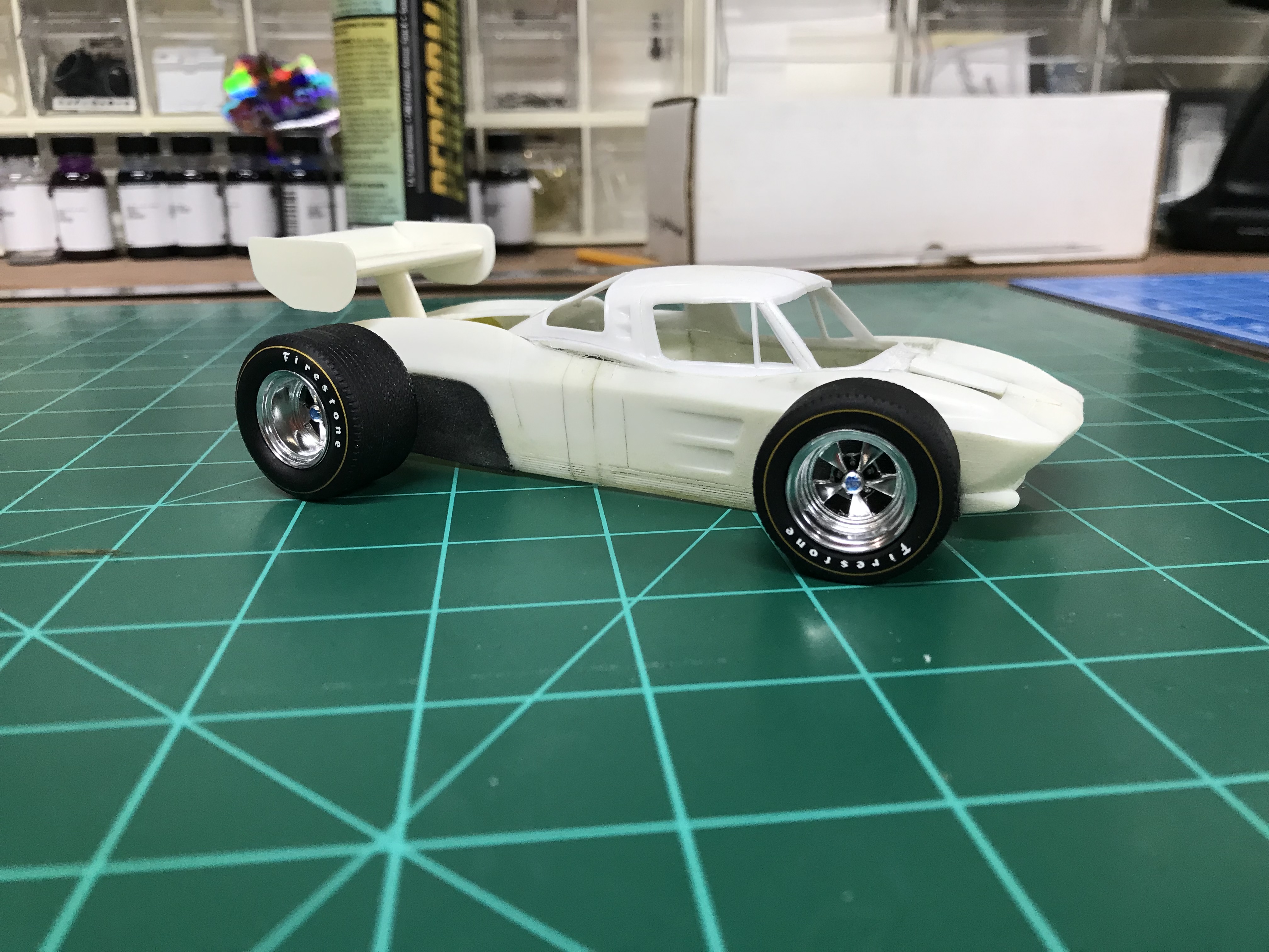 Impalow Posted August 27, 2021 Author Posted August 27, 2021 On 8/25/2021 at 8:29 AM, David G. said: Nice work so far! By the proportions, it kind of looks like it should be a rear/mid engine car. I can easily imagine a big ol' blower sticking up in front of the wing. Or at least an air intake of some kind. David G. Oh yeah mid-engine for sure!! Im planing on a 348/409 with the uneven fuel injector stacks coming through the split window! I got the bottom of the body cut off at an angle so that really helped the proportions. Then I grabbed the engine from the revell 58 impala, and the transaxle from a penske pc-8 indycar and started working out the packaging. 3