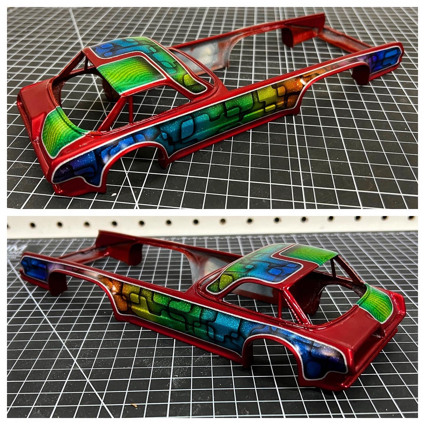 Impalow Posted February 16, 2022 Author Posted February 16, 2022 Remember this thing? I finally got back to the bench last night! Got it masked (again...?) I swear I have masked and unmasked this thing so many times now...haha. I had some extra time before bed so I did the little contrast-y panel on the front and top. I used old leftover fingerprint vinyl masks from my Gremlin, then sprayed Splash Paints Kandy Green. Then I removed the mask and sprayed Kandy yellow, Kandy green and Kandy Teal working from the inside out Splash Paints Kandys Hopefully getting the rest of it painted this week! Then finally no more masking... just BMF ?? 3