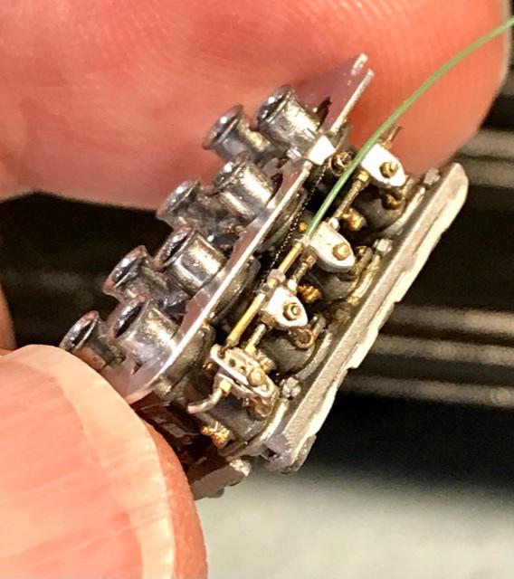absmiami Posted September 13, 2021 Author Posted September 13, 2021 The throttle wire and return spring attach to the last segment of the throttle link - at the back of the carbs …. Used the .011 green line for the throttle wire - glued to a section of .018 tube - the return spring is stretched from a MFH accessory spring package with a length of .006 brass wire running thu the spring and used to attach the spring to the tray and the last carb link - close as I can get to scale parts …. randy Ditton could probably make this functional - no thanks …