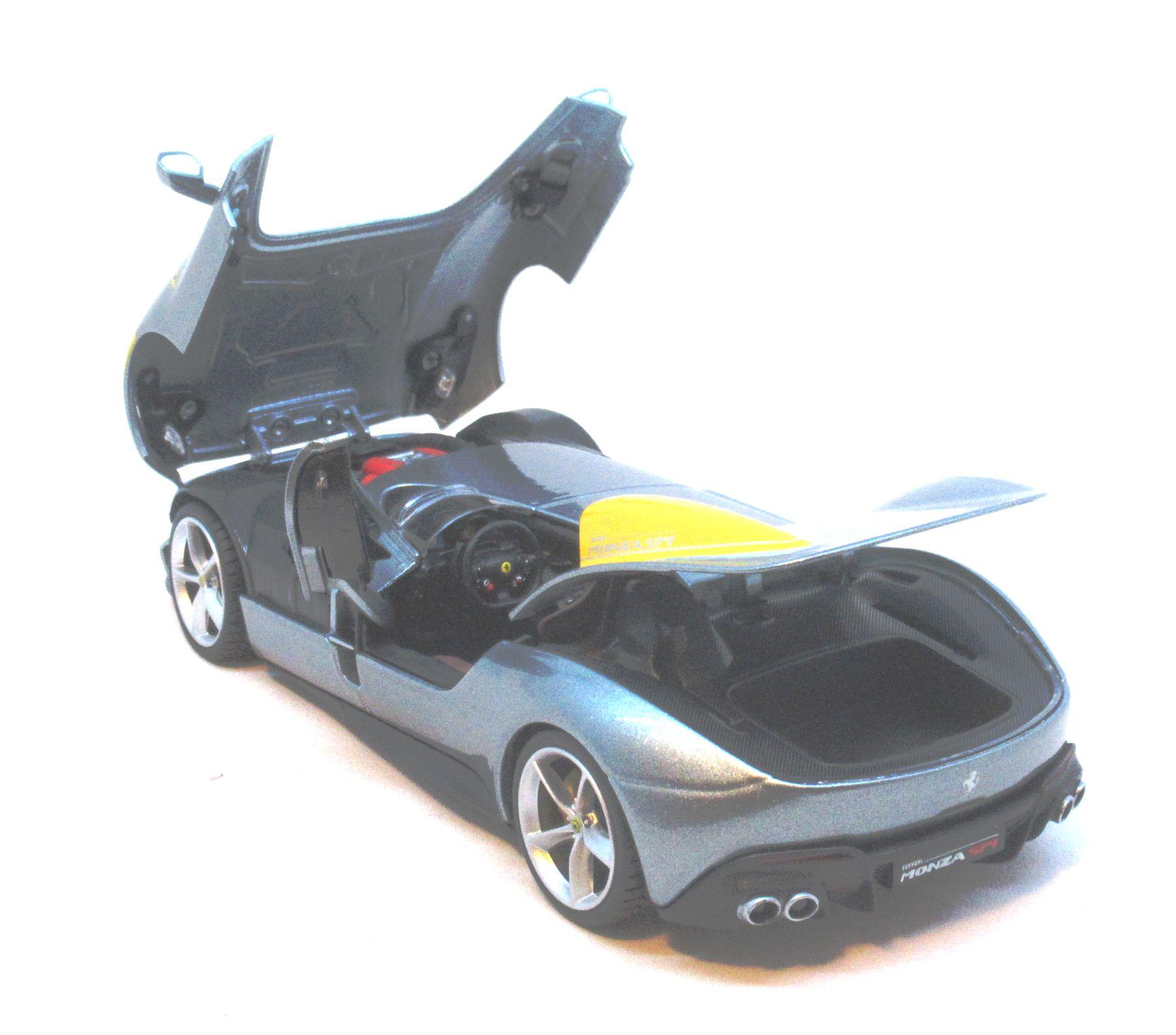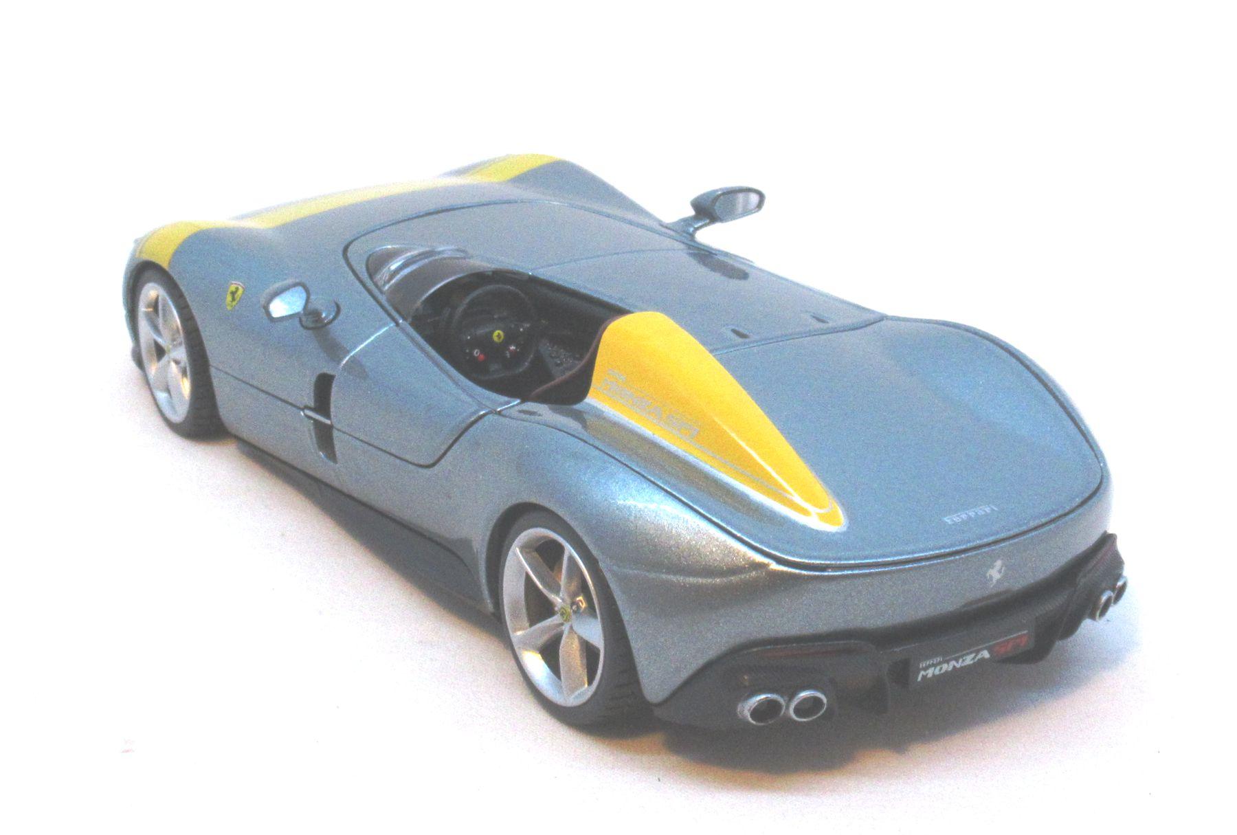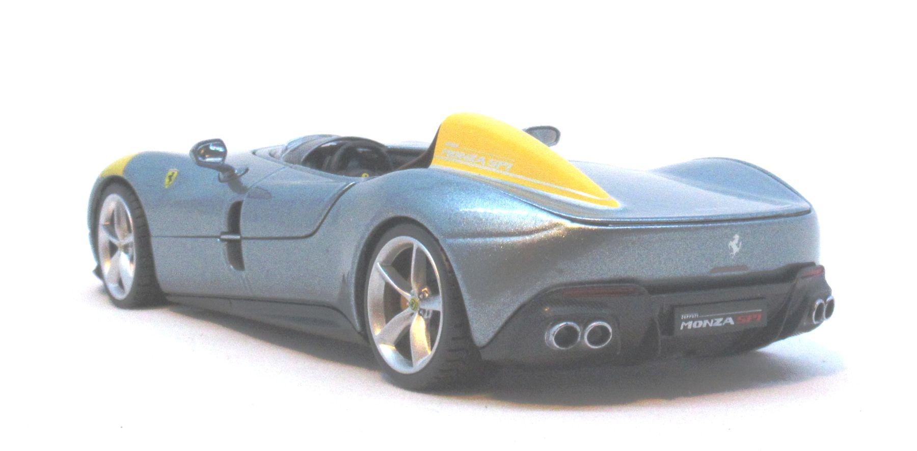 caapa Posted October 2 Author Posted October 2 Ferrari Monza SP1 2019 The Monza SP1 is a celebration of Ferrari's racing heritage, specifically its open-top sports cars of the 1950s. It is the first model of Ferrari's new "Icona" series, a limited-production, single-seat sports car. The base is mainly the 812 Superfast, the 6,5 liter powerplant with 799 HP, the seven-speed dual-clutch transmission, the dashboard, etc. are from that. The top speed is a tad less than 360 km/h, acceleration to 100 km/h in less than 3 sec. The body design follows the 1950s „barchetta” layout – it means roof-less. A unique "Virtual Windshield" system uses airflow to create a buffer of air over the driver, mimicking the effect of a traditional windshield. But probably better to deside you use very fashinable sunglasses or goggles or a helmet with face-shield. Ferrari has thought of everything – the Monza comes with its own accessories. Cap, scarf, handshues and a Ferrari branded helmet made of carbon fiber. Only 499 units are produced, for $1,75 million each, without any extras and accessories. And no owner could buy more than one ! The model is made by Bburago in 1:64 scale. Enjoy the pictures.