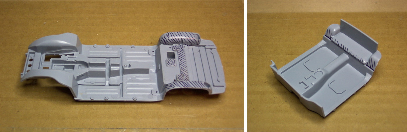 TooOld Posted January 24, 2022 Author Posted January 24, 2022 Working on the interior this morning . Here's the parts from C1 , all very cleanly molded with no clean up required . Also included is a left-hand dashboard , correct mirrors , and a nice PE set . Note the folding rear seat . The modification to the Aoshima parts require the removal of the shaded areas on the chassis plate and removing the rear portion of the interior . I started to use a razor saw but switched to my Dremel , more clean up but it's so much quicker . Here's the interior taped together and sitting on the chassis . I slipped everything into the body and it fits beautifully ! Other than cutting the windows out of the supplied sheet that's all there is to the conversion . . . very very simple ! 1