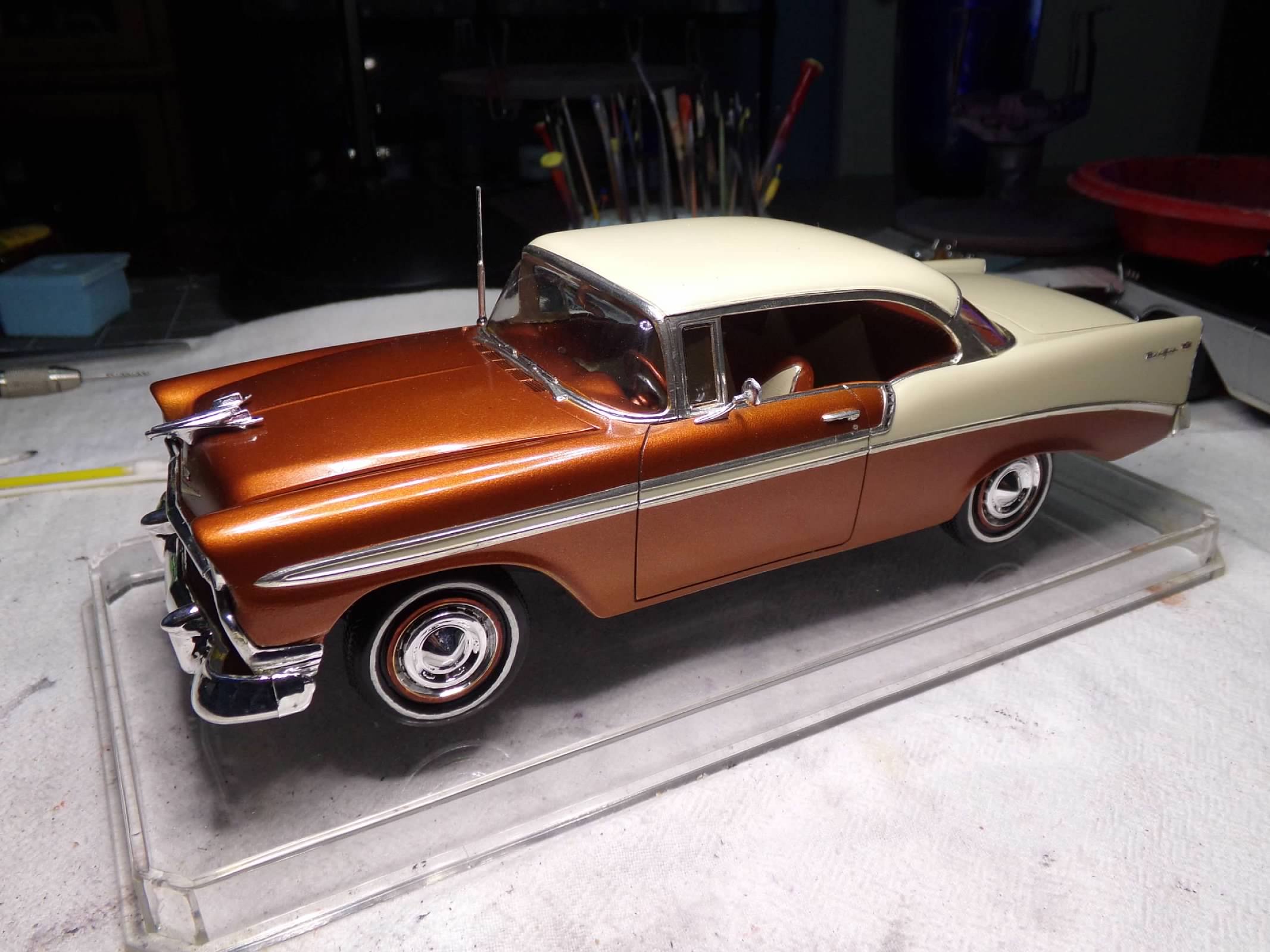 ModelcarJR Posted December 15, 2022 Author Posted December 15, 2022 (edited) Very Interesting, Jerry. Looks like the old red, white and blue box from the 80s. I couldn't find it on Model Roundup but did find a Revell Germany kit called 1956 Chevy Custom that is the same kit for $42.90, plus shipping. For the price you paid you should go back to Ollie's and find as many as you can for that price! and any others! Merry Christmas! I've added a photo of this kit that I built several years ago. Its MCW Classic Copper in lieu of Sierra Gold and Krylon Satin Almond to substitute for Adobe Beige, inside and out. I've also added PE from Model Car Garage. One of my favorite builds! Edited December 15, 2022 by ModelcarJR add photo