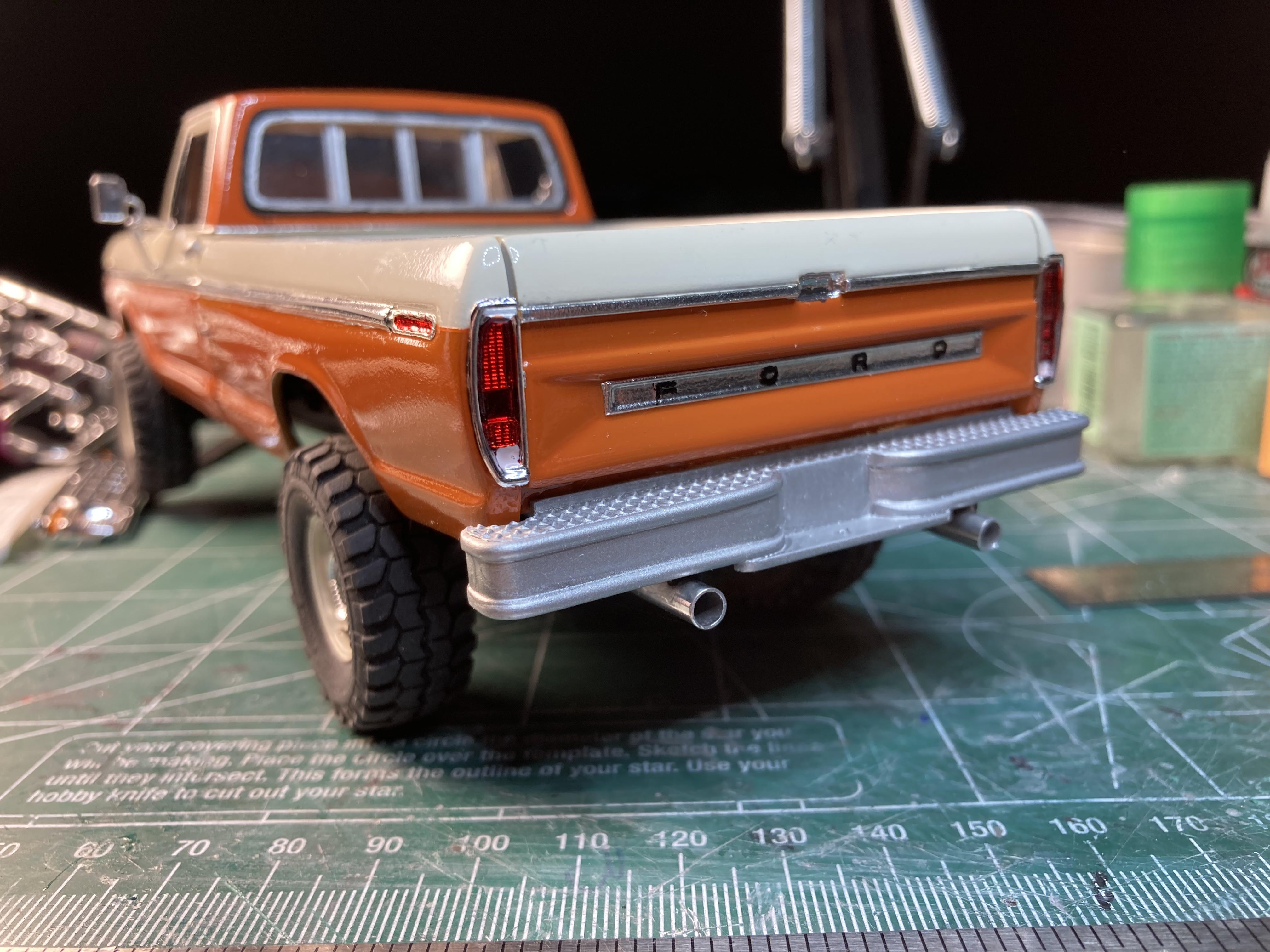 Mercuryman54 Posted July 7, 2023 Posted July 7, 2023 (edited) 1978-79 AMT Firestone Ford pickup cab and interior, Moebius 1972 Ford F-250 4x4 frame, suspension and drivetrain. Unknown manufacturer resin standard wheelbase bed (swap meet find). My own casting of an original AMT 73-75 Ford pickup grille. I added the bedside toolbox. Fireball Modelworks wheels, tires and hubcaps. Edited July 7, 2023 by Mercuryman54 added content 8