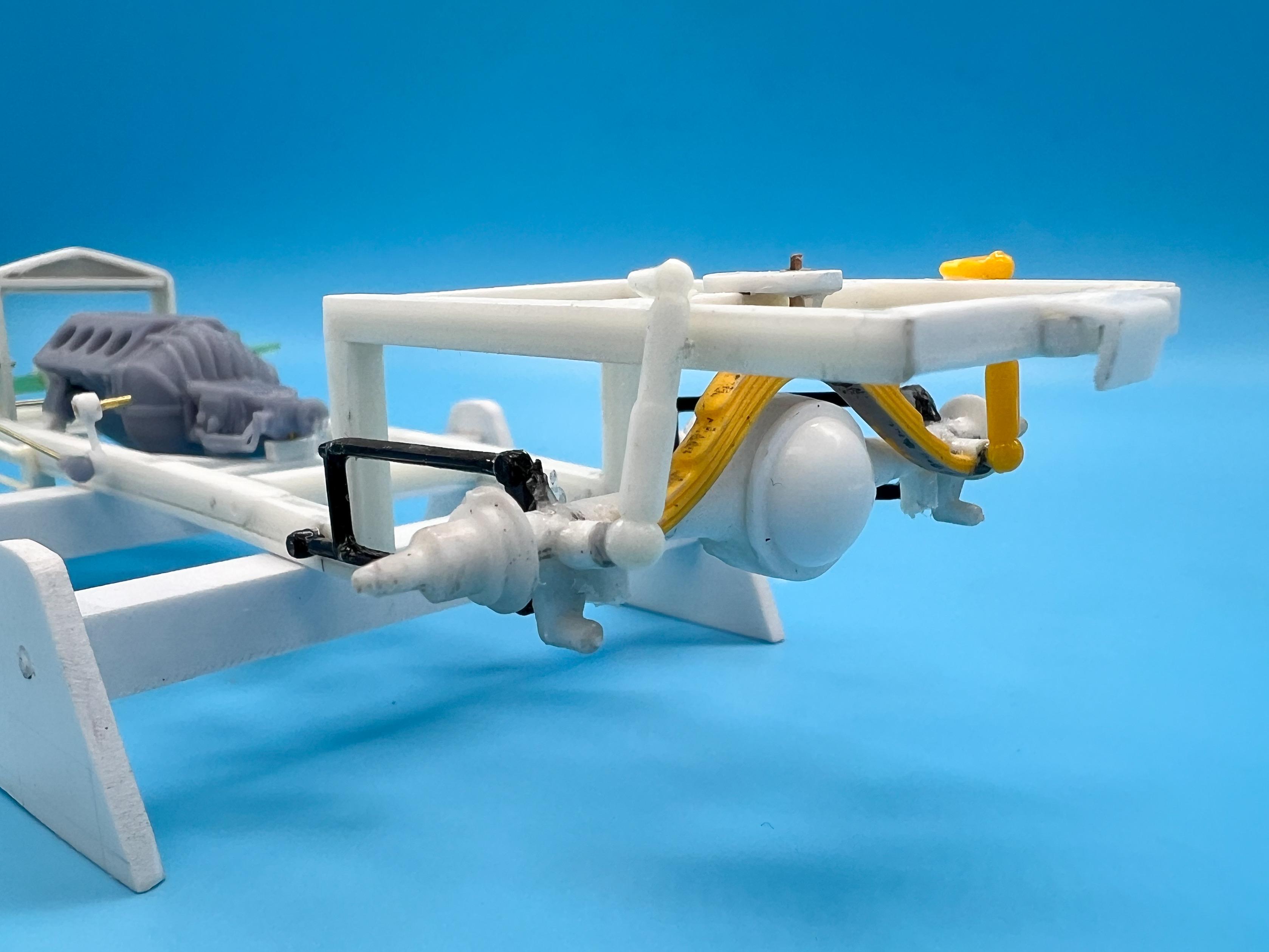 OldNYJim Posted October 30, 2023 Posted October 30, 2023 (edited) I picked up a bunch of Monogram Black Widow parts on eBay a while back to piece together a nice stock build, plus a detailed-up version: I’ve got some little background projects to do on that (I want to redraw the original decals and improve on them a little, for example, and source a couple of pieces) but in the meantime I started daydreaming about a much more extreme version using the same parts, loosely. Just how low and mean and extreme looking of a hot rod can I make by hacking up the worst parts in my Black Widow parts stash? Quick mockup of some key components: I’m actually thinking a longer wheelbase and even LOWER if I can make it mechanically feasible, but I’m getting ahead of myself in the story here… First up, selected the worst body of the bunch…it’s actually not bad, but has some glueblobbery and made a mess of my photo booth: A wash in my ultrasonic cleaner followed by some cleanup and we have a less smelly and dirty starting point: Still needs a little work but good enough to get rolling…as you can probably see I removed the bed too so I can drop the body nice and low and get a heavily zee-d frame up in there. Something like this probably: Lots to do on the frame obviously, and I suspect that lazy laid-back zee wouldn’t be idea in a real world scenario with the angles, but it DOES allow the body to drop right in place and retain the kit bench seat: As you can see, I’ve printed a coupla three parts…the kit engine (complete with no transmission) wasn’t going to fly, so I printed a fresh new resin Small Block and tranny: And fabricated some simple motor mounts to lock it in place: Plus, referencing the kit design, a front axle with dropped spring: And something for the rear - not totally set on using the Quickchange but it’s ok for mock-ups anyway… Maybe a tri-5 Chevy axle would work well? Fits the time period… Only just getting going on this one so plenty of scratchbuilding and kitbashing and hacking to come…more soon, soon as I’ve done more! Edited October 30, 2023 by CabDriver 3