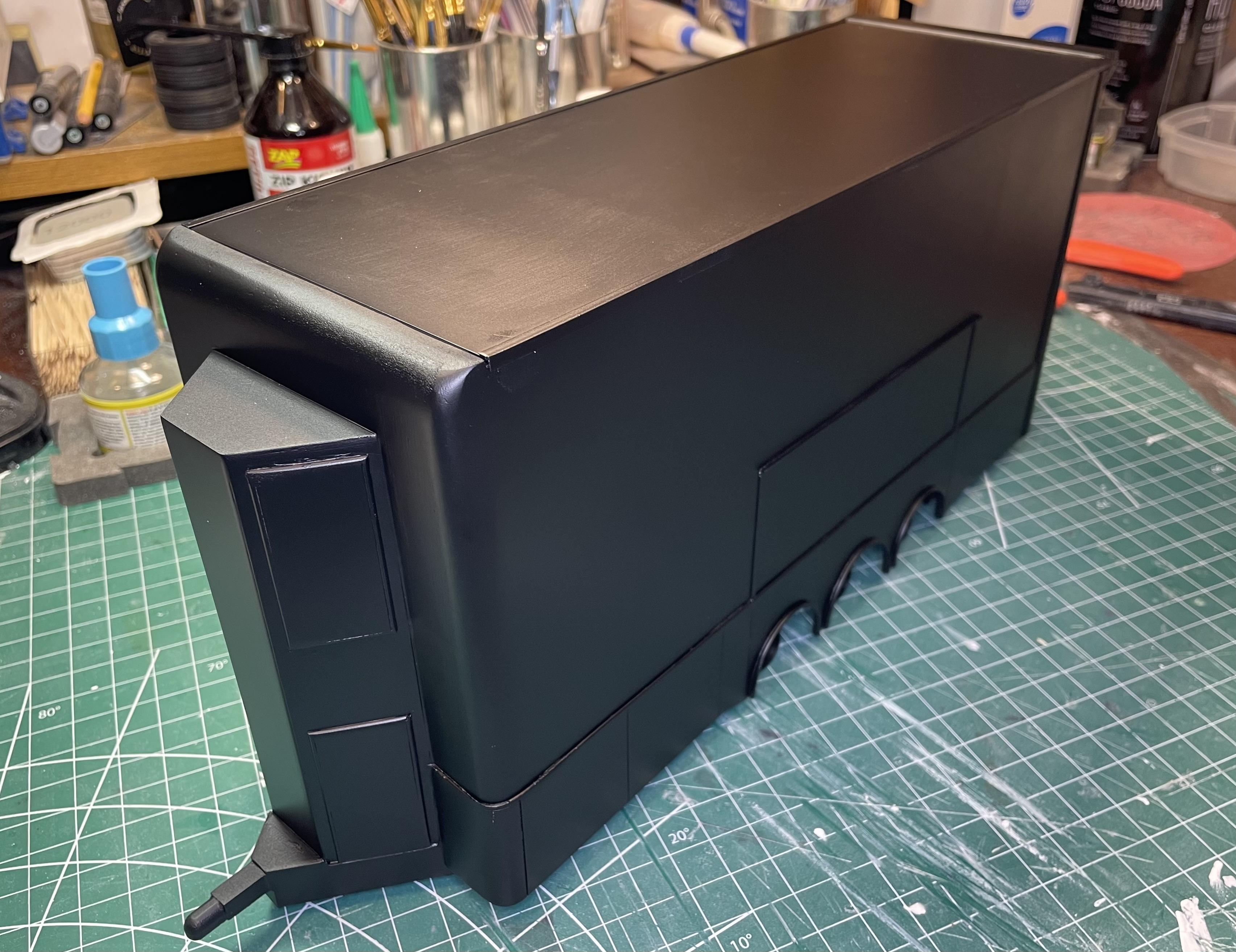 vincen47 Posted October 12 Author Posted October 12 (edited) I haven’t had a lot of time to dedicate to the project in the past month. But, I managed to get the body work done on the exterior of the trailer, and I was able to begin the process of laying down primer. There wasn’t as much filling and sanding as was on the coach body, so I was able to skip the heavier primers and go straight to Mr. Hobby Black 1500. As usual, the primer exposes small, but noticeable flaws that’ll need a little more work. However, just getting it into black, even if it’s primer, makes me feel like I’ve accomplished something. Edited October 12 by vincen47 4
