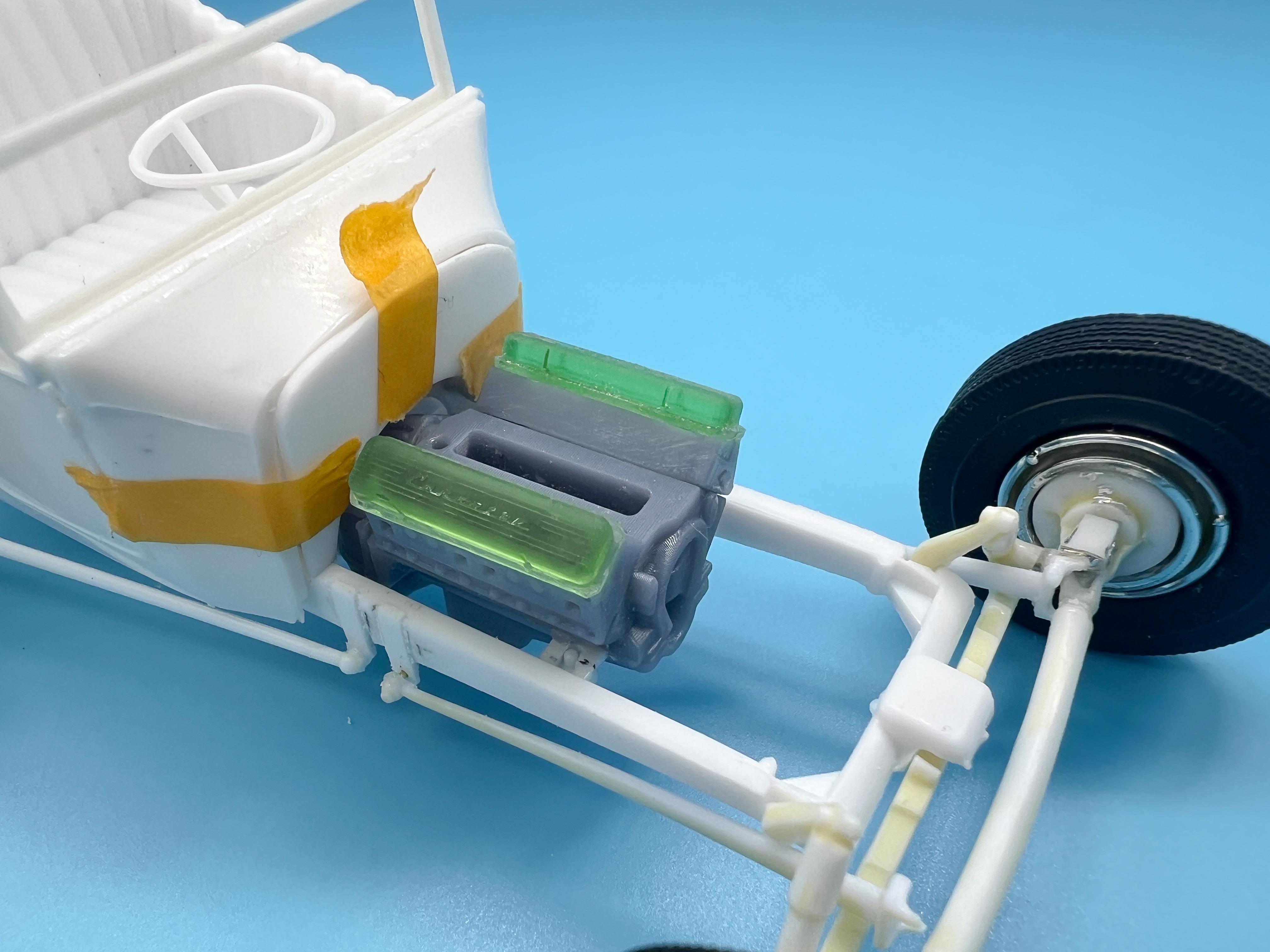 OldNYJim Posted March 10, 2024 Author Posted March 10, 2024 Thanks fellas! Got some more done on this over the past week or so… Figured out the headlamp situation…I really liked the idea of using the stock T headlamps, but cleaned up the installation somewhat by mounting to the grille shell… I didn’t like the chunky hairpin suspension linkages that came with the kit so I swapped in some from the Revell 29/30 kits…I REALLY wanted to find some AMT ones that would work but didn’t have anything suitable in my stash… Added some spacers to the frame to get the rear bed sitting where I wanted it, and added some mounting pegs to help locate it consistently: Got my holes in the right place! I wanted to use the upright-mounted steering wheel setup like the kit gives you, so I modified a Revell steering box and the kit pitman arm…replaced the plastic linkage with a more in-scale one and got that mostly wrapped up: As you can see, the kit steering wheel is pretty disfigured so I’ll have to mess with that a little still… Made a driveshaft out of some parts-box UJs and some thin-wall styrene tube: ‘Sketched in’ the start of the gas tank, and made a dash panel: I’d like to play off the idea of a dash that references the stock T dash, which has two gauges in a panel on the center - modified the custom kit dash (which has, like, 8 gauges) into something more modest: Found some early ‘Vette valve covers that I had printed a while back that would dress up this base-level Small Block Chevy nicely: And that’s about where she sits right now…plenty to do still - probably tomorrow I’ll handle the pedals and what I’d like to do with the taillights, but it’s coming along ok! Thanks for looking; more soon, soon as I’ve done more! 8