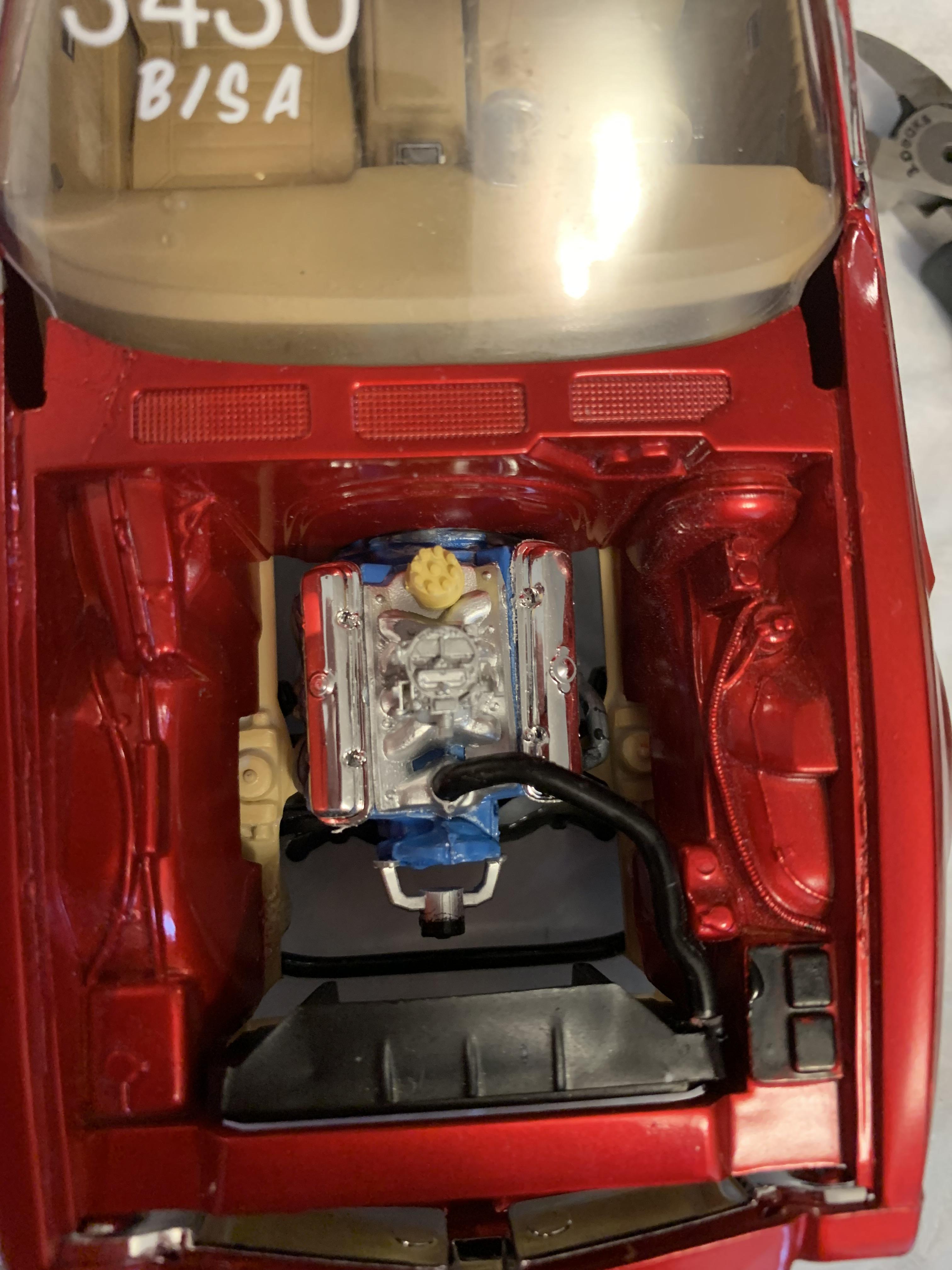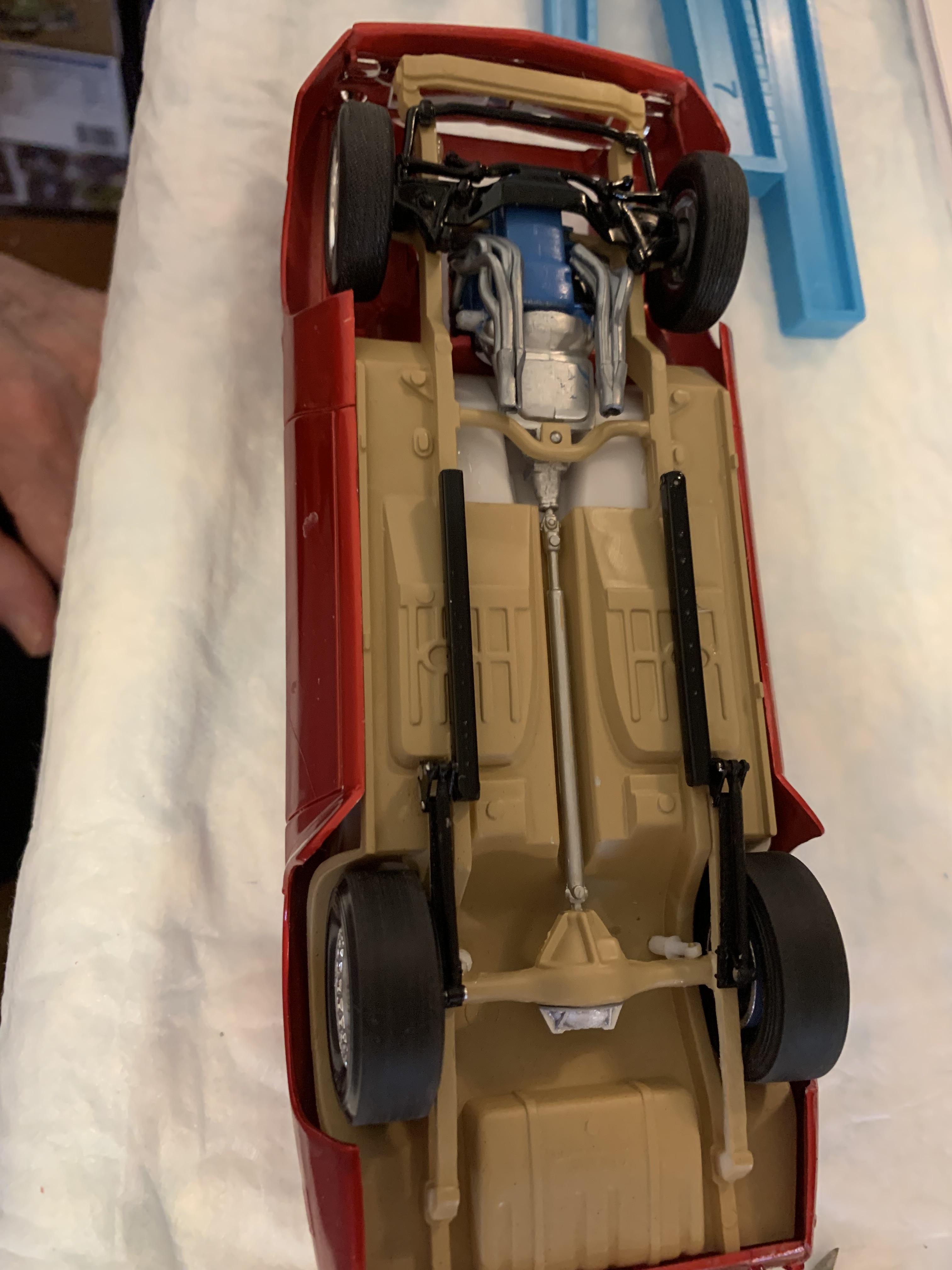 R. Thorne Posted February 12 Author Posted February 12 13 hours ago, keviiin86 said: Looks like a nice finish! Just out of curiosity why the odd color paints on the chassis and not typical chassis black or body color? Is that the color they painted it on the real car? Good question. These are considered race cars, not restored cars, so some leeway is allowed in paint colors. You can paint it any color you want. On all the 1:1 race cars I have had, I have always painted the chassis/undercarriage a lighter color in order to show up any oil, trans, and rear leaks. Discovered some runs on the passenger side that will have to be fixed. One of the disadvantages of using a clear red. Painted the engine blue after masking the trans off, touched up the dash due to some overspray from painting the body. Glued the differential cover on and installed rear and front suspension. 1