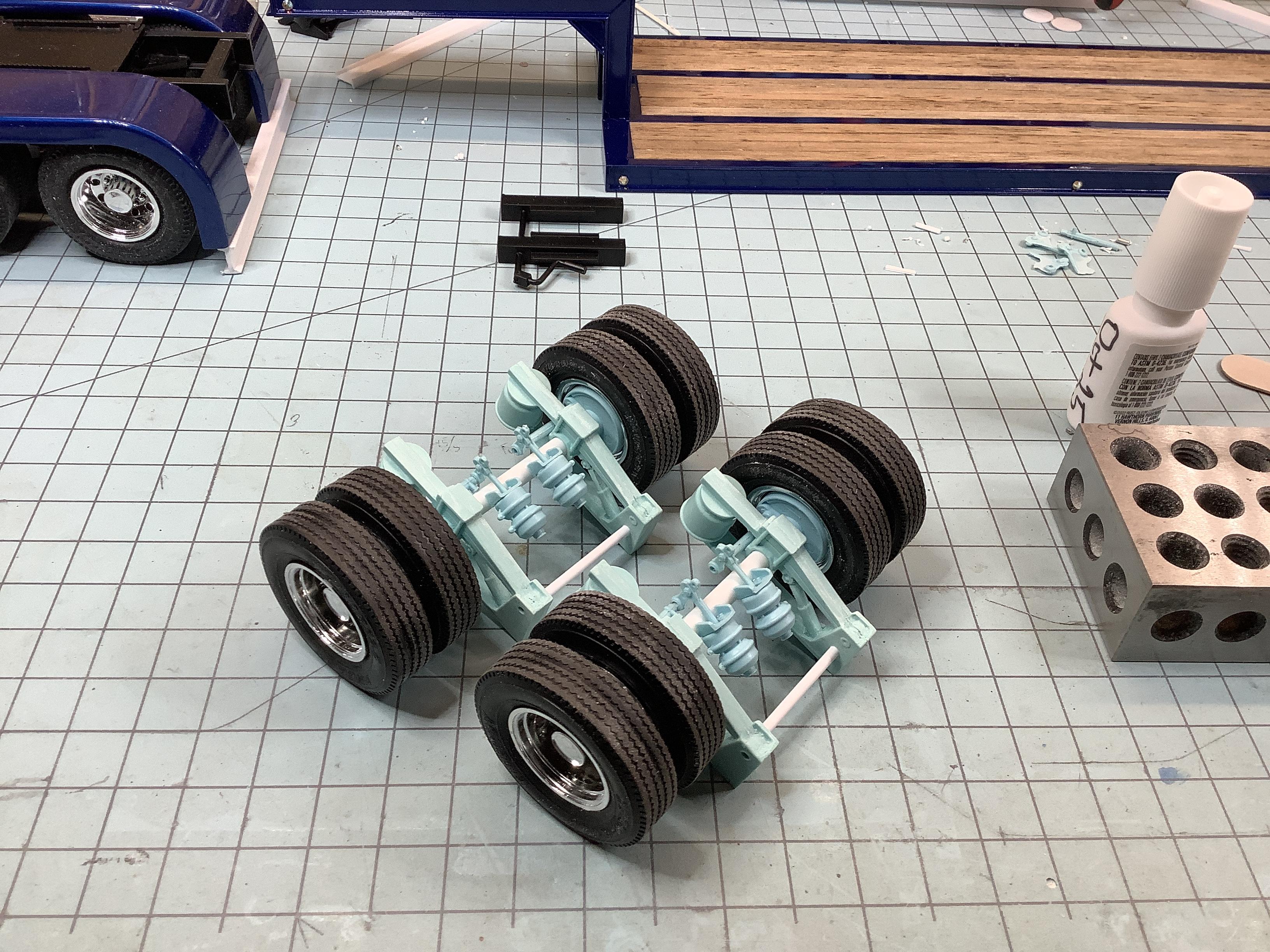 Gary Chastain Posted 9 hours ago Author Posted 9 hours ago Trailer axles built, I really like the Auslowe trailer brake kits, nice detail. Ready for paint. 1