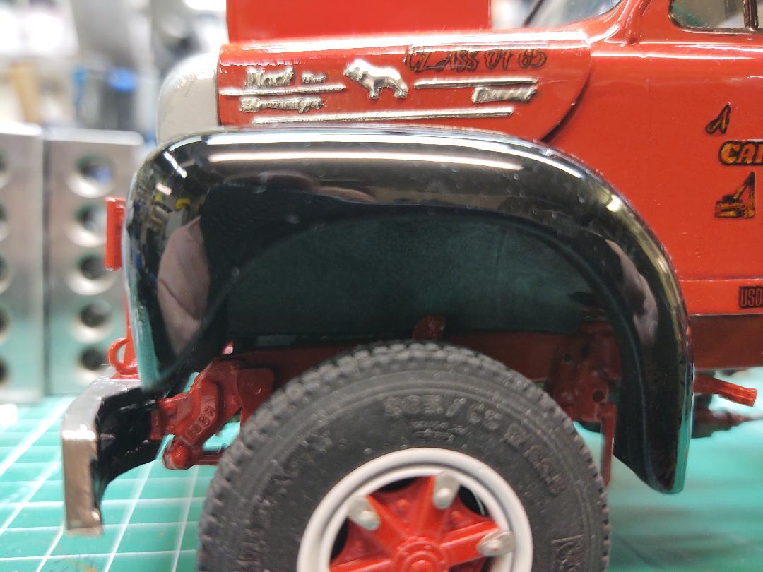 Scott Eriksen Posted May 31 Author Posted May 31 Cab is one with the chassis, started exhaust system,pass side mirror and fuel tank on, attached front bumper ,I did that with BMF so I can hold that if need be instead of the grille/rad shell .Did the "gold leaf" decals for the red panels that will go on the dump body .I'll do the cab signal/head/marker/park lights and air horns last 6