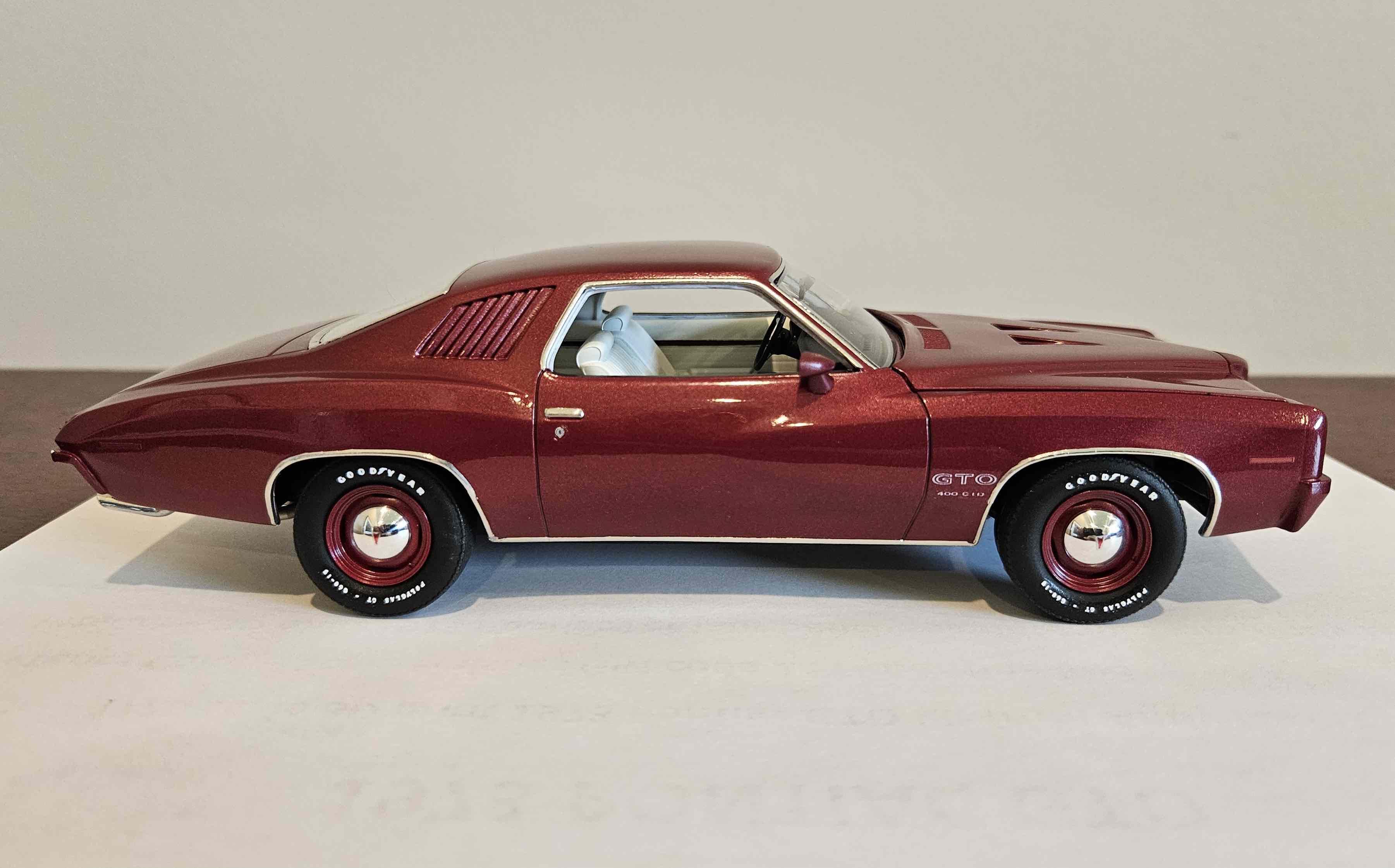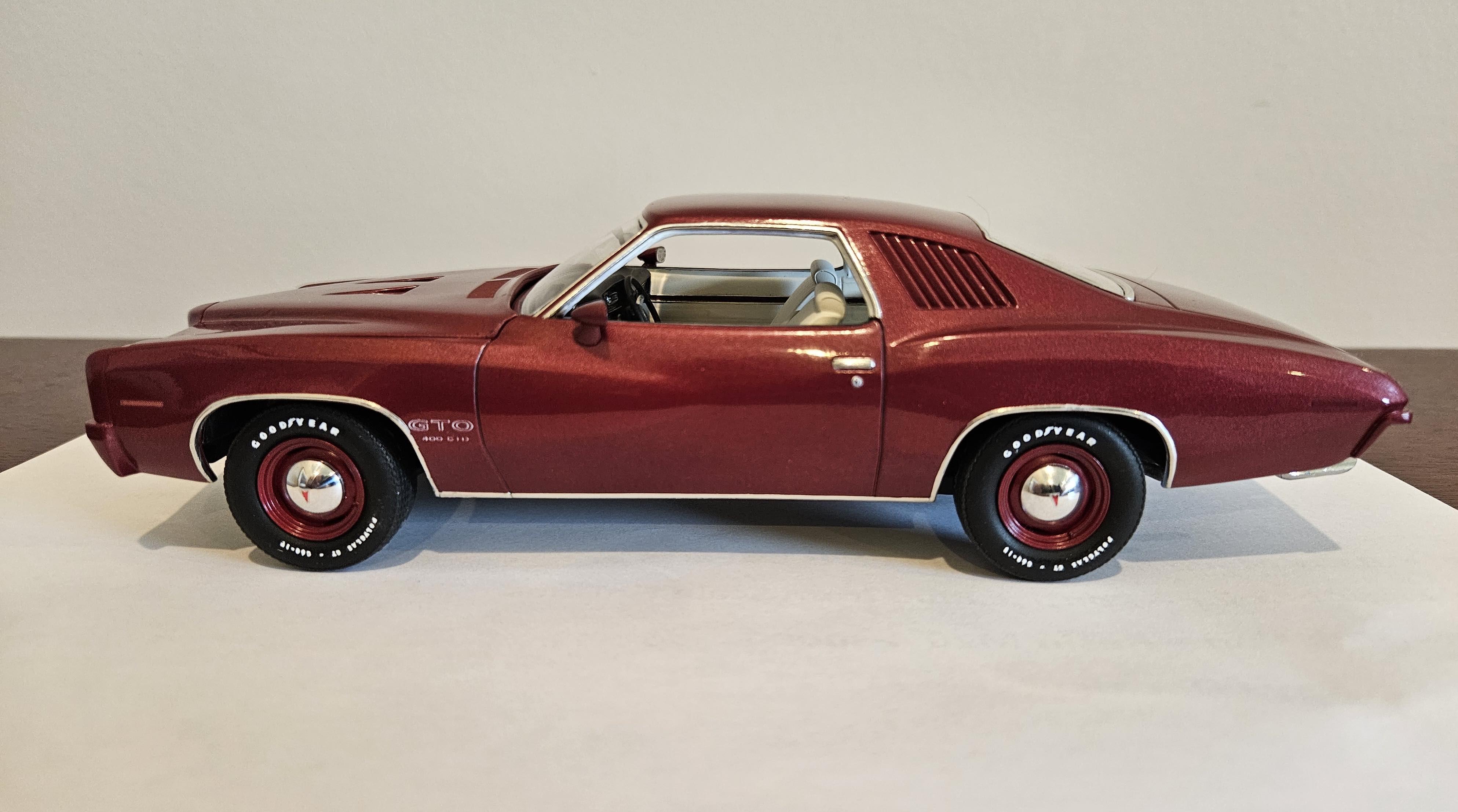johnwitzke Posted September 7 Author Posted September 7 Some small details being added to the body including all decals and taillamp detail. Since it appears the 73 Super Duty GTO was not assembled on the assembly line like the 73 Super Duty Grand Am, it is unclear if a SD-455 decal was on the body. So I removed it and added a 455 CID decal. The photos I have of the possible car doesn't appear to have the SD 455 decal. This Super Duty GTO and the Super Duty Grand Am were the only two factory cars with the unique Ram Air set up. Unfortunately, both of these cars were dismantled and destroyed by Pontiac. On a side note, I will be building a second 73 GTO, that Hi-Performance cars magazine identified as the Super Duty car. The second car was Valencia Gold with white bench interior with a M20 4-speed manual transmission. So, there are two possible colors for SD 455 GTO. Was the car Florentine Red as mentioned by Joe Oldham memory, or was it Valencia Gold as the magazine calls it out. Either way, I am building both to make sure I have a replica of the 1 of none 73 Super Duty GTO. Oh, I did have the Michigan Manufacture license (13M 251) plate made. Additionally I have a 1973 Grans Am that I will build as the 1 and only SD 455 Grand Am. I am waiting on decals. The colors and options for the Grand Am is know as there is a build sheet for the car. 4